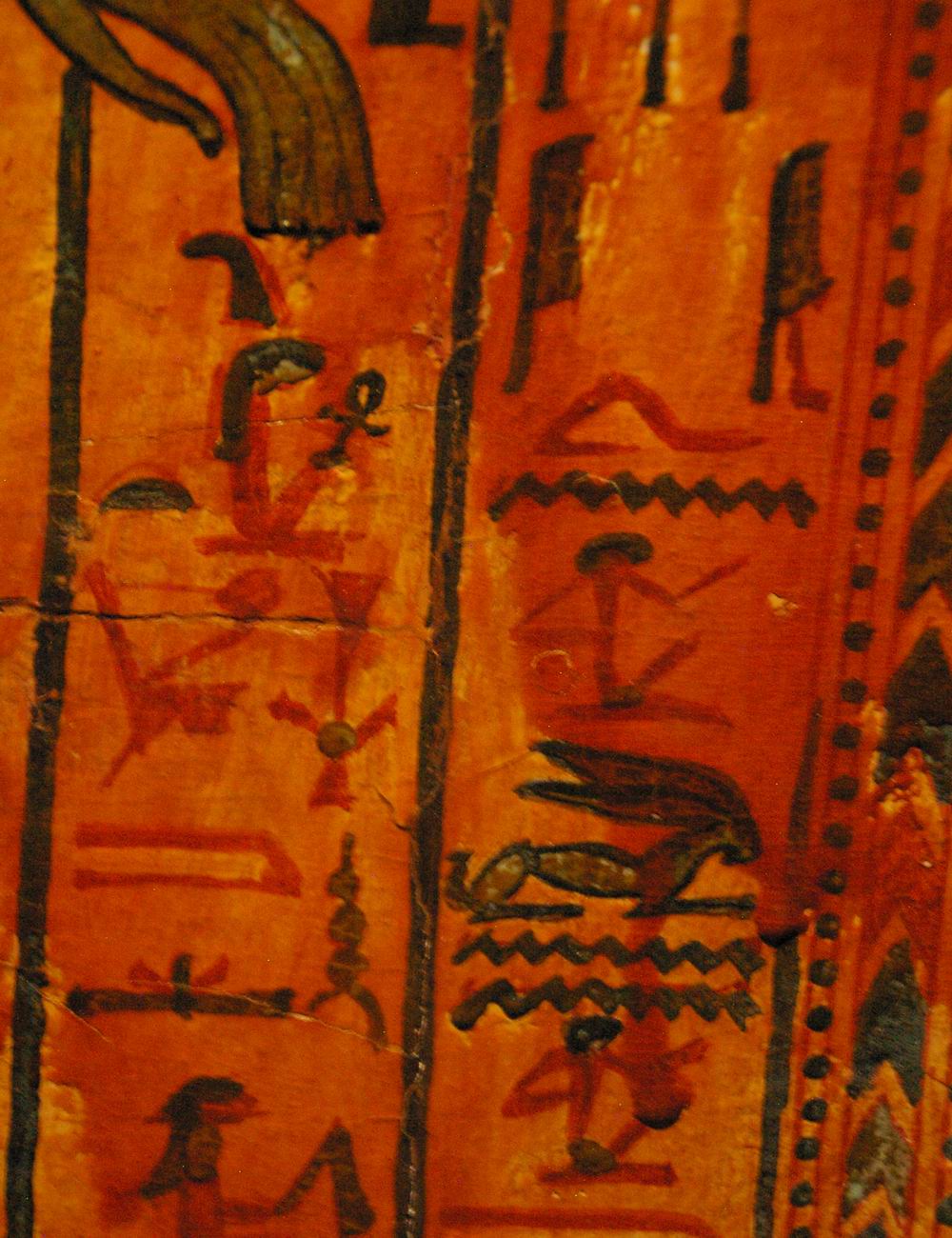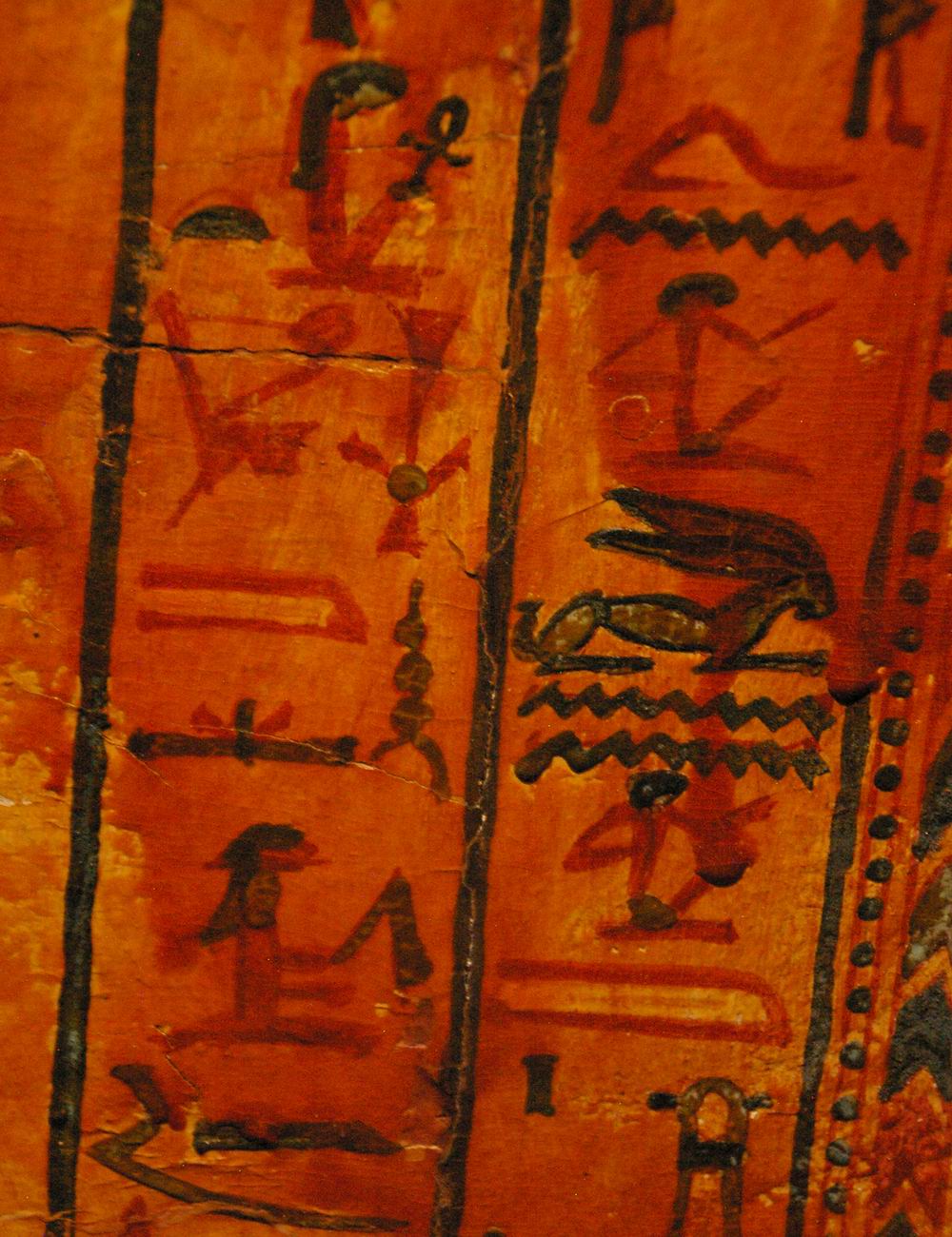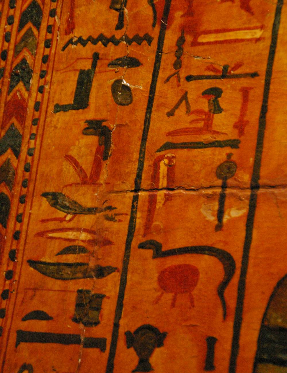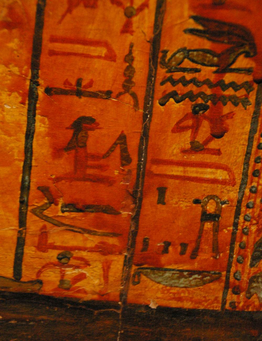 et est décoré de textes funéraires. Il est en bois enduit et peint. Il mesure 2,58 m de long, 1,32 m de haut pour 92 cm de large. |