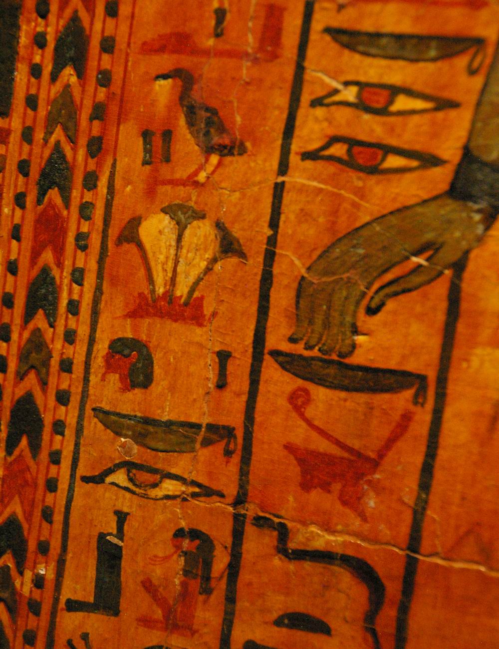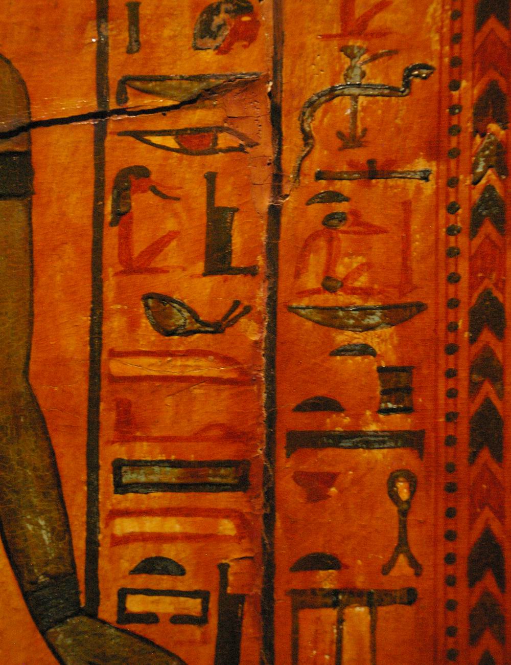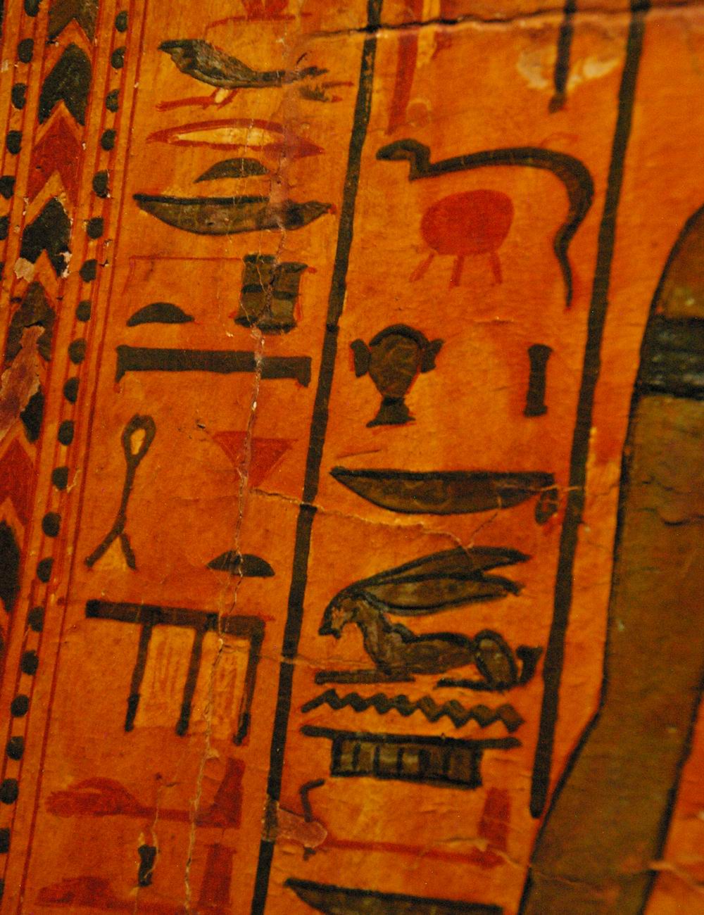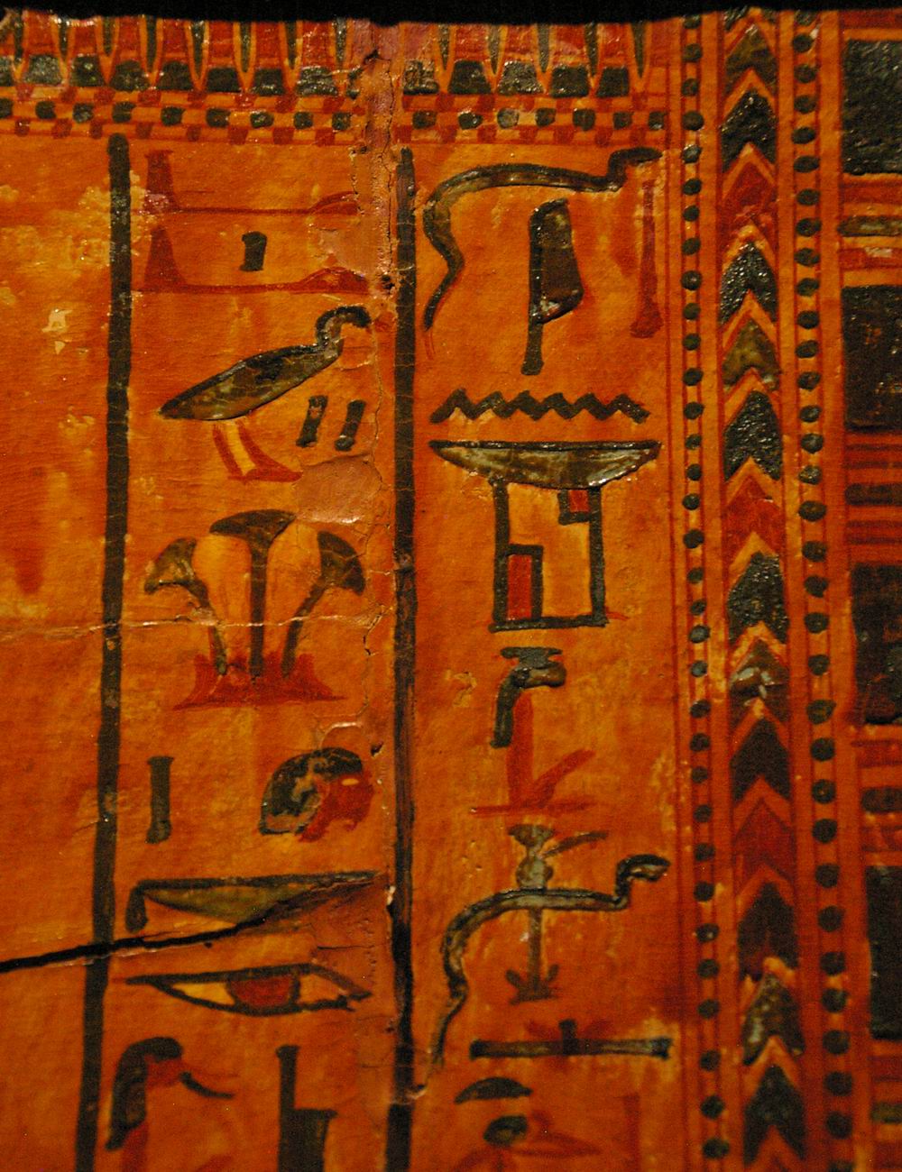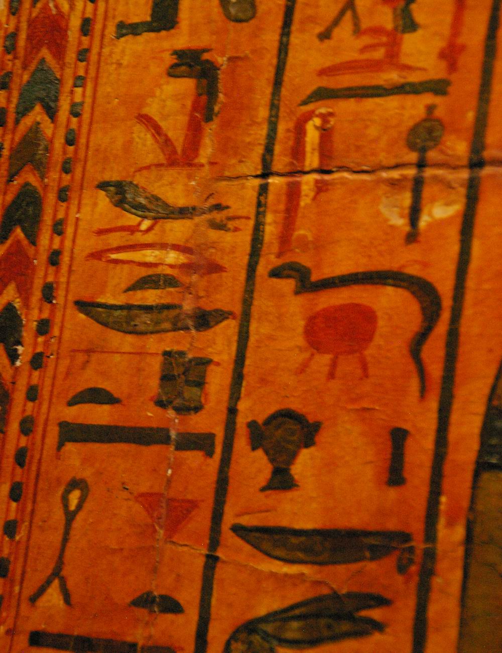 et est décoré de textes funéraires. Il est en bois enduit et peint. Il mesure 2,58 m de long, 1,32 m de haut pour 92 cm de large. |