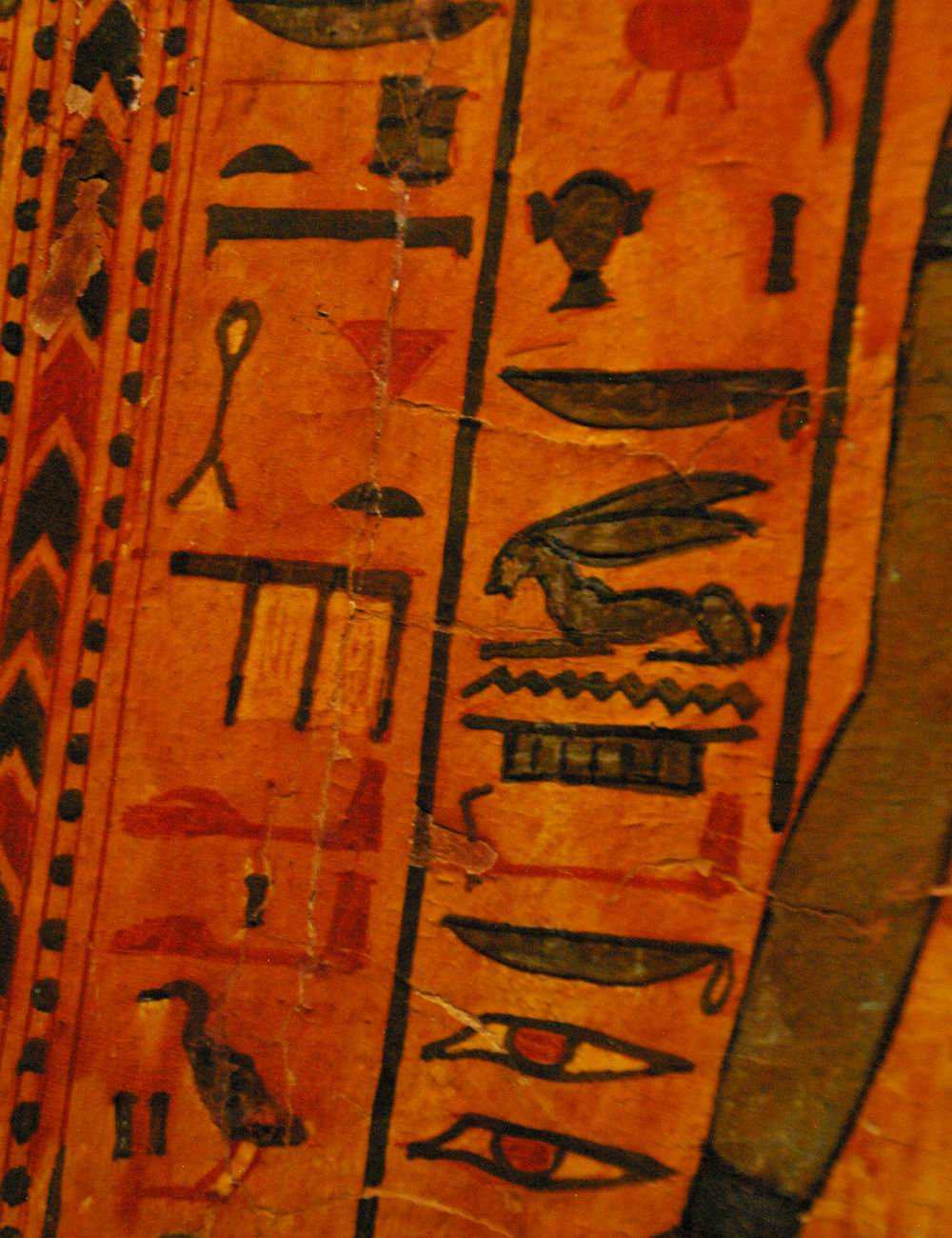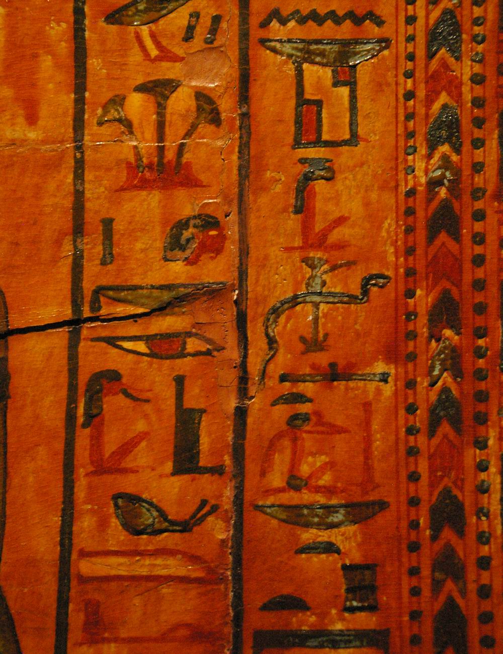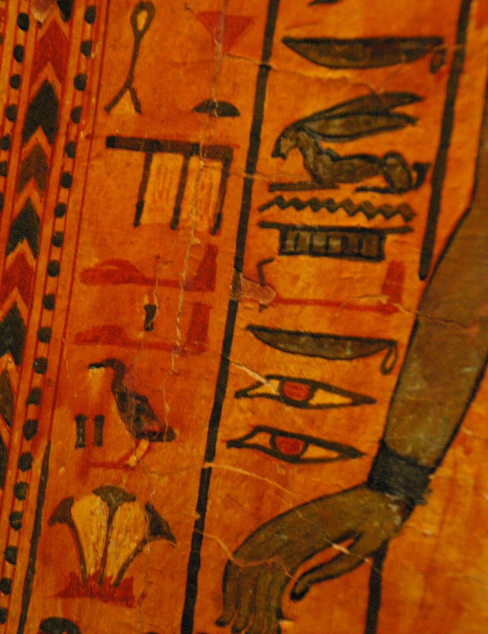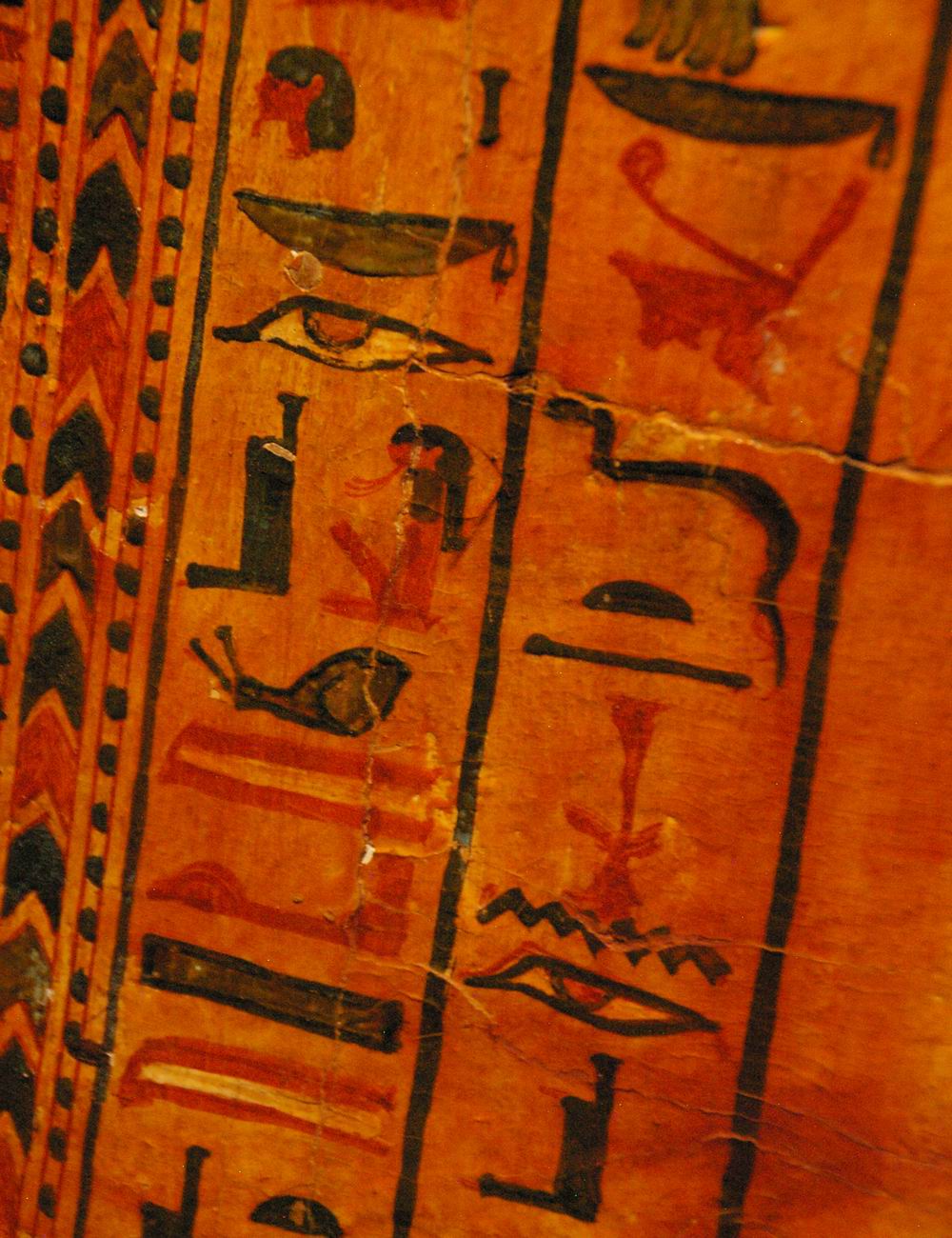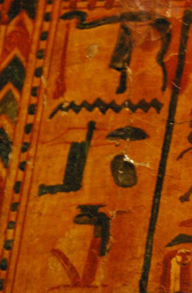 et est décoré de textes funéraires. Il est en bois enduit et peint. Il mesure 2,58 m de long, 1,32 m de haut pour 92 cm de large. |