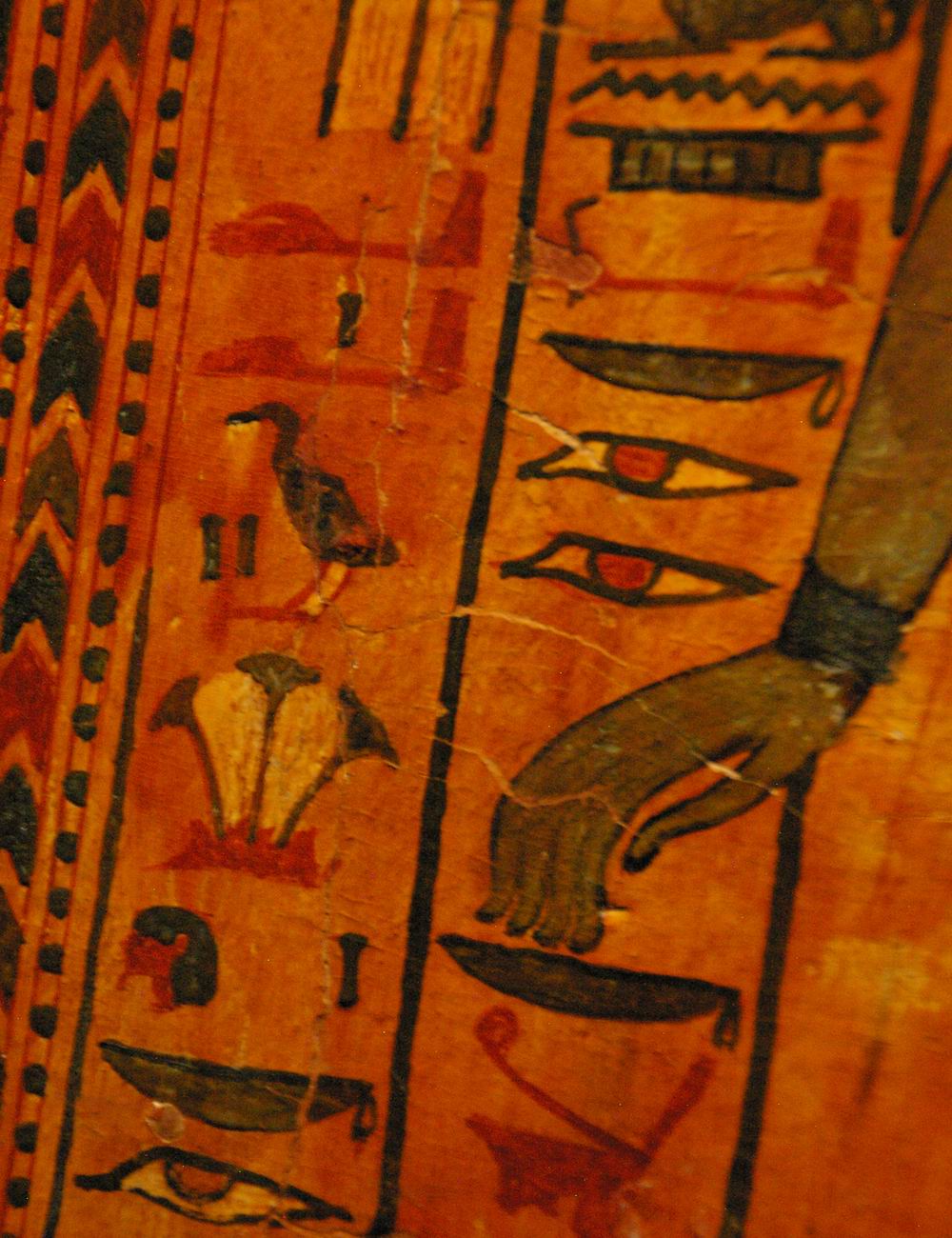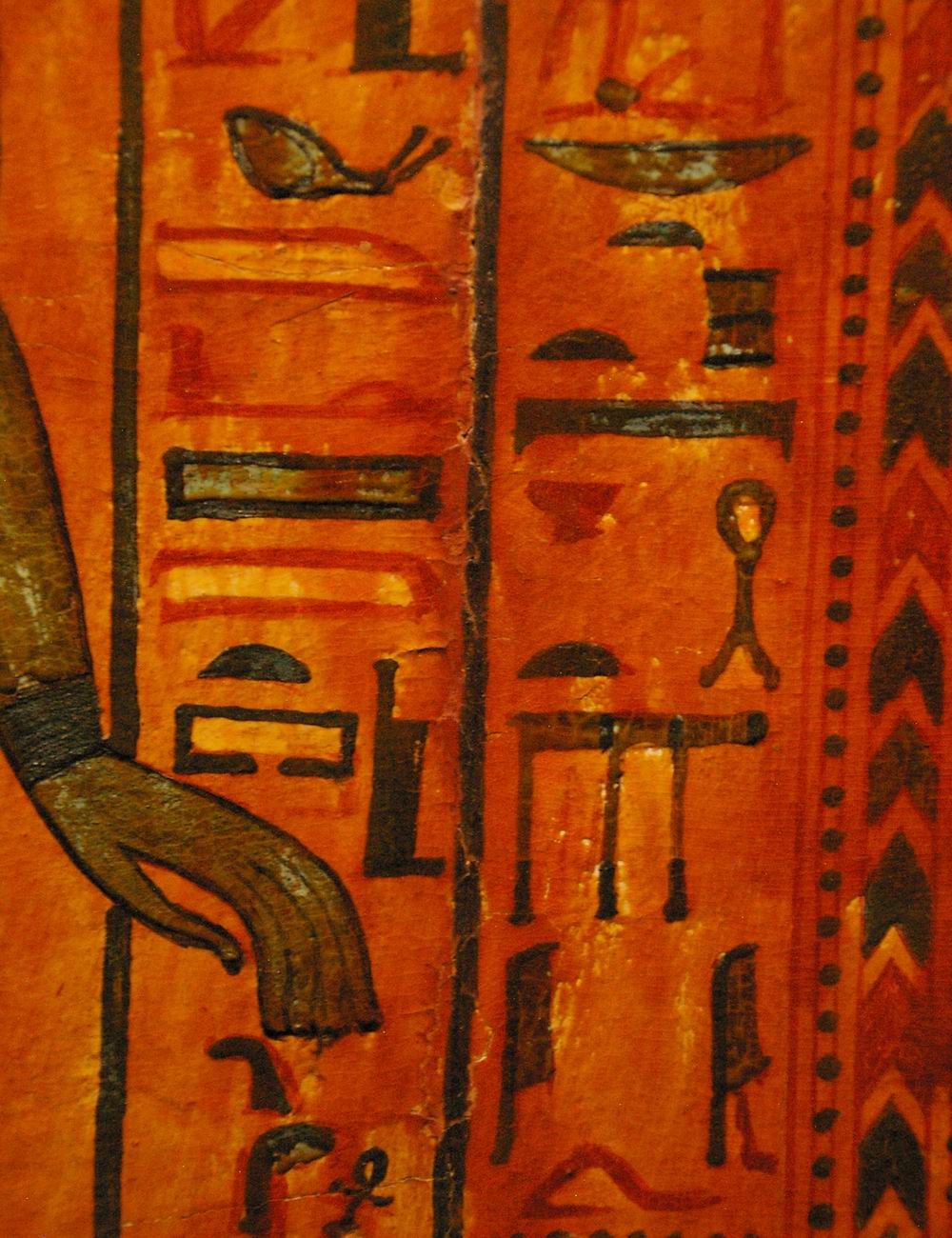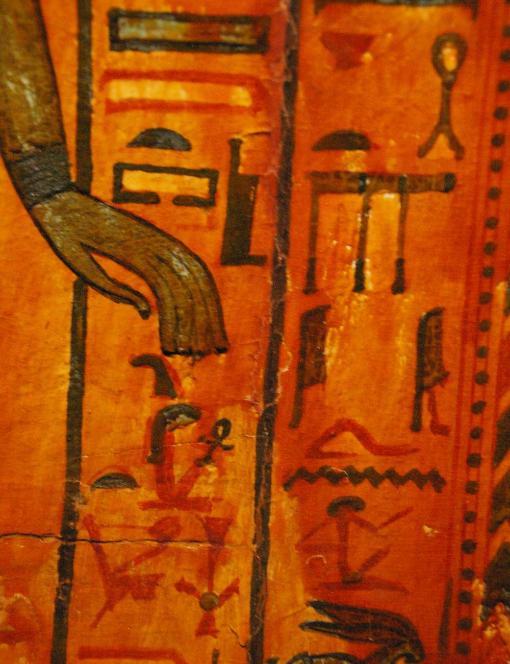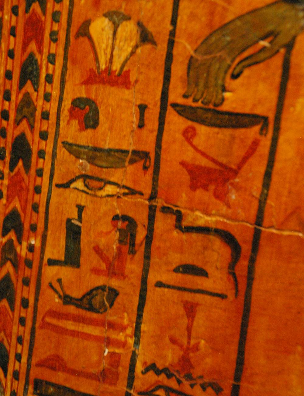 et est décoré de textes funéraires. Il est en bois enduit et peint. Il mesure 2,58 m de long, 1,32 m de haut pour 92 cm de large. |
