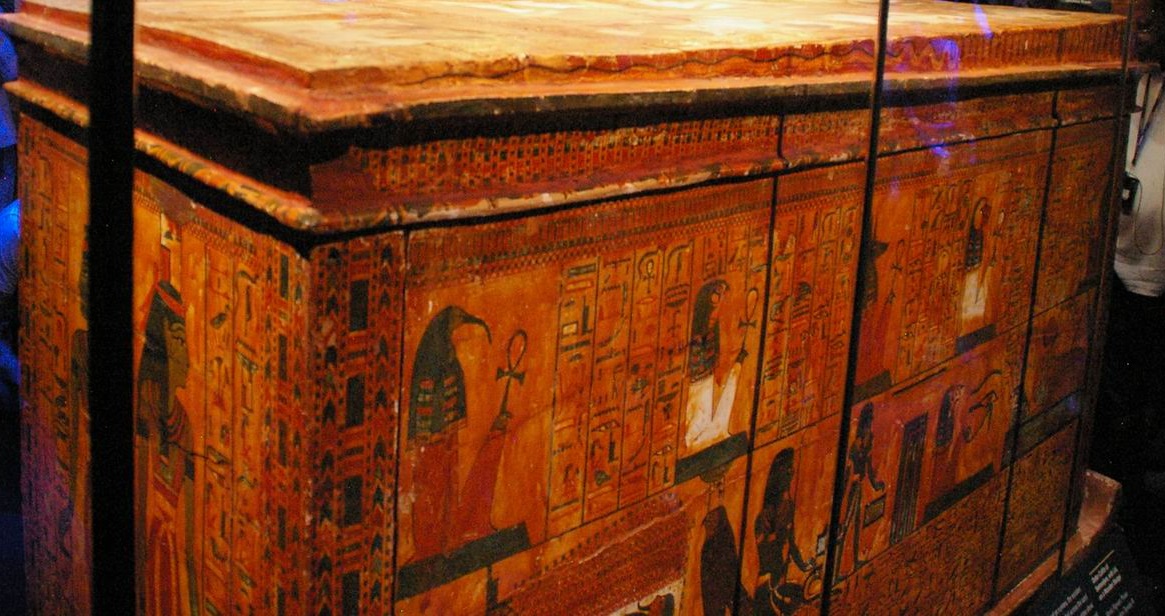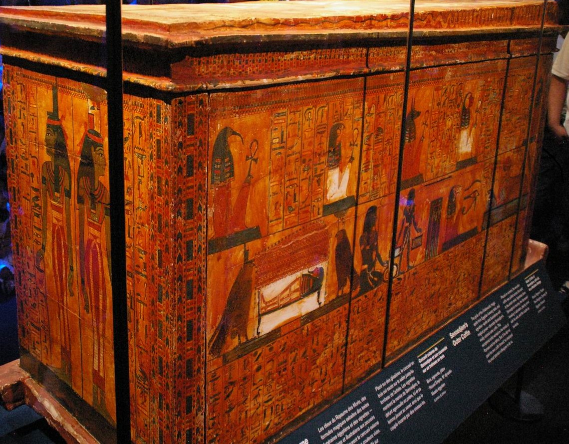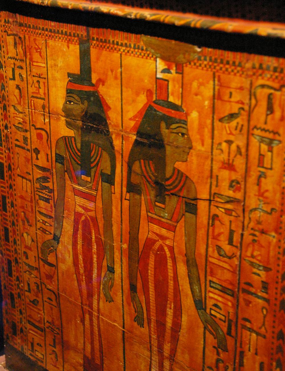Cercueil de Sennedjem. La tombe de Sennedjem fut découverte intacte à Deir el-Médineh. Sennedjem travailla sans doute dans la tombe de Séthi Ier et peut-être dans celle de la reine Néfertari. Le cercueil est posé sur un traineau. |
