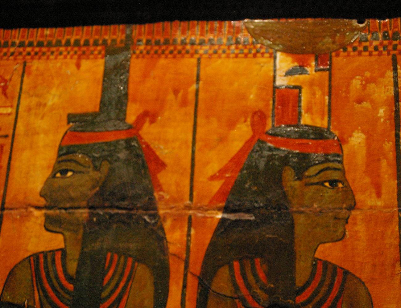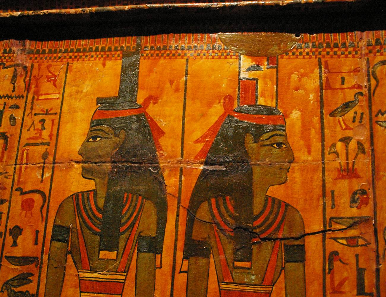 | A gauche la déesse Nephthys, à droite la déesse Isis sous la forme d'un milan et le dieu Thot, à tête d'ibis. | ||