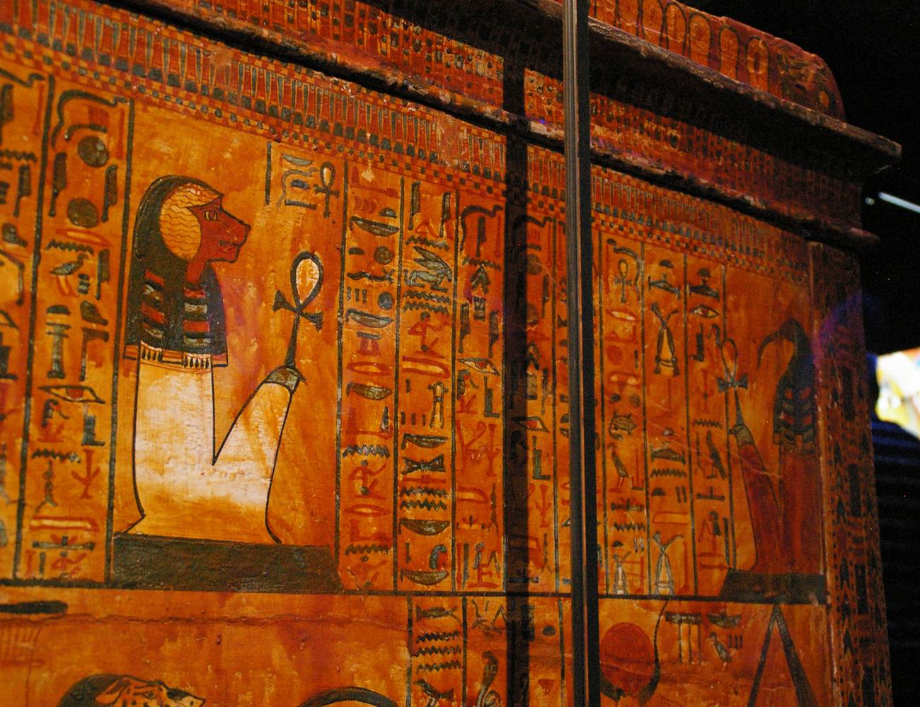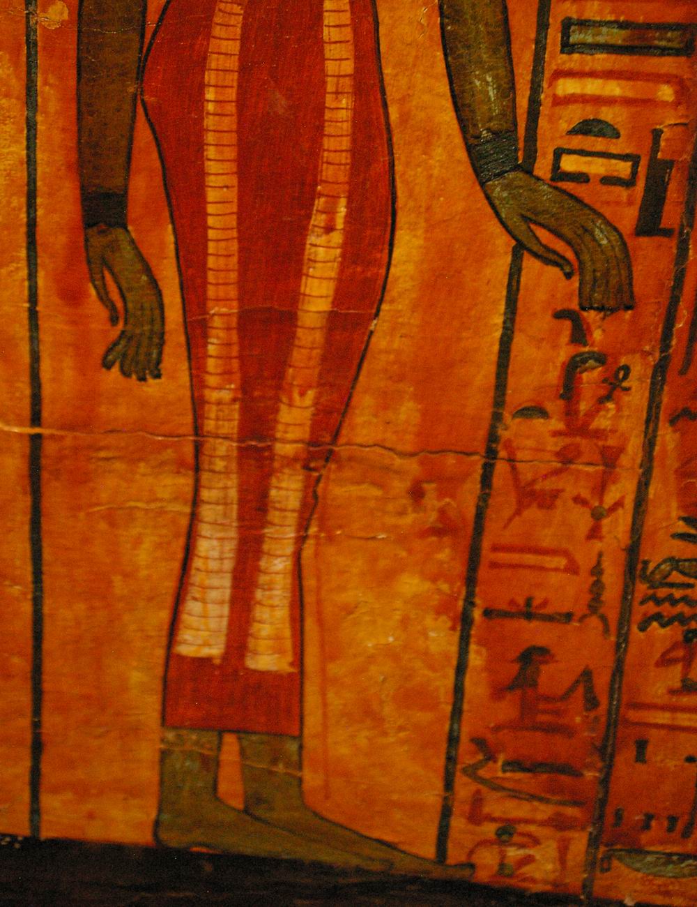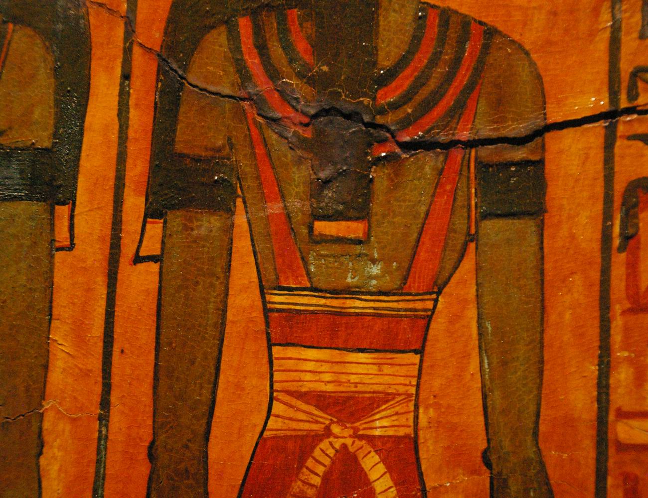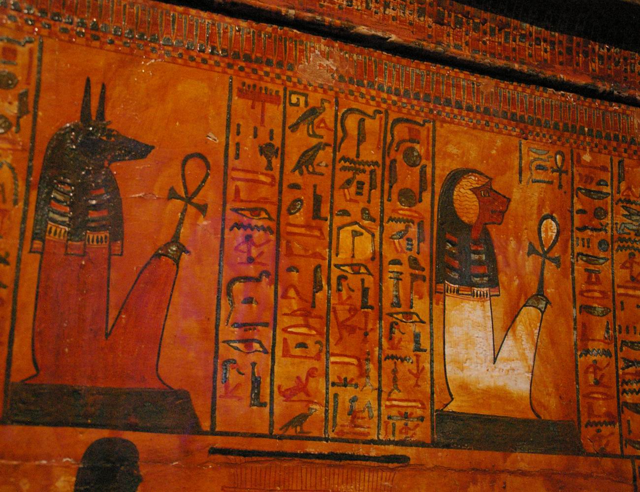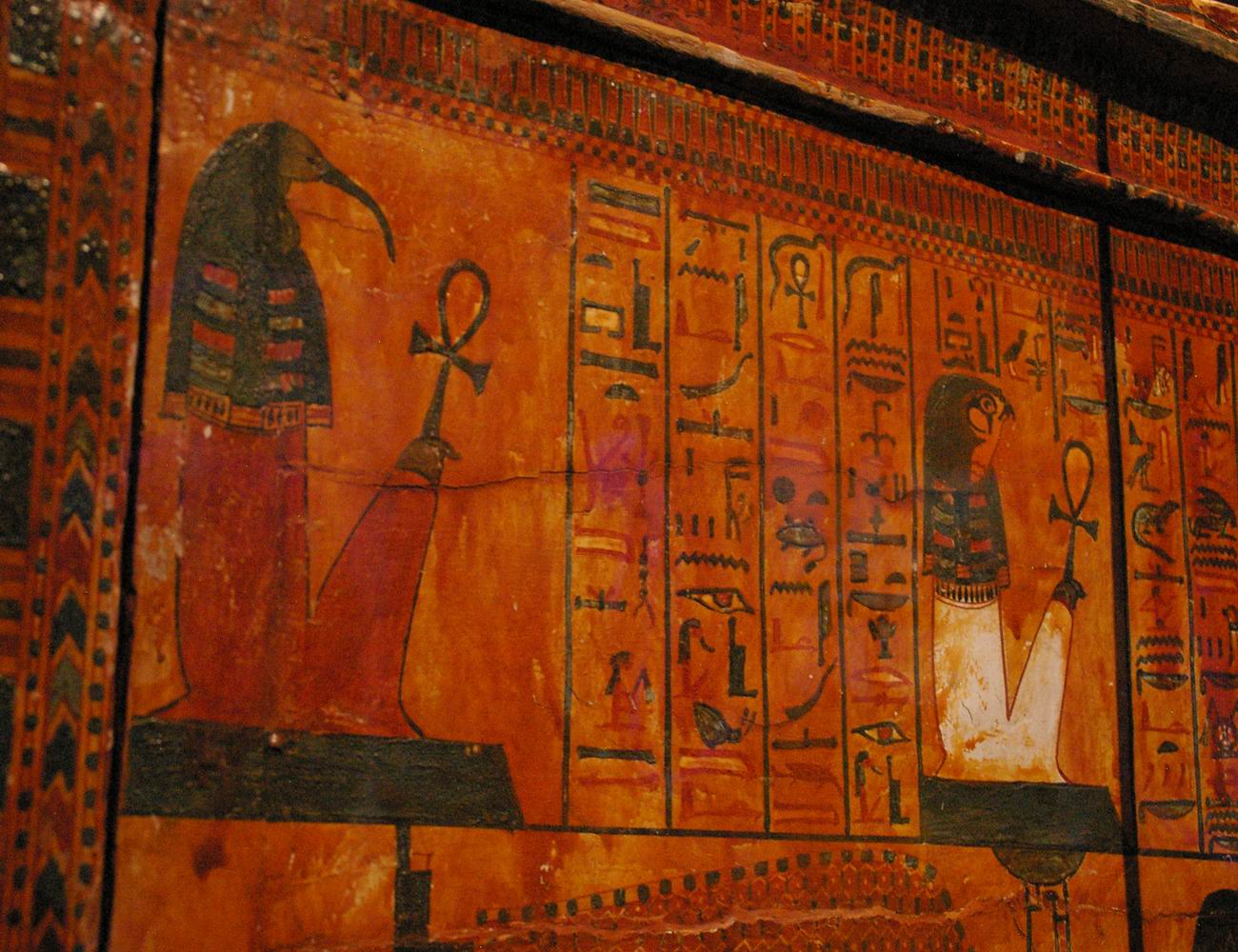 | Sous forme de vignette narrative, comme une bande dessinée, dieux et déesses prennent vie sous nos yeux pour préparer, protéger, et accompagner le défunt dans son ultime voyage. Dans le registre du haut le dieu Thot est représenté deux fois pour encadrer deux Enfants d'Horus, qui avaient la charge de protéger les vases canopes. Celui qui possède un visage humain est Amsit, celui à tête de singe, est Hapy, celui à tête de chien est Douamoutef, enfin la quatrième, à tête de faucon, se nomme Qebehsenouef. |