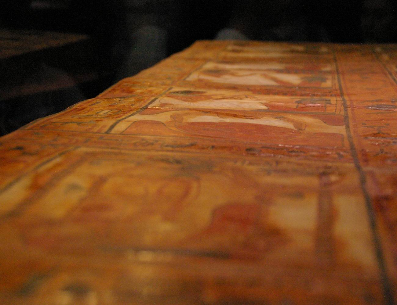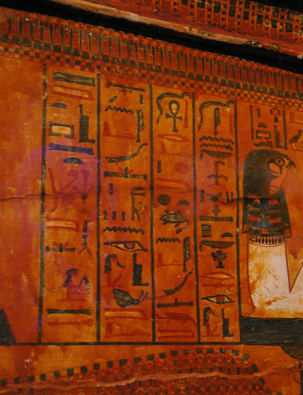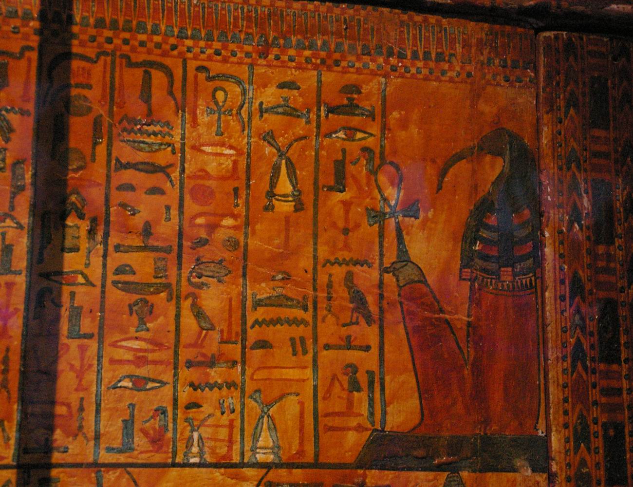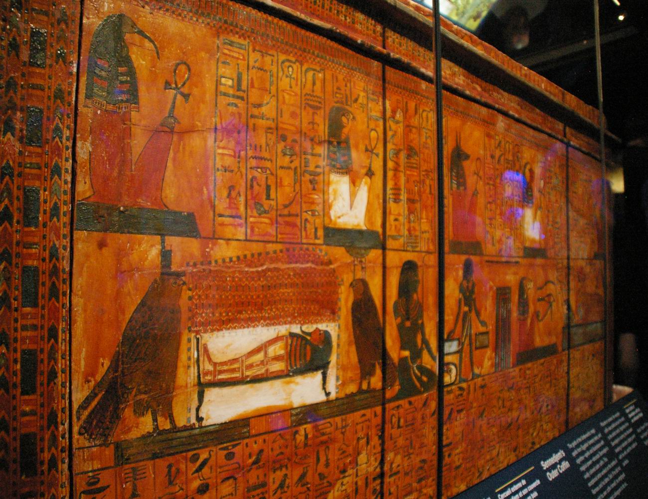 | Sous forme de vignette narrative, comme une bande dessinée, dieux et déesses prennent vie sous nos yeux pour préparer, protéger, et accompagner le défunt dans son ultime voyage. Dans le registre du haut le dieu Thot est représenté deux fois pour encadrer deux Enfants d'Horus, qui avaient la charge de protéger les vases canopes. Celui qui possède un visage humain est Amsit, celui à tête de singe, est Hapy, celui à tête de chien est Douamoutef, enfin la quatrième, à tête de faucon, se nomme Qebehsenouef. |