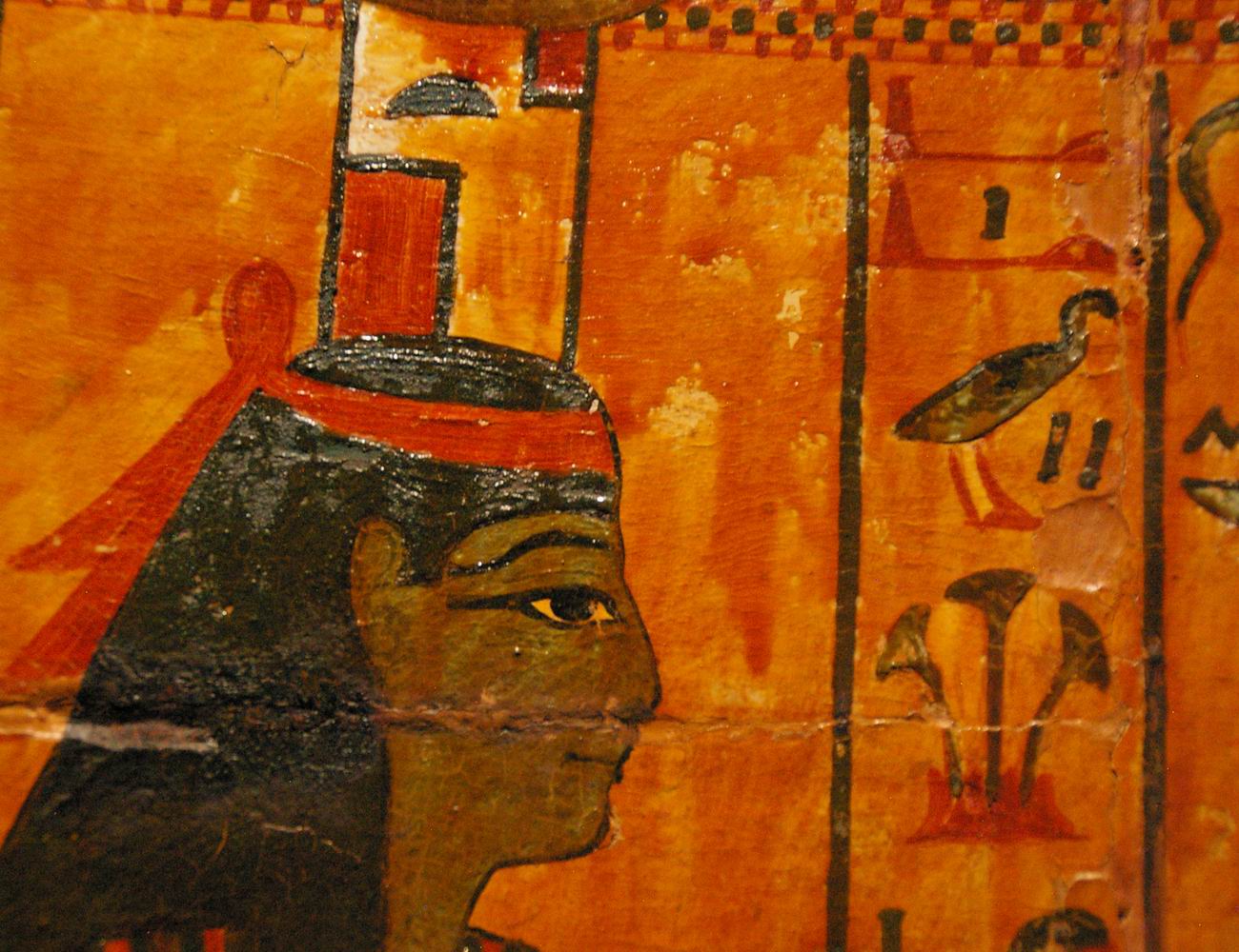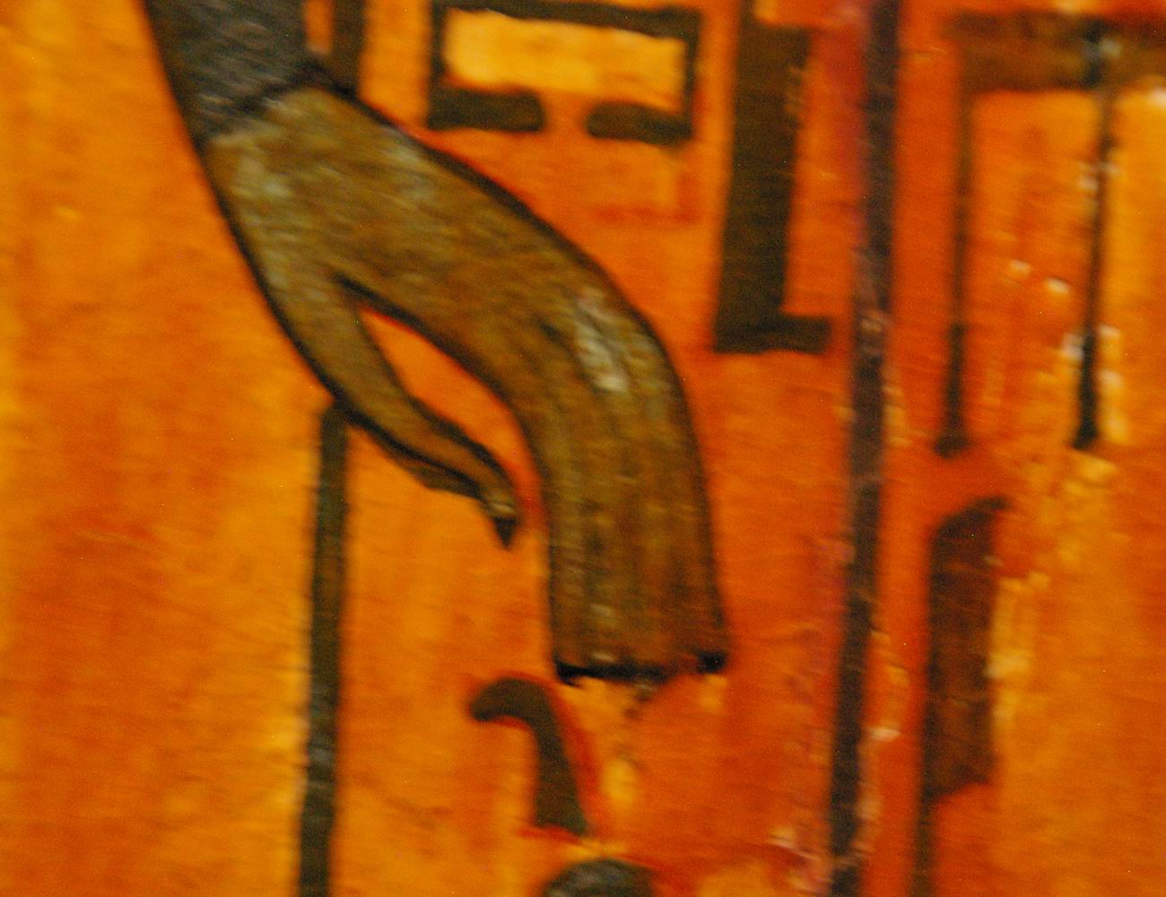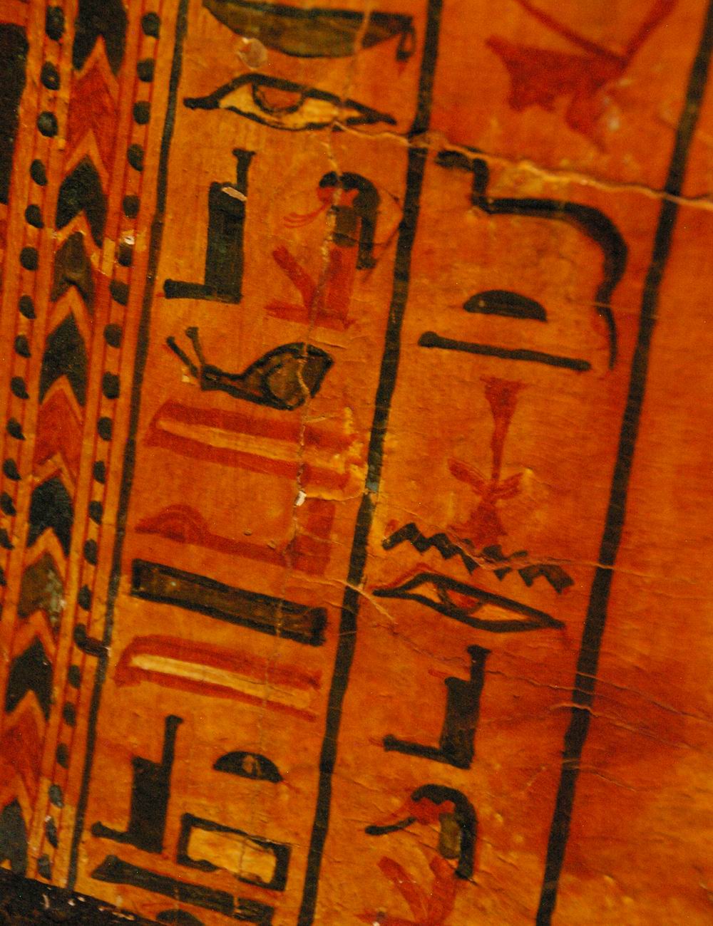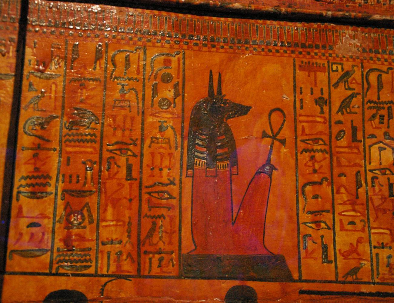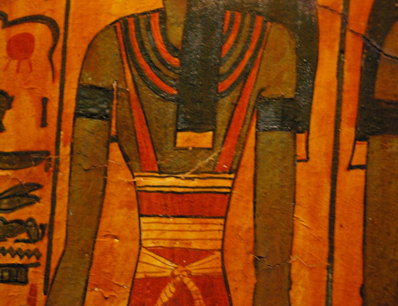 | Sous forme de vignette narrative, comme une bande dessinée, dieux et déesses prennent vie sous nos yeux pour préparer, protéger, et accompagner le défunt dans son ultime voyage. Dans le registre du haut le dieu Thot est représenté deux fois pour encadrer deux Enfants d'Horus, qui avaient la charge de protéger les vases canopes. Celui qui possède un visage humain est Amsit, celui à tête de singe, est Hapy, celui à tête de chien est Douamoutef, enfin la quatrième, à tête de faucon, se nomme Qebehsenouef. |