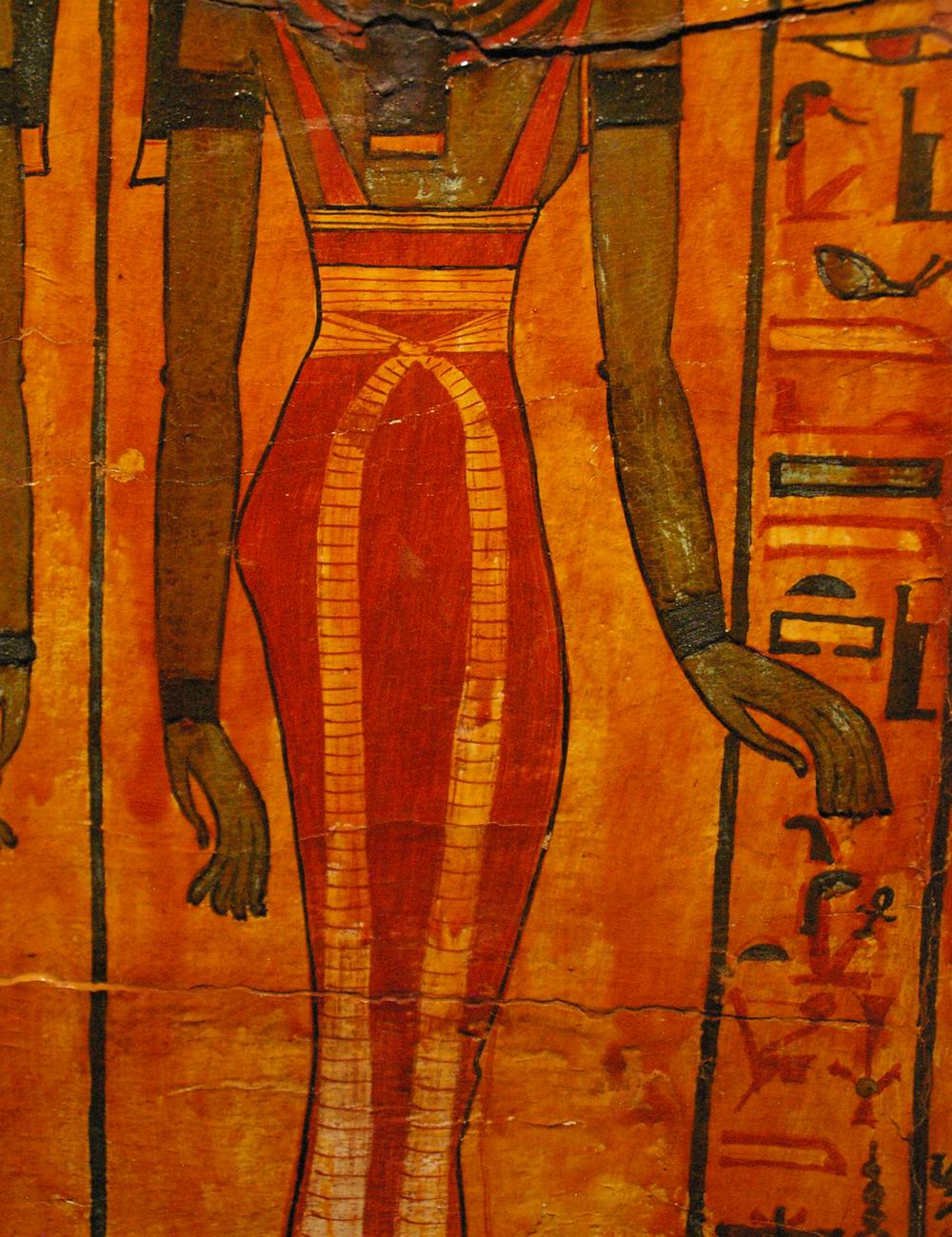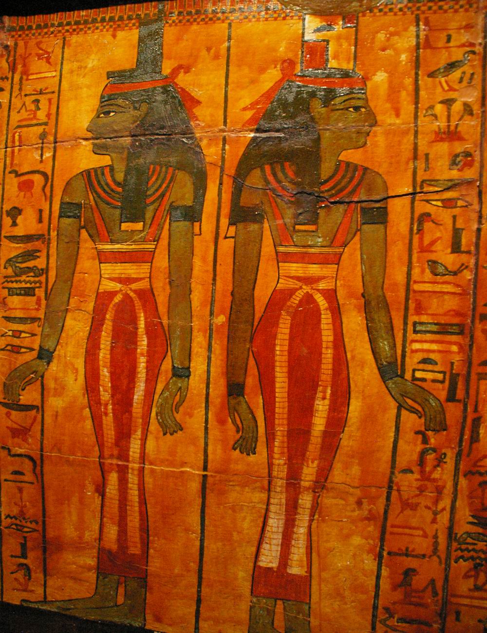 | Nephthys et Isis portent une robe fourreau maintenue par des bretelles. |