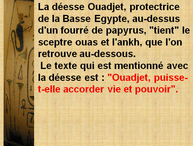 protection du ciel A gauche la déesse Ouadjet, protectrice de la Basse Egypte, au-dessus d'un fourré de papyrus, "tient" les sceptres ouas et l'ankh, que l'on retrouve au-dessous. Le texte qui est mentionné avec la déesse est : "Ouadjet, puisse-t-elle accorder vie et pouvoir". Au dessus du cartouche de gauche l'on peut y lire : " Le dieu accomplit, le Maitre des Deux Terres Neb-khéperou-Rê, puis en suivant : "le fils de Rê, Maitre des couronnes, Toutânkhamon, prince d'Héliopolis du Sud, doué de vie éternellement et à jamais, comme Rê (texte sous les trois cartouches). La lecture se poursuit par : "la grande épouse royale Ankhsenamon (celle) qu'aime Horus, maitre du Palais, la souveraine de Haute et Basse Egypte, puisse-t-elle vivre et rajeunir".