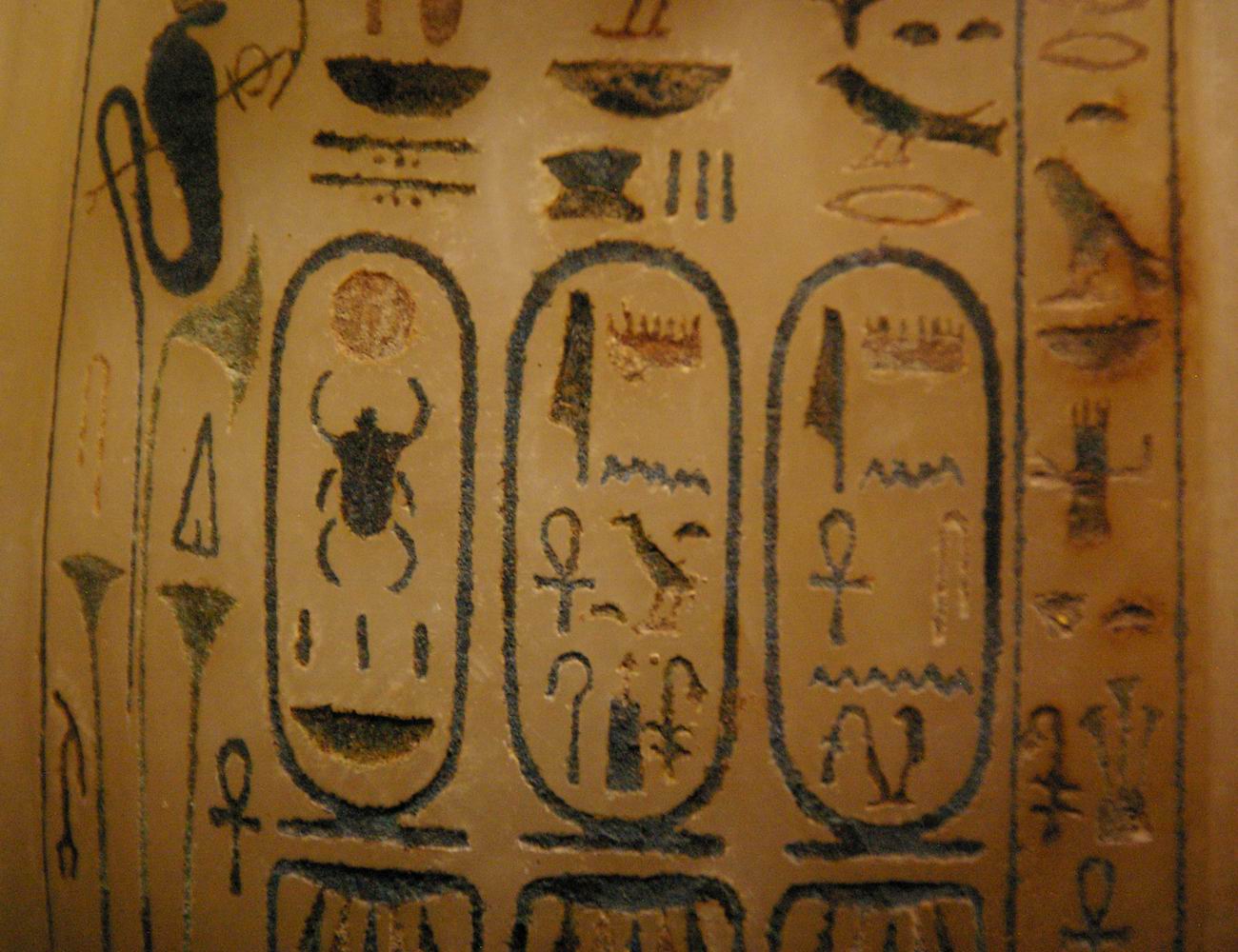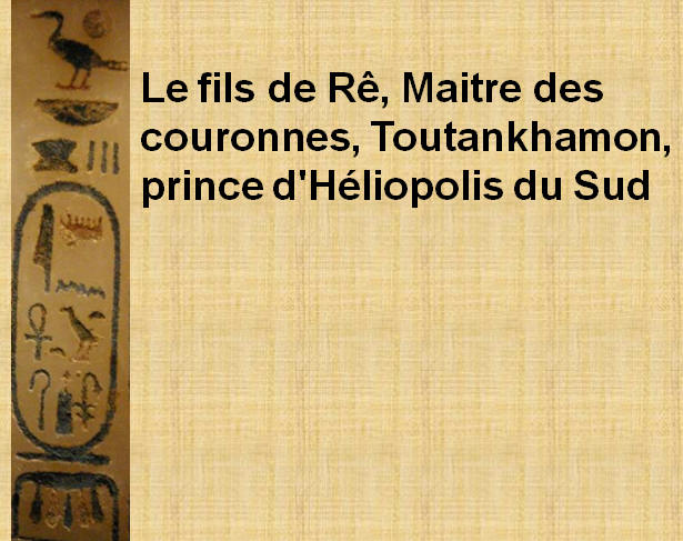 Toutankhamon nous avons la mention : Le fils de Rê, le Maitre des couronnes. Sous les cartouches nous avons la mention suivante : Qu'il soit vivant à jamais, doué de vie comme Rê. |