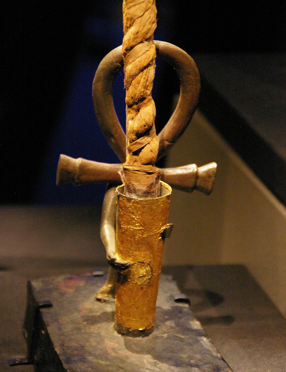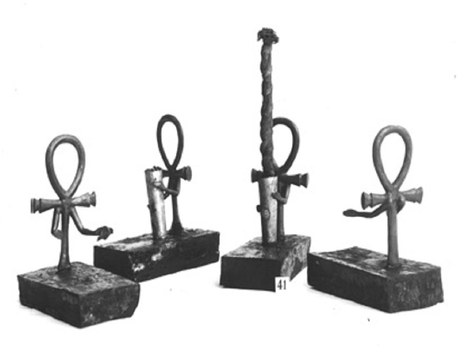 | Le support mesure 23 cm environ et imite la forme d'un signe ankh en bronze, doté de bras pliés dans l'attitude de l'étreinte. | ||||||||||