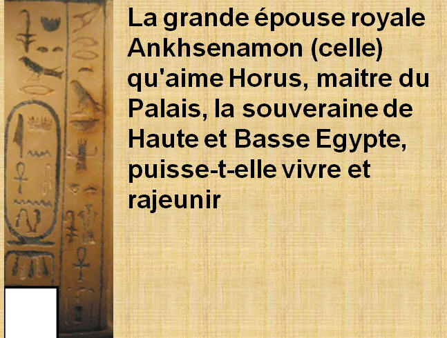| Neb-kheperou-Rê (Rê est possesseur des manifestations), Tout-ankh-Amon heqa Iounou, (Image vivante d'Amon régent d'Héliopolis), Ankh-s-Amon (Elle vit pour Amon). |