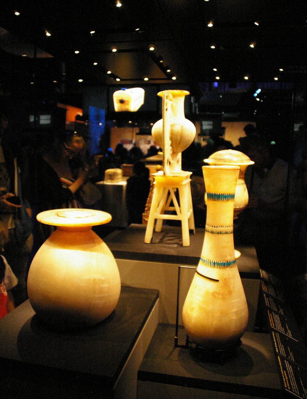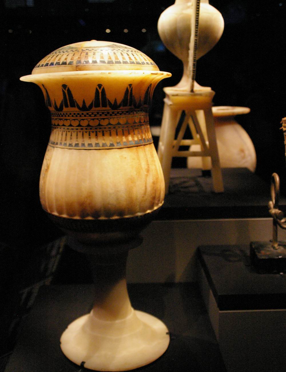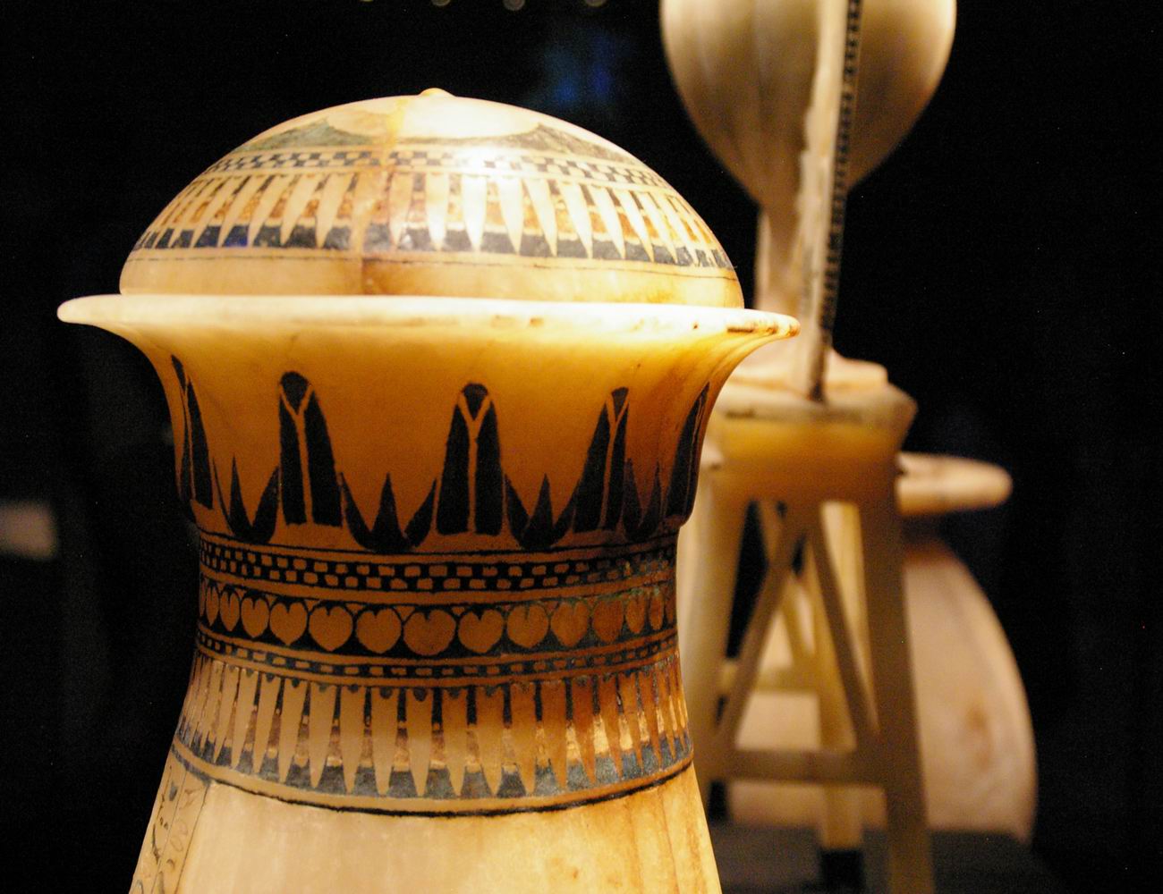 Vases en calcite. Les vases en pierre de l'Egypte antique servaient à conserver les huiles précieuses ou les produits de beauté, et leur fonctions dans la tombe de Toutânkhamon ne fut d'ailleurs pas différente. |