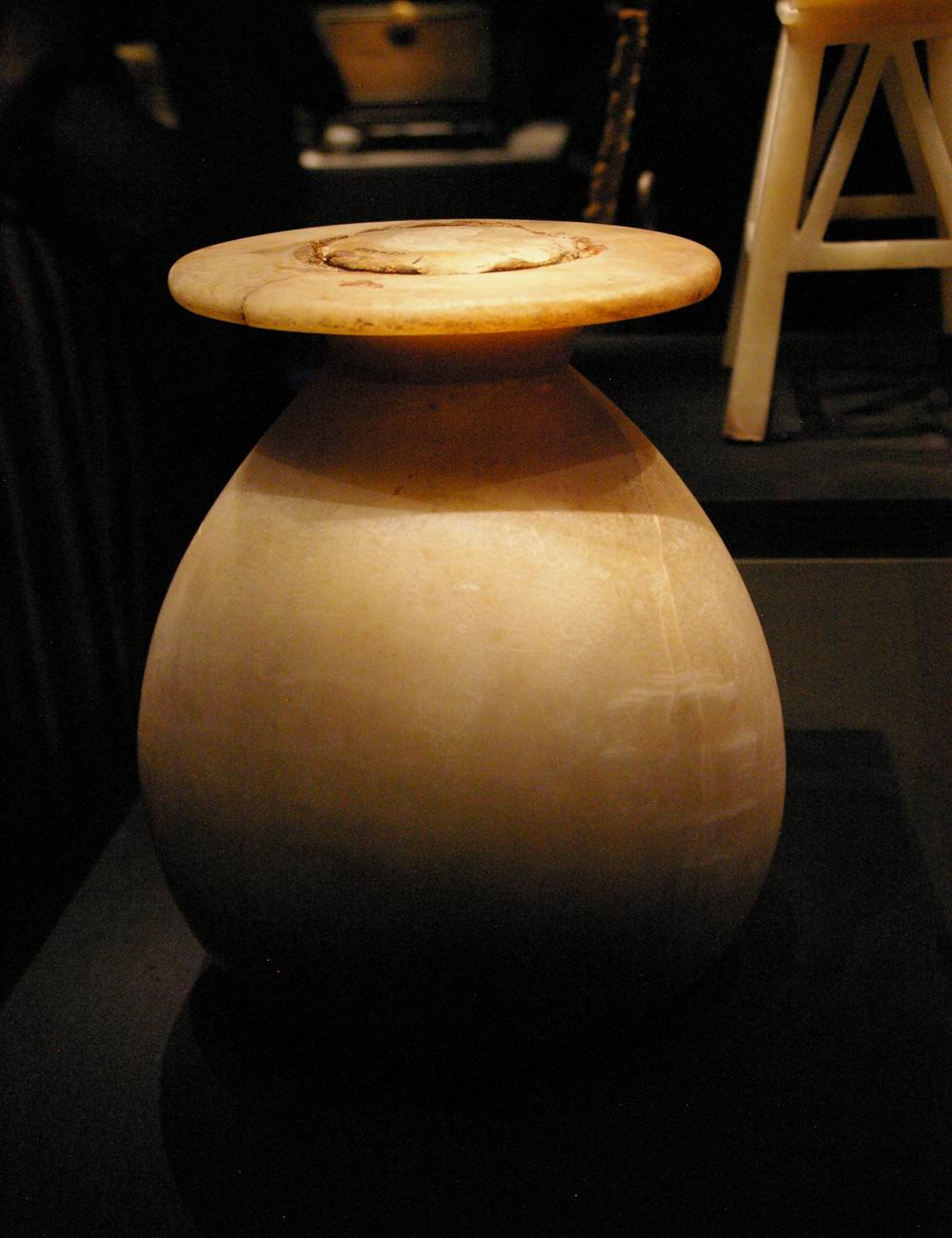 | Vase en calcite ouvragé, posé sur un tabouret lui aussi en calcite. | ||||||||||