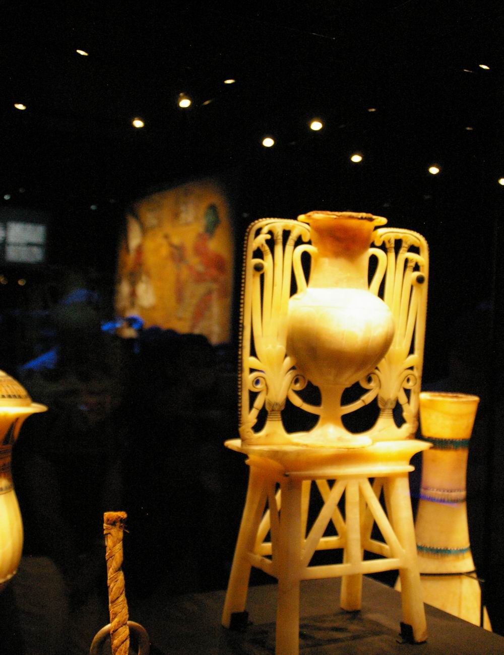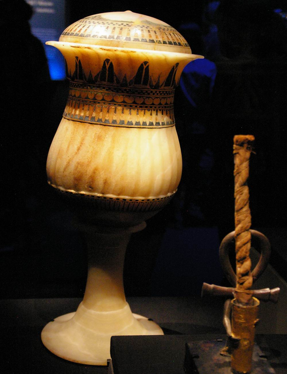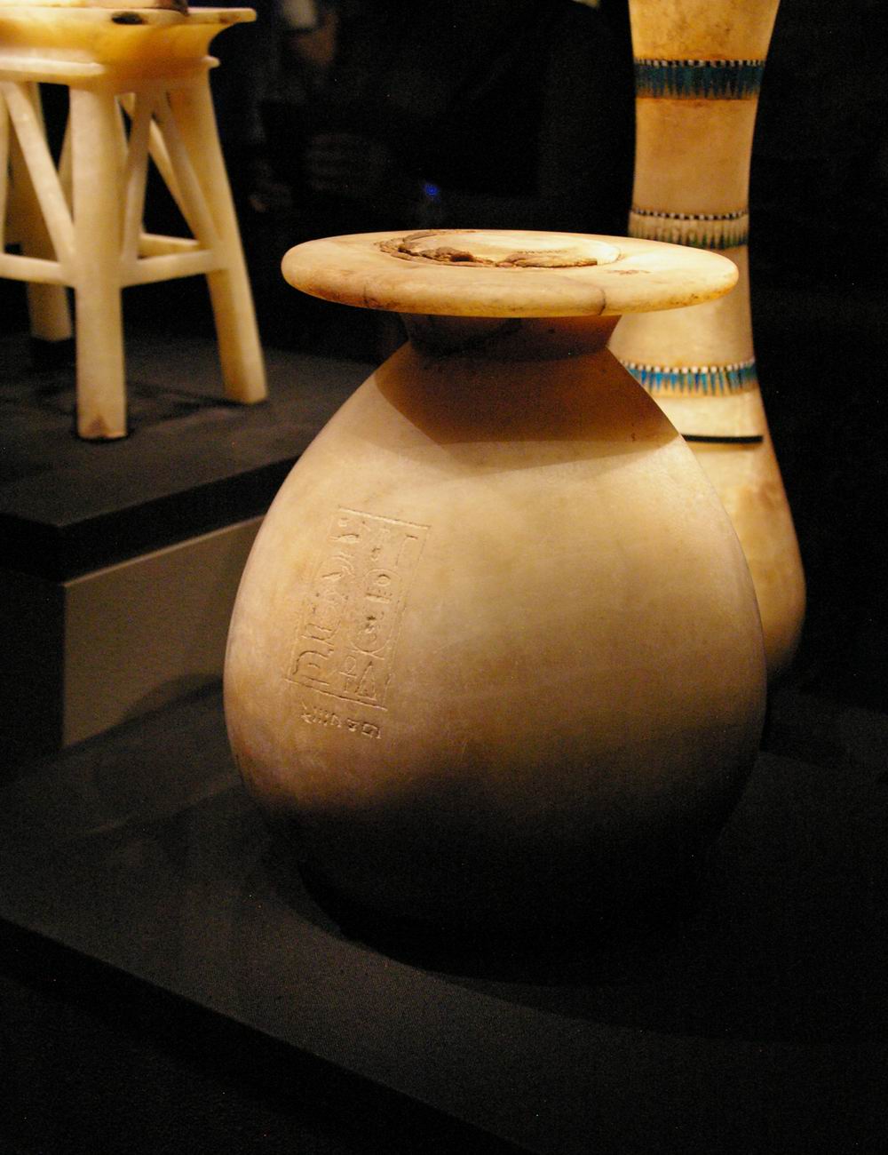 | Vase en calcite, sur socle, arborant les cartouches de Toutânkhamon et de son épouse Ankhsenamon. | ||||||||||