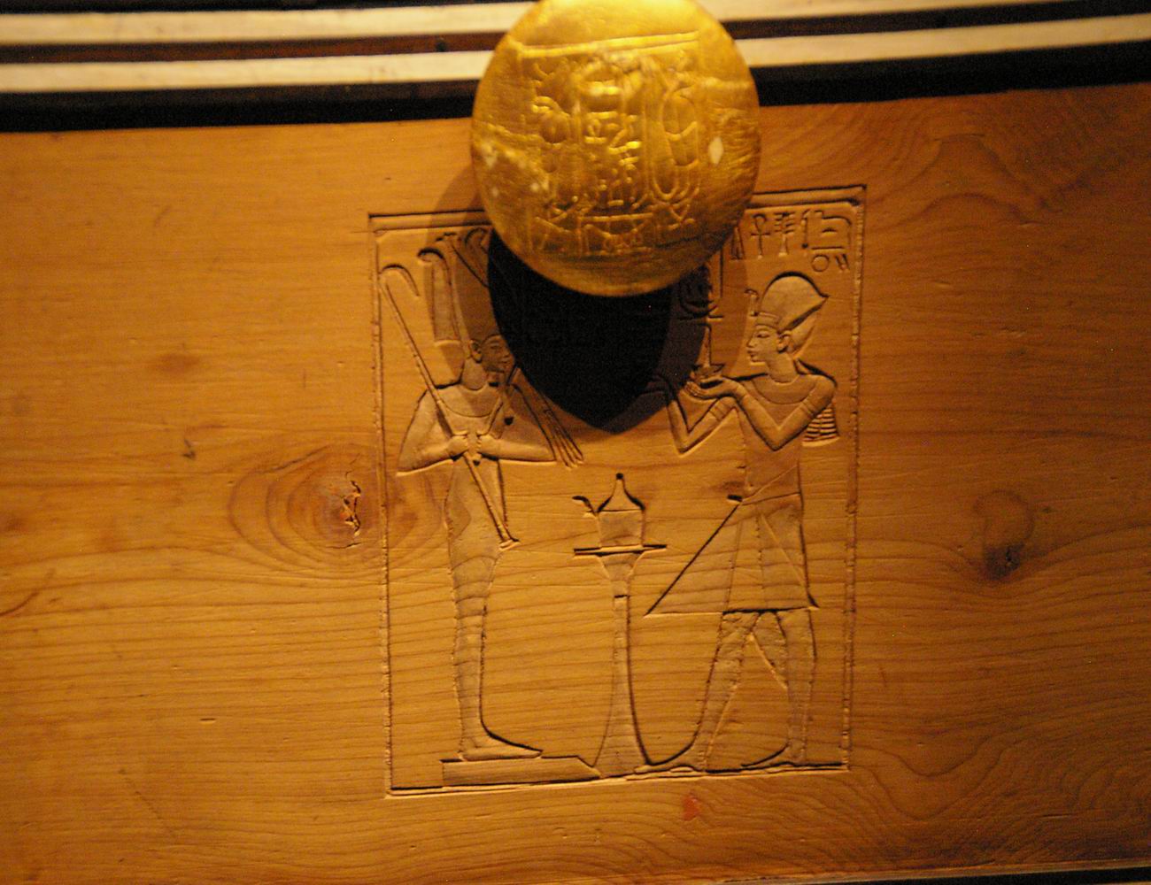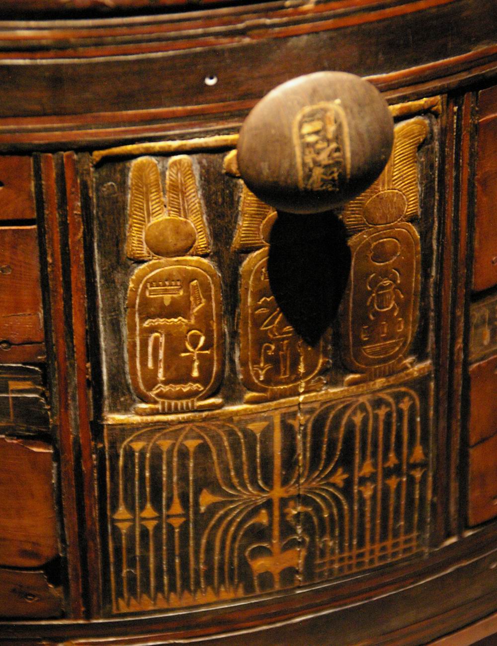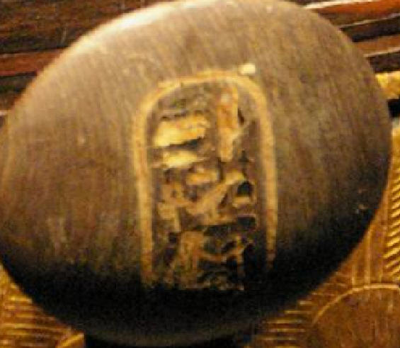 | Sur le bouton de la "cuve", du coffre à brancard, nous avons le cartouche, au nom du roi, entouré de deux uraeus | ||||||||