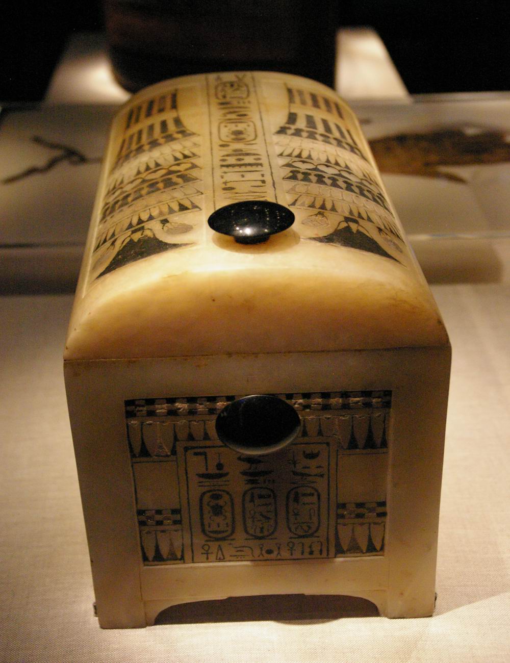 à Toutânkhamon et à son épouse Ankhsenamon. Le coffre est muni de deux boutons de fermetures en obsidienne. Il contenait une abondance de cheveux mal conservés, et deux paquets de cheveux enveloppés de toile -vestiges du contrat de mariage royal ?- |