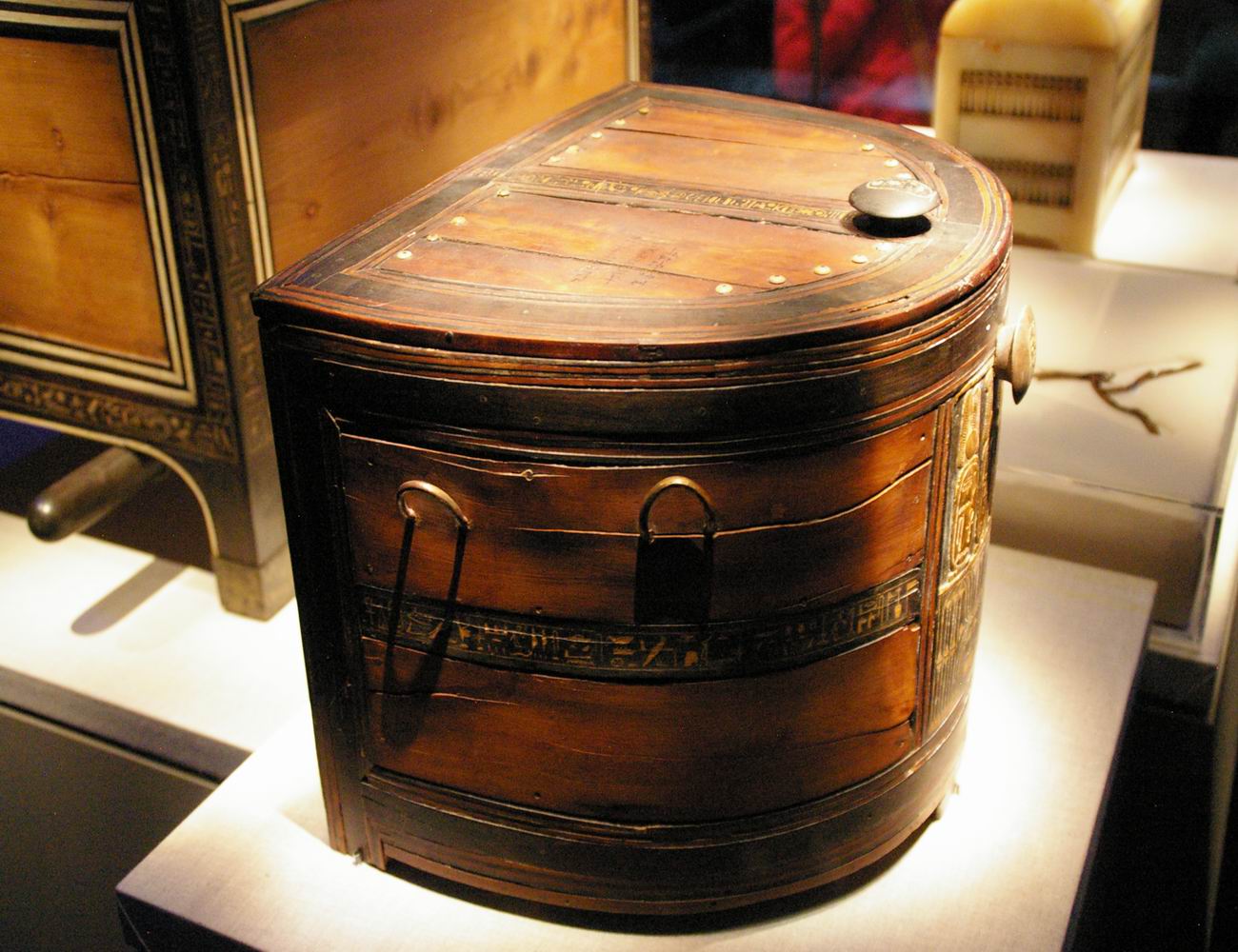 Coffret au corps bombé qui, dans l'antiquité, servait peut-être au rangement et au transport des rouleaux de papyrus.