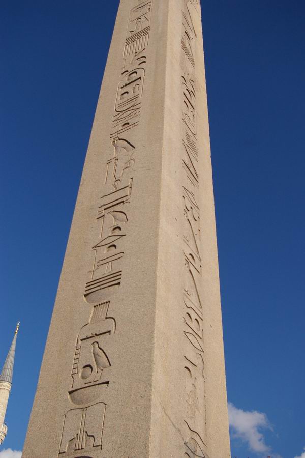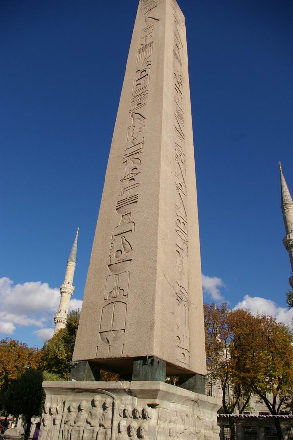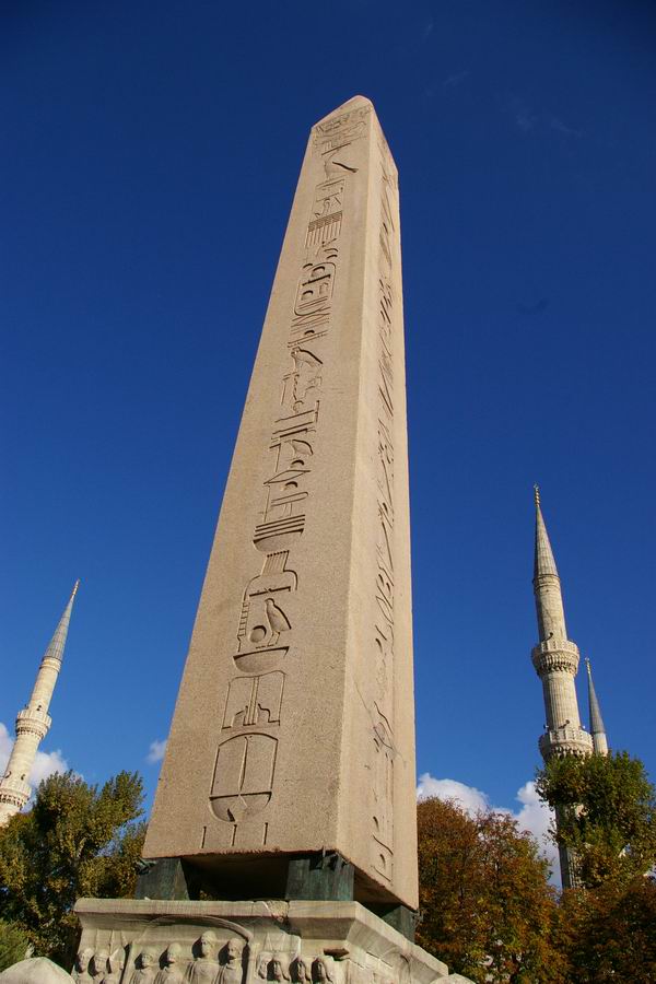 | L'obélisque de Théodose et deux minarets de la Mosquée Bleue. |