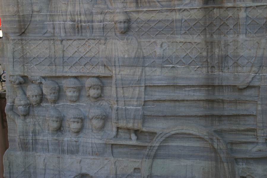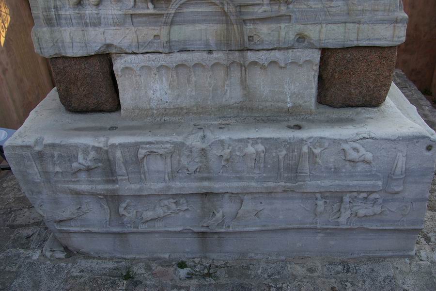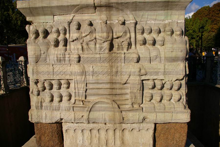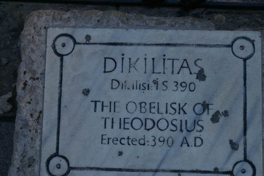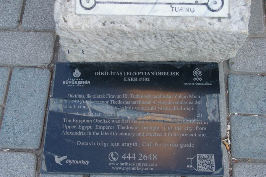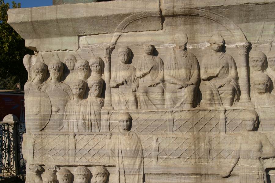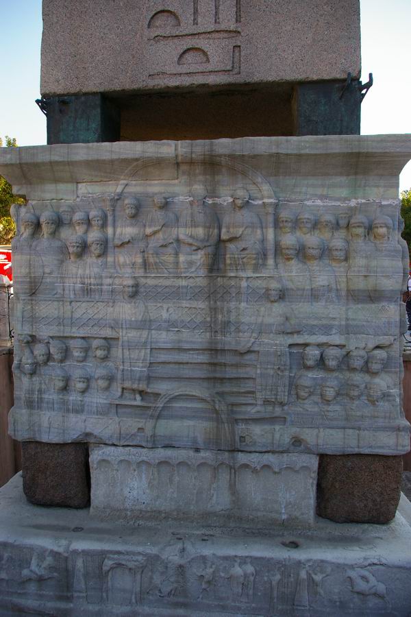 Face Ouest. L'obélisque de Théodose est le plus ancien monument d'Istanbul car il est daté du XVème siècle avant notre ère, soit il y a 3 500 ans. Il a été exécuté par le pharaon Thoutmosis III pour célébrer sa victoire en Mésopotamie lors de sa huitième campagne en l'an 33. C'est l'empereur romain Constantin le Grand (324-337) qui ordonna a ce que l'obélisque du temple de Karnak soit transporté à Constantinople. Bien qu'il mourût avant l'arrivée de celui-ci, son fils Constantin II (337-361) tenta d'exhausser son souhait. L'obélisque fut transporté à Alexandrie où il resta plusieurs années avant d'être embarqué pour Constantinople. C'est Julianus (361-363) qui écrivit dans une lettre aux autorités Alexandrines : "Il serait bon que vous envoyez ce monument à Constantinople, une ville qui vous a généreusement ouvert les bras et a accordé le droit de passage de vos navires vers la Mer Noire, au point que vous pourriez participer à l'embellissement de la cité". C'est sous le règne de Théodose Ier le Grand que l'obélisque sera dressé au centre de la spina (dorsale). Sur la face Ouest Théodose, dans la loge impériale, assiste aux courses de chars. |