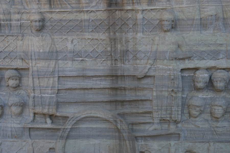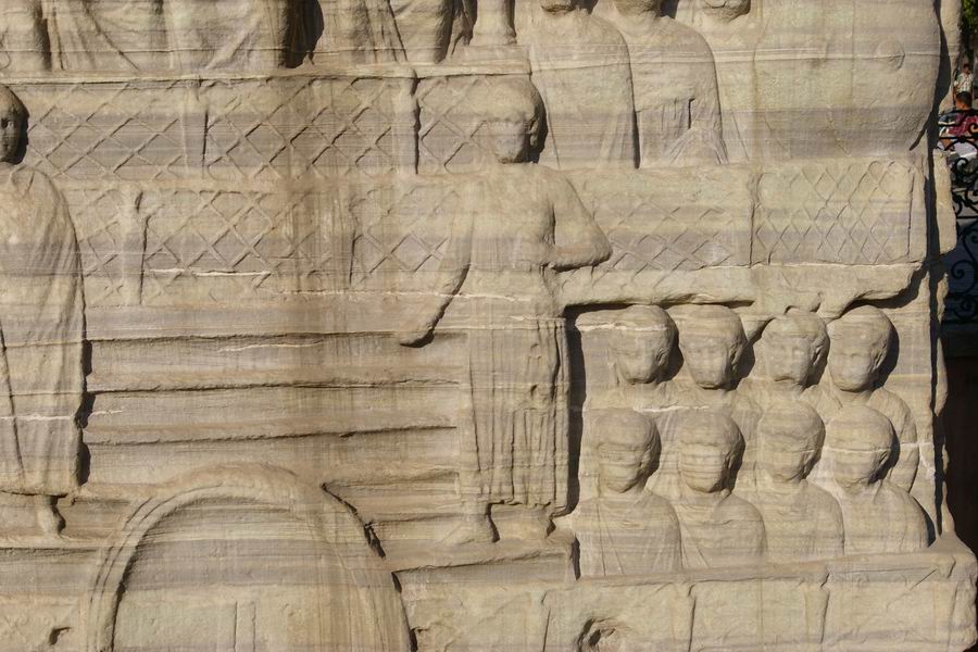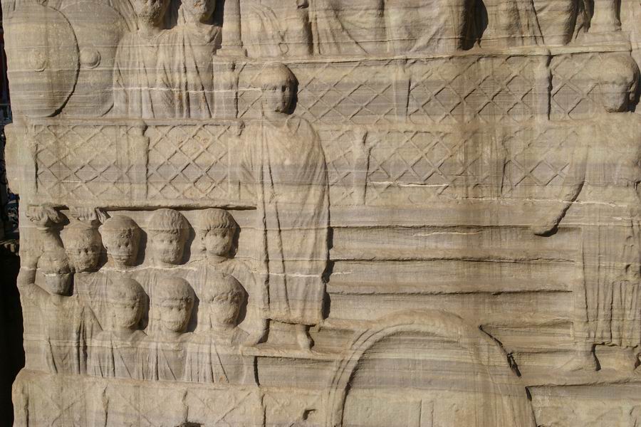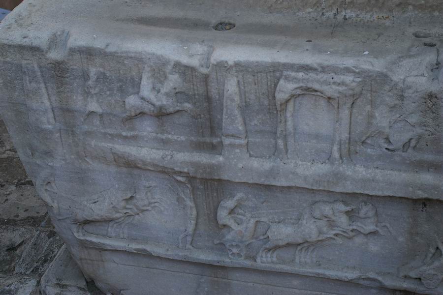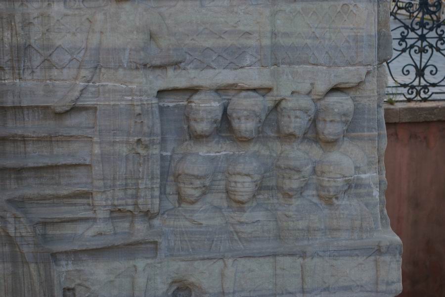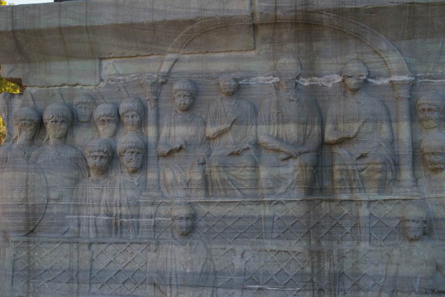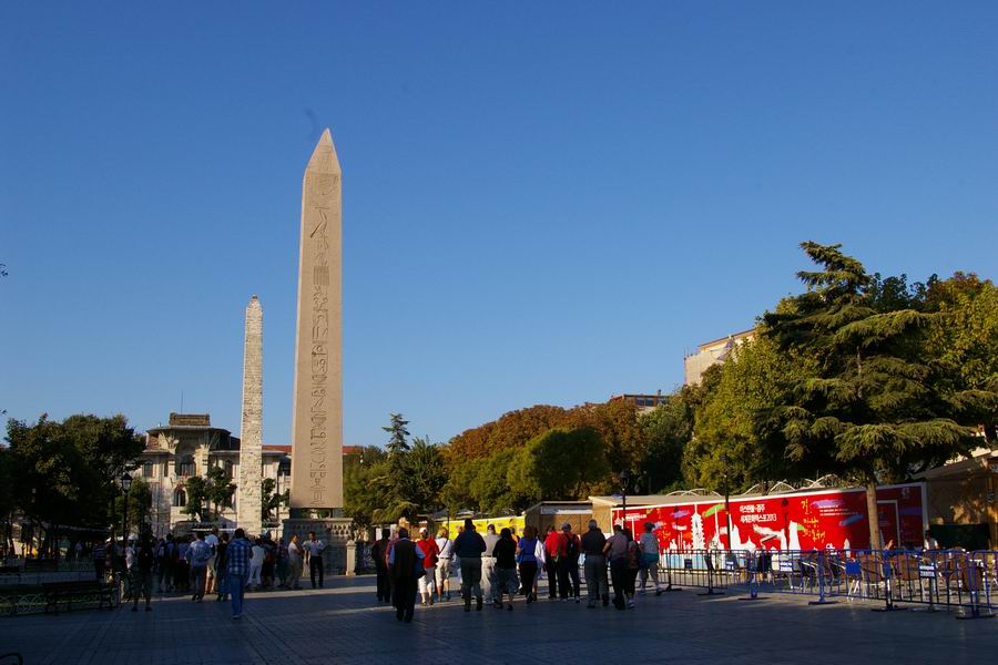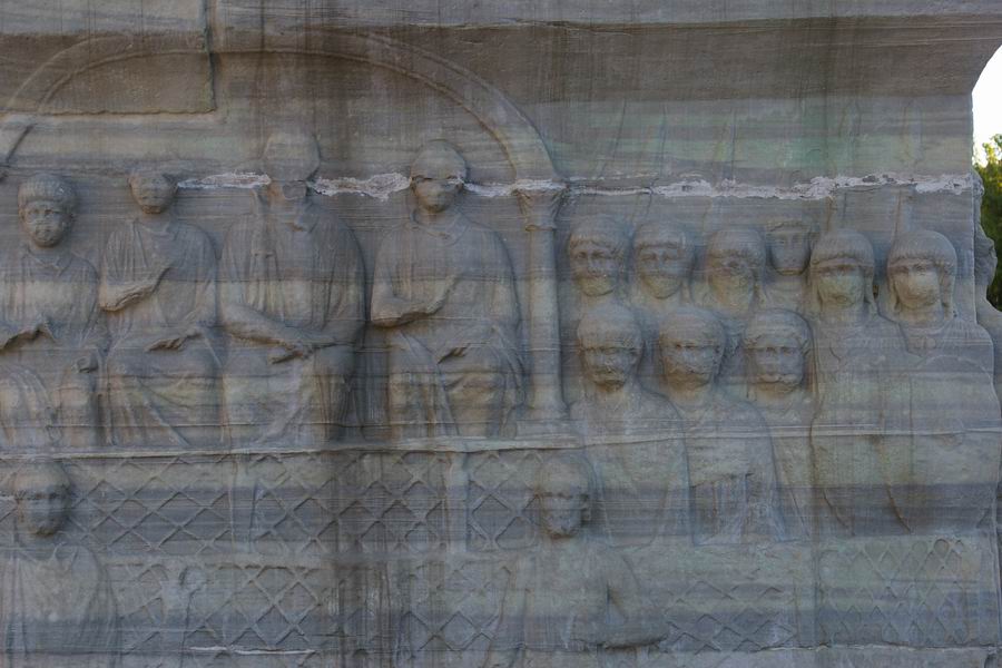 Face Ouest. L'obélisque de Théodose est le plus ancien monument d'Istanbul car il est daté du XVème siècle avant notre ère, soit il y a 3 500 ans. Il a été exécuté par le pharaon Thoutmosis III pour célébrer sa victoire en Mésopotamie lors de sa huitième campagne en l'an 33. C'est l'empereur romain Constantin le Grand (324-337) qui ordonna a ce que l'obélisque du temple de Karnak soit transporté à Constantinople. Bien qu'il mourût avant l'arrivée de celui-ci, son fils Constantin II (337-361) tenta d'exhausser son souhait. L'obélisque fut transporté à Alexandrie où il resta plusieurs années avant d'être embarqué pour Constantinople. C'est Julianus (361-363) qui écrivit dans une lettre aux autorités Alexandrines : "Il serait bon que vous envoyez ce monument à Constantinople, une ville qui vous a généreusement ouvert les bras et a accordé le droit de passage de vos navires vers la Mer Noire, au point que vous pourriez participer à l'embellissement de la cité". C'est sous le règne de Théodose Ier le Grand que l'obélisque sera dressé au centre de la spina (dorsale). Sur la face Ouest Théodose, dans la loge impériale, assiste aux courses de chars. |