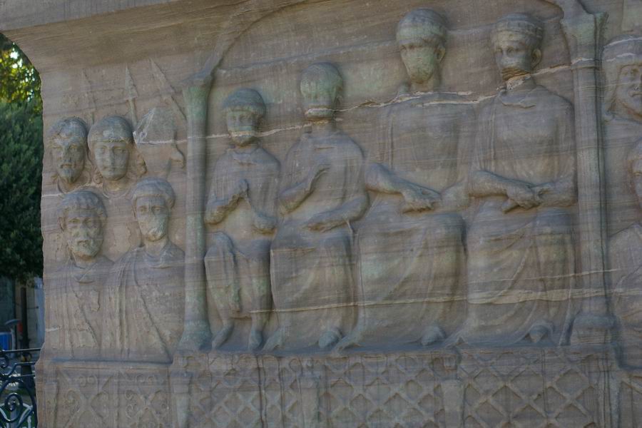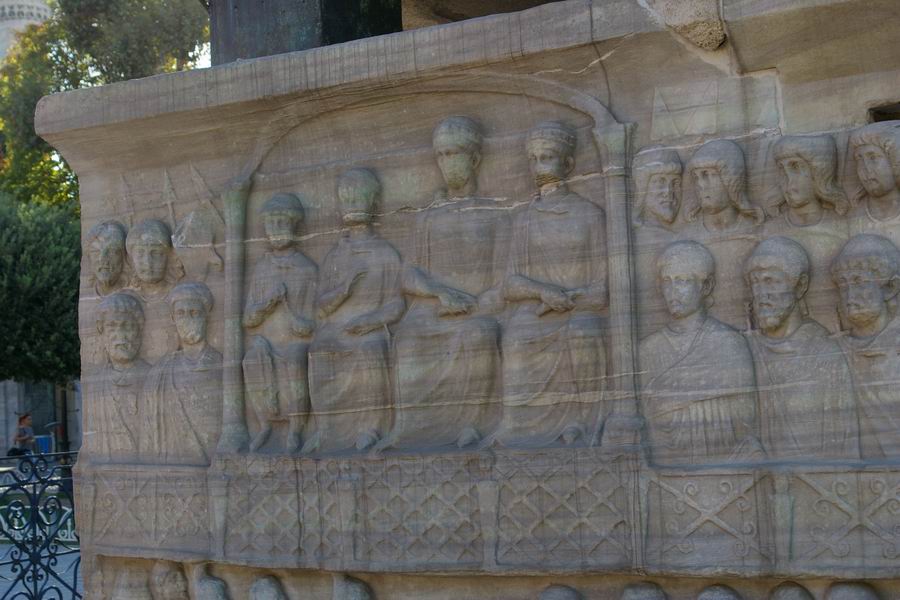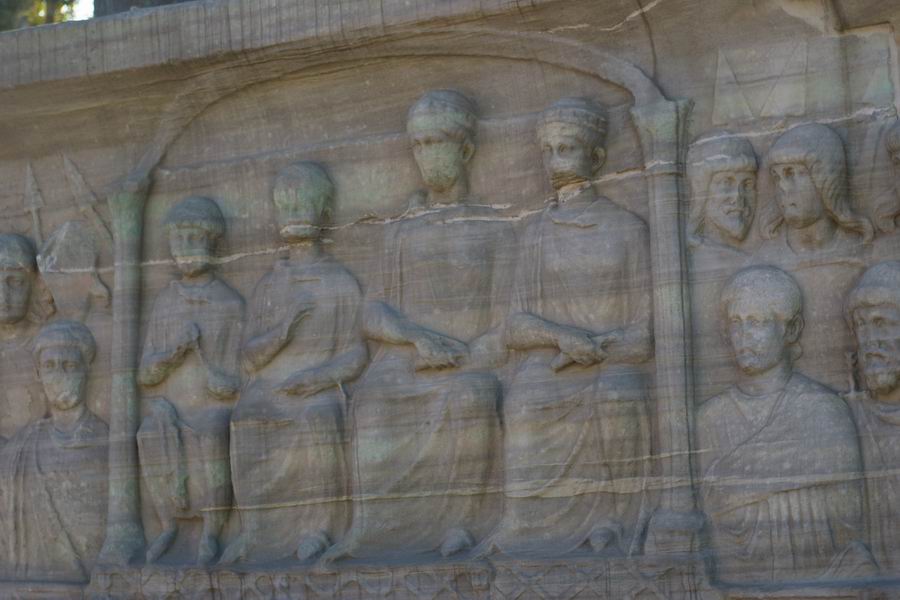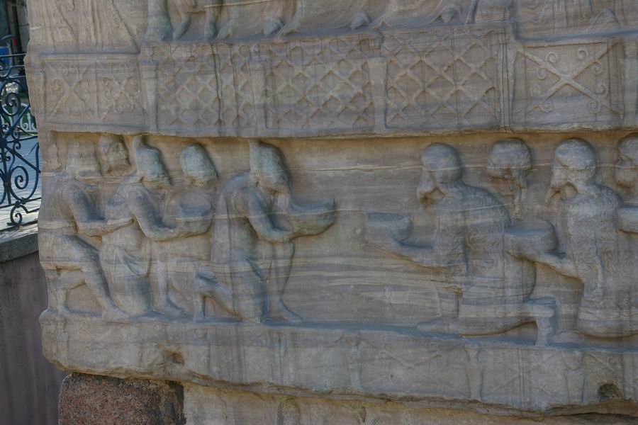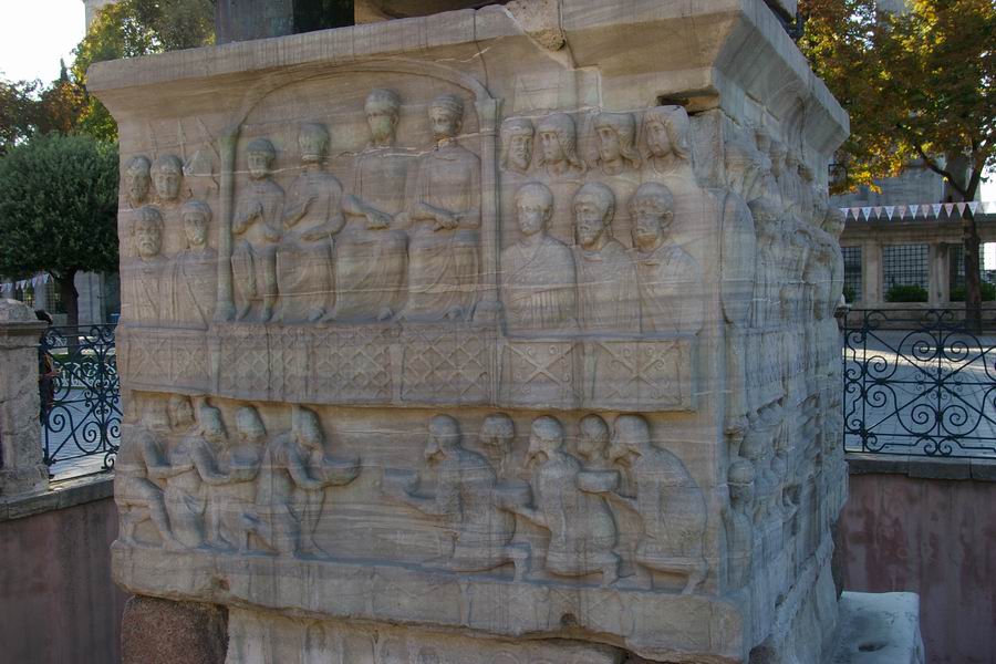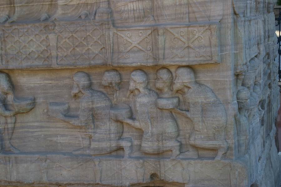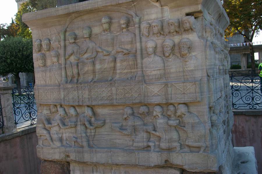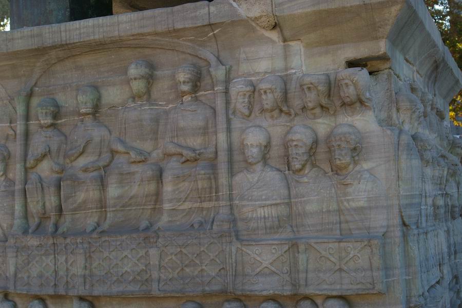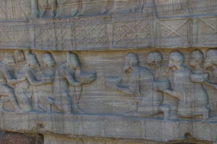 Face Nord. L'empereur Théodose, dans la loge impériale, accompagné des siens, des dignitaires et des soldats, reçoit des cadeaux envoyés par les pays étrangers. Les ambassadeurs des pays étrangers offrent les cadeaux à l'empereur, ils sont agenouillés en signe de soumission. |