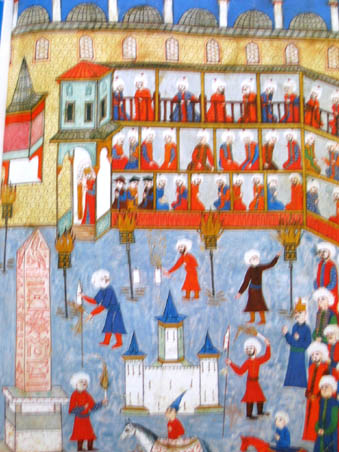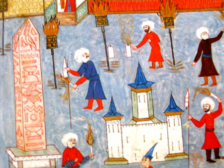 des janissaires. Le janissaire, en turc yeni çeri: nouvelle milice, était un soldat d'un corps d'infanterie ottoman qui servit du XIVème au XIXème siècle. Recrutés au début ( XIVème-XVIème siècle) parmi les enfants enlevés aux peuples soumis, les janissaires jouèrent un rôle déterminant dans les conquêtes de l'Empire ottoman. |