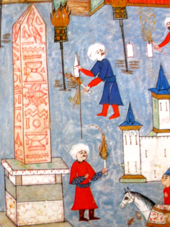 | Sur cette gravure du XVIème siècle nous constatons que l'emplacement du socle de l'obélisque de Théodose est au même niveau que la place où évoluent les personnages. |