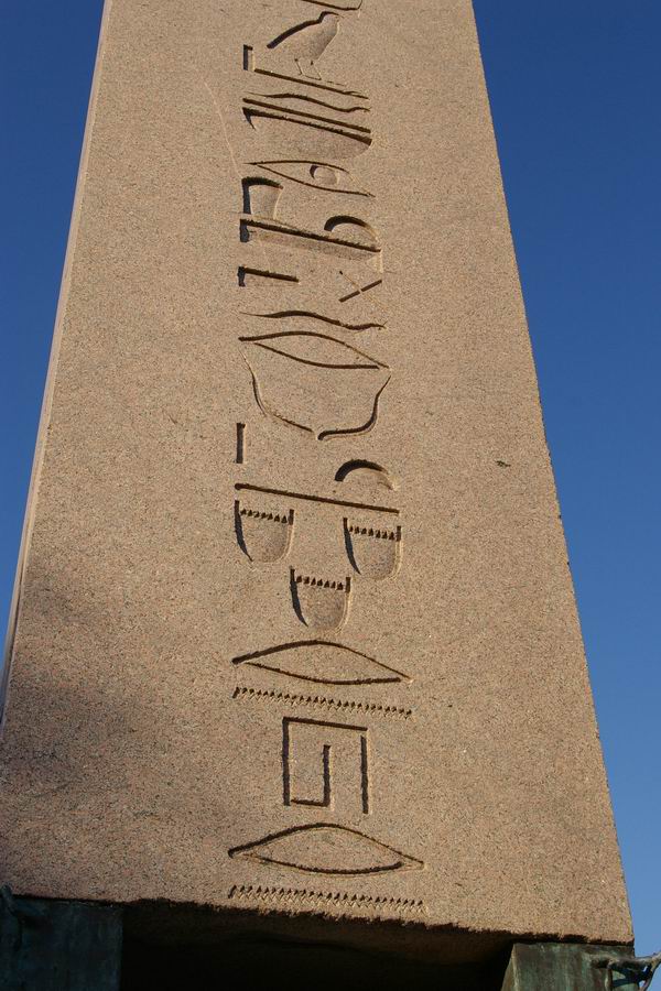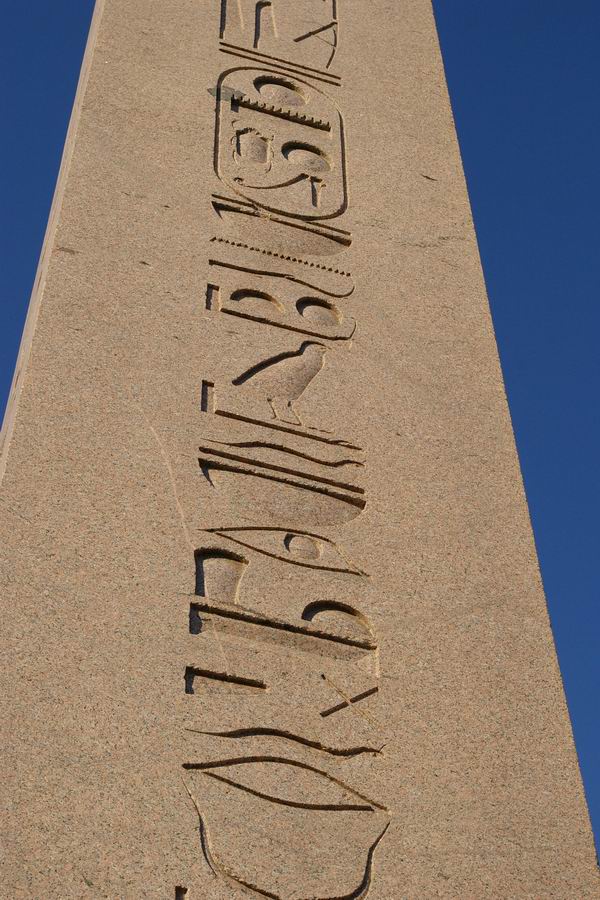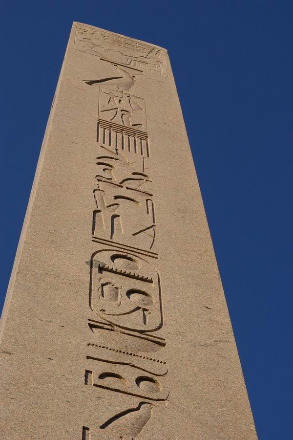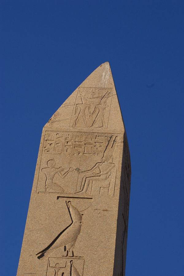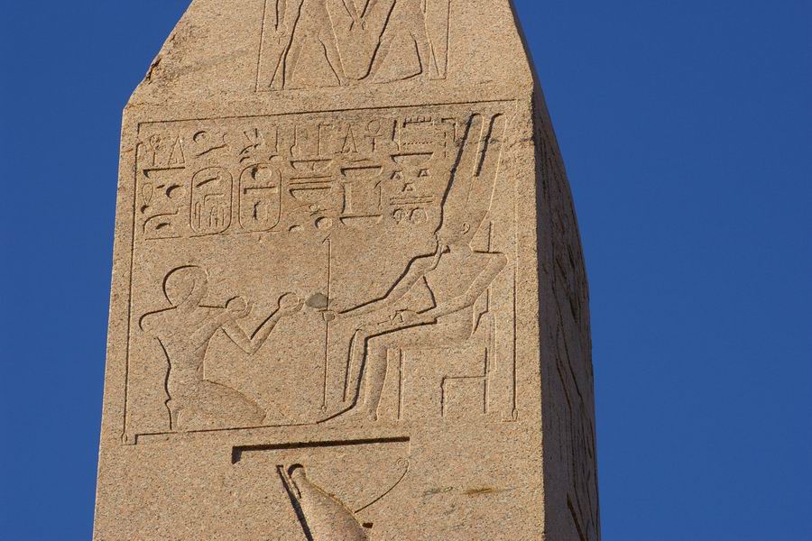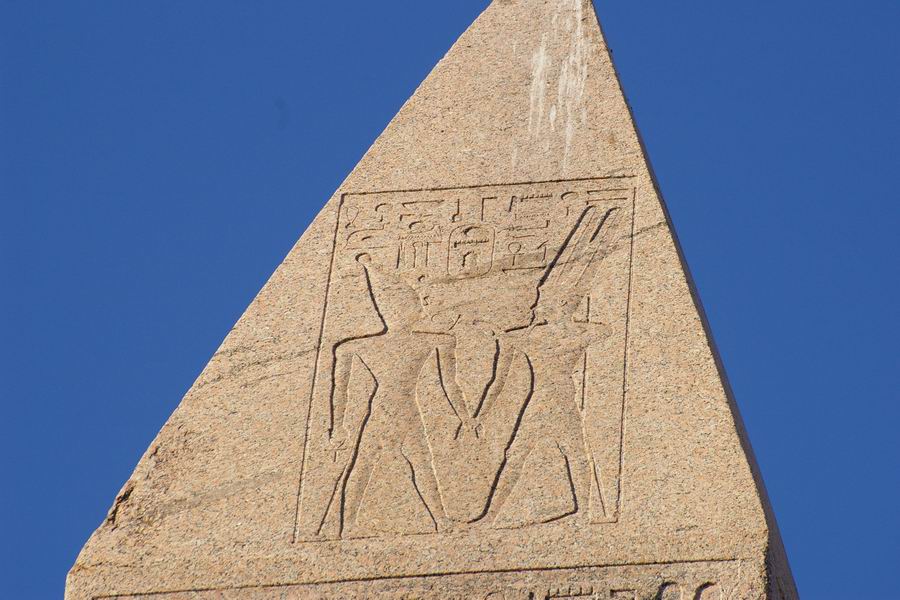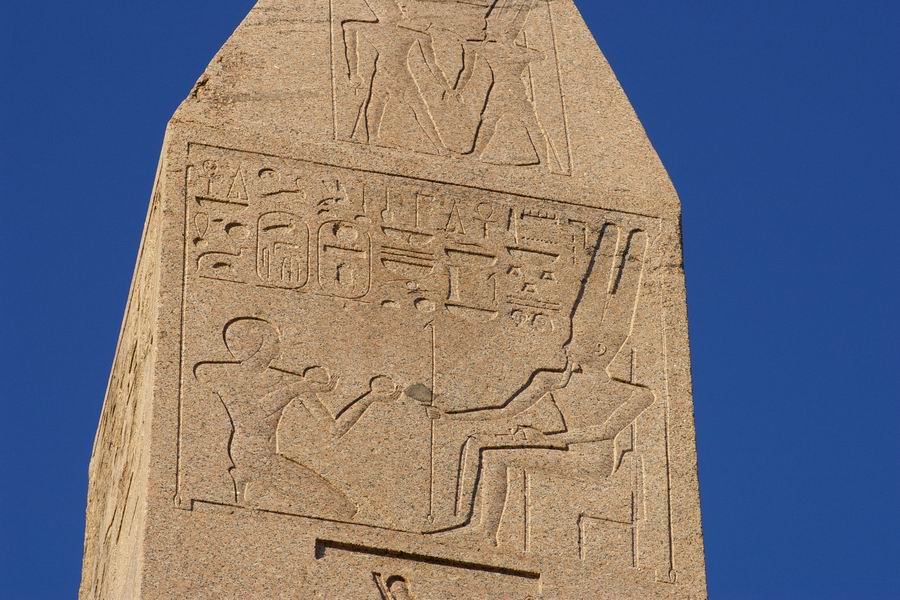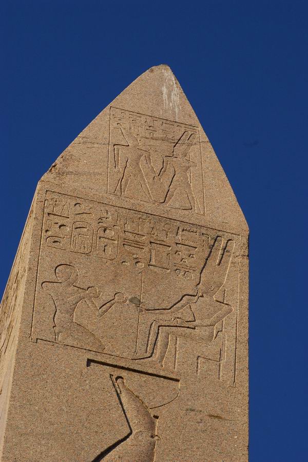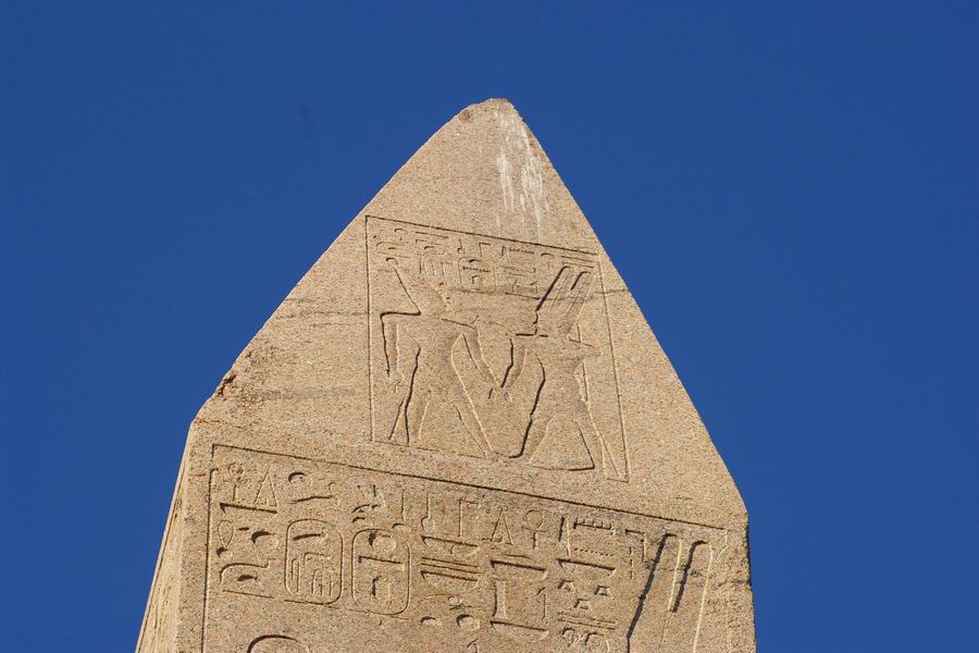 | Sur le pyramidion le dieu Amon accueille le roi coiffé de la couronne blanche de Haute Egypte. |