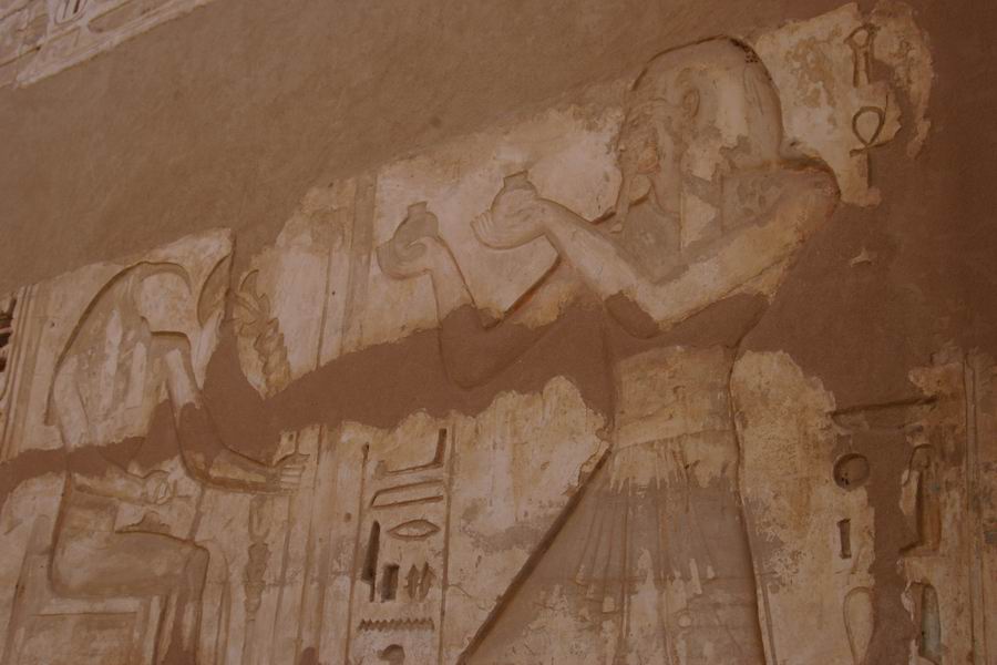 | Offrande de vases au dieu Thot, à tête d'ibis. |