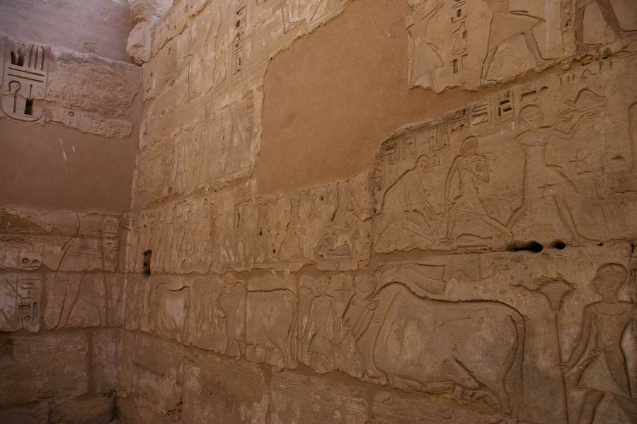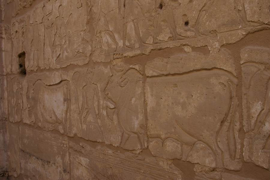 | Offrande des bœufs gras qui sont abattus et dépecés dans le registre supérieur . |