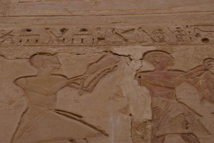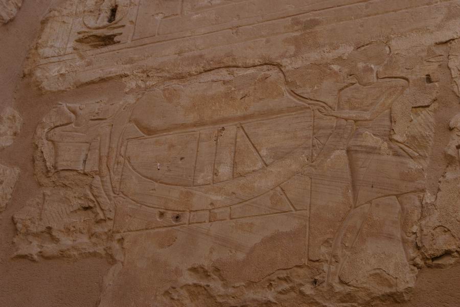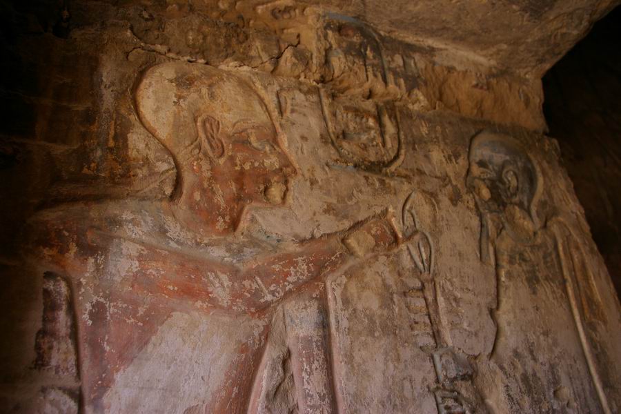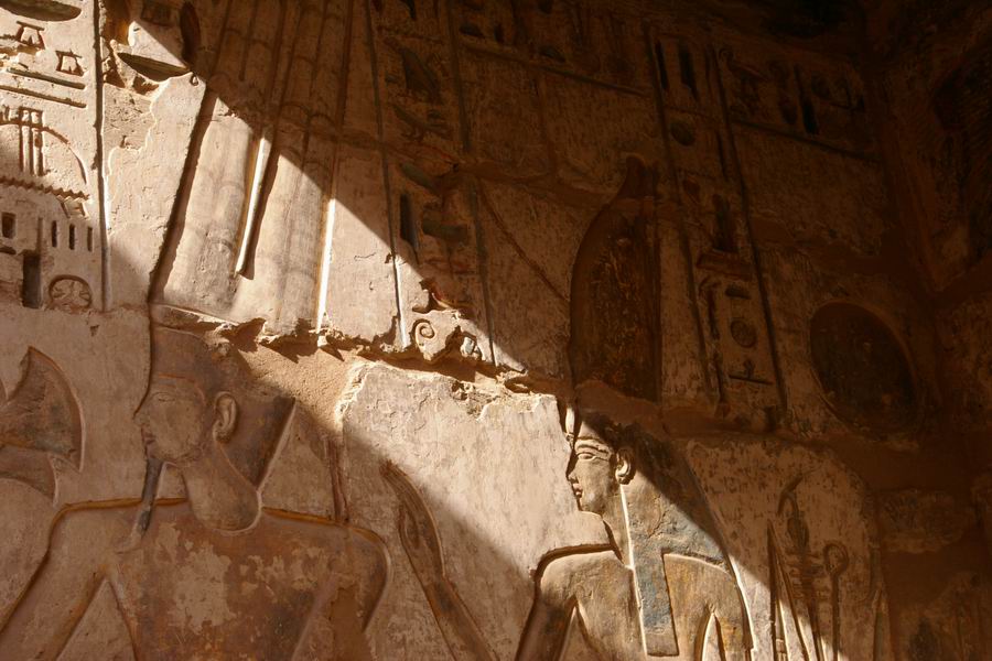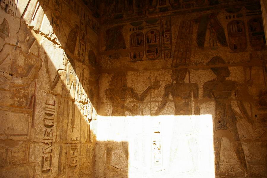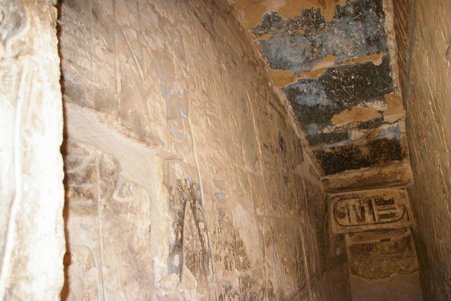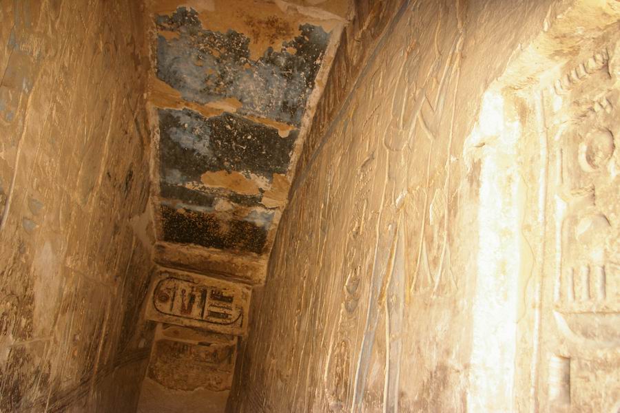 mur du fond. Salle étroite au plafond évoquant le ciel et ses étoiles. A gauche évocation de Hâpy, le flot nourricier. C'est la personnification de la crue de Nil qui devait apporter la prospérité au pays. Représenté comme un homme, le ventre rebondi, les seins généreux, vêtu seulement d'un pagne à lanières de cuir des bateliers. Il porte une coiffure de plantes: des lys pour le "Nil du Sud", des papyrus pour le "Nil du Nord". |