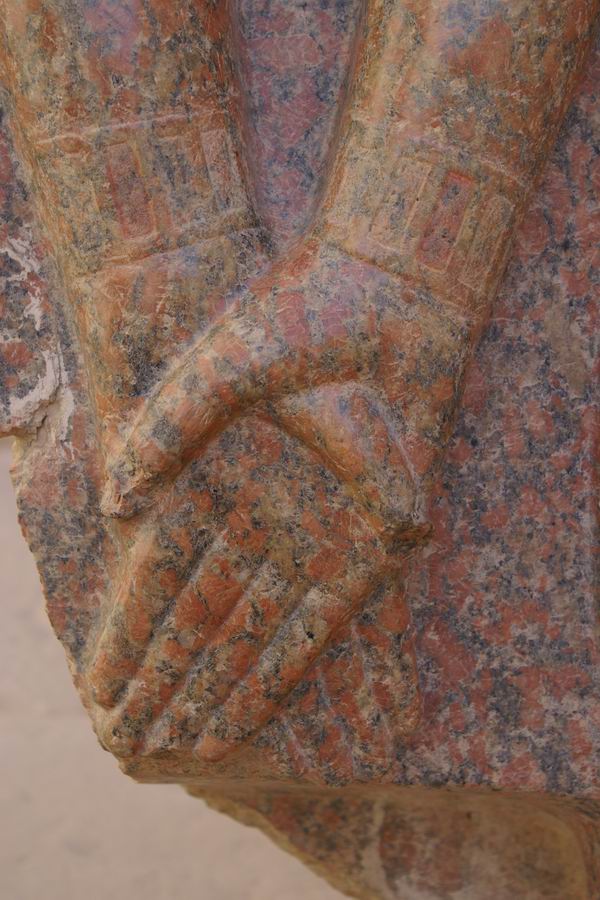 Groupe statuaire en granit. Le roi, au centre, devait-être accompagné du dieu Amon, à gauche et de la déesse Mout, à droite. |