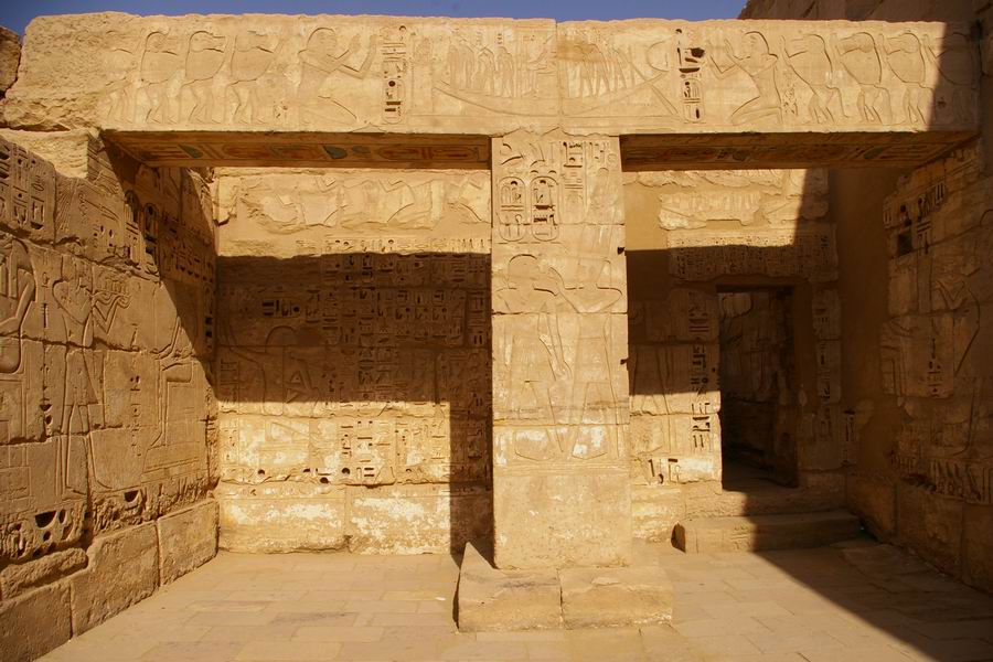 dieu Amon. Sur l'architrave le roi est en adoration devant la barque divine. |