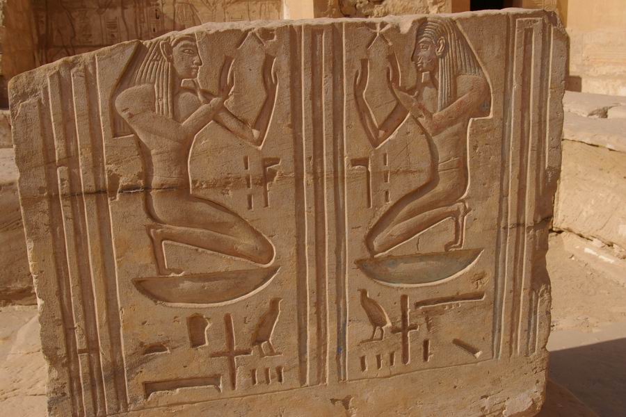 | Deux divinités agenouillées, lèvent les bras en signe d'adoration. |