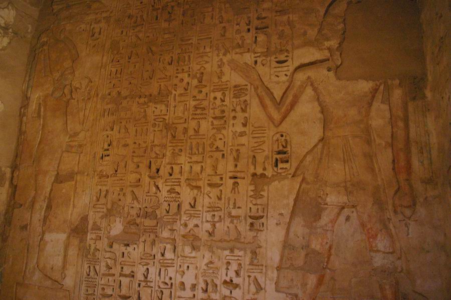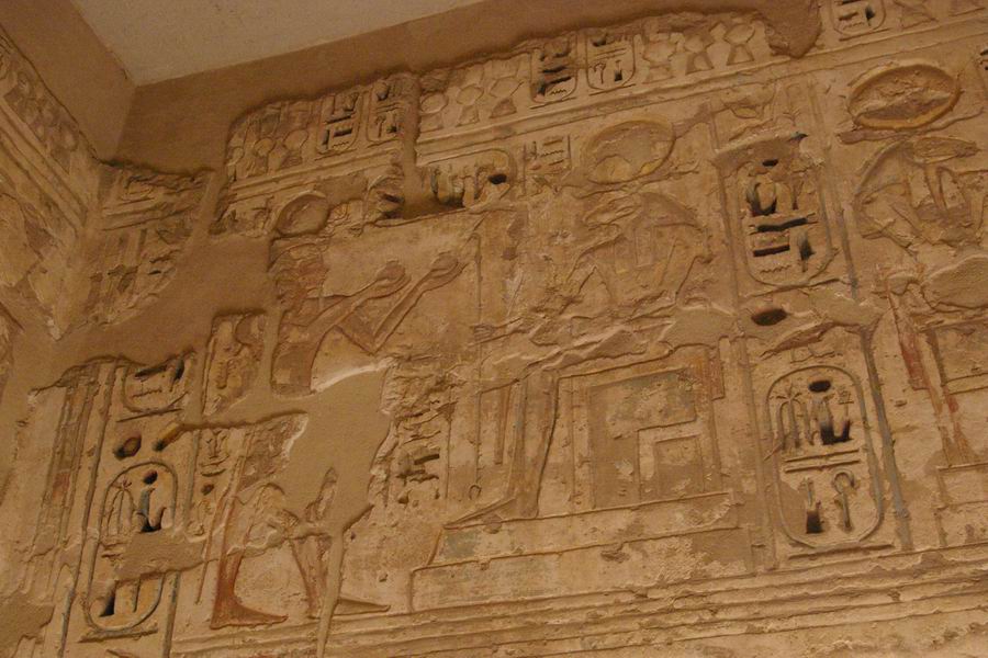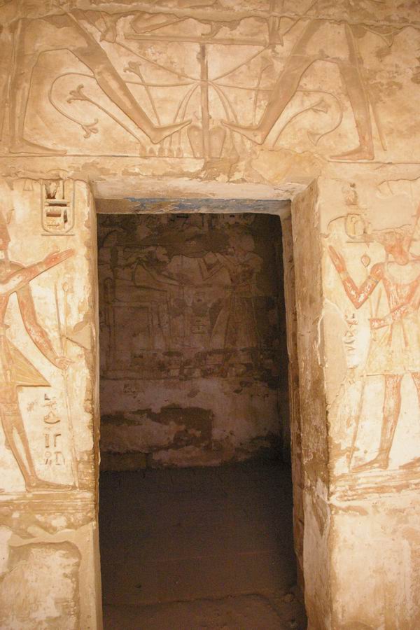 Une chapelle. De part et d'autre de la porte l'on trouve le dieu Thot, à droite, et la déesse Séchat, à gauche. Tous les deux ont un chapelet de "Fêtes Sed". |