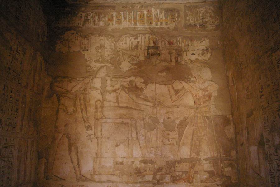 | Le roi et le dieu Osiris sont représentés, deux fois, sur le fond de la chapelle. |