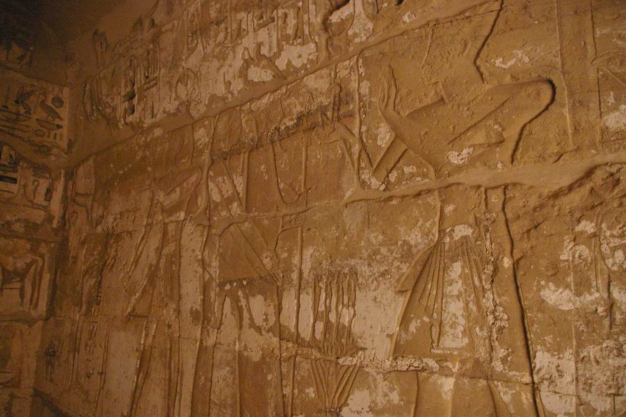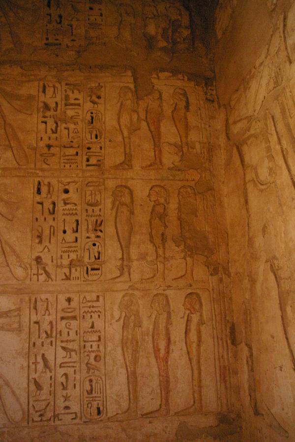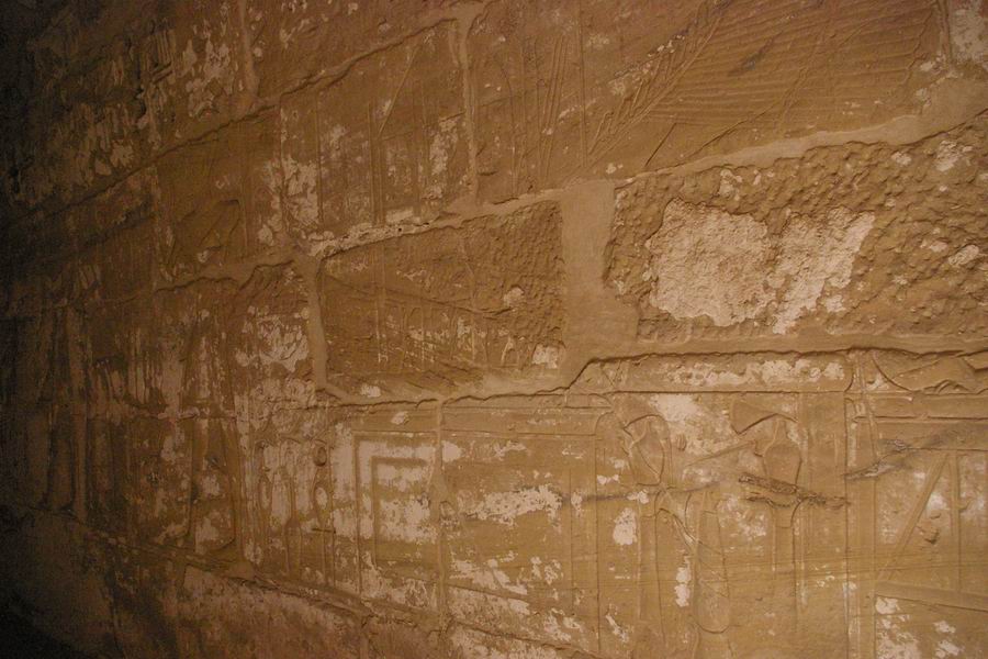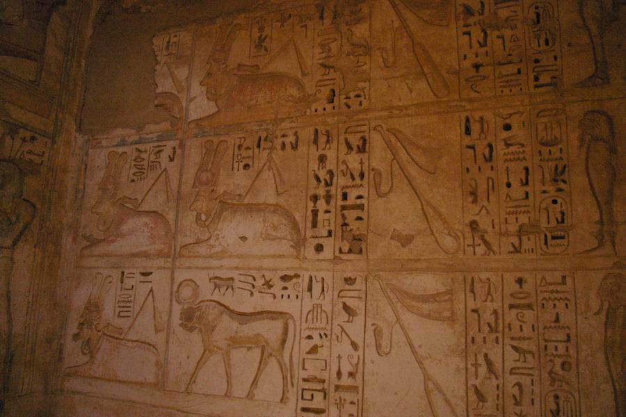 | Le mur du fond de cette salle nous présente des divinités momiformes, des rames, des vaches coiffées du disque solaire et un taureau. |