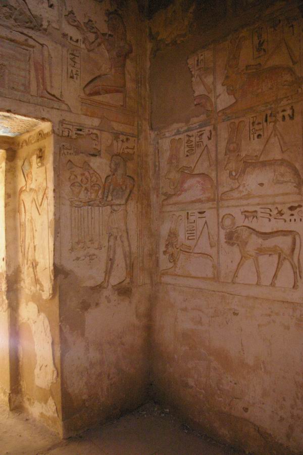 de l'espace. Les vaches, couchées, portent le disque solaire entre les cornes. Le disque est entouré de deux hautes plumes. Un collier menat, qui servait aussi d'instrument de musique, embellit le cou des vaches. Le flagellum est présenté sur le dos des sept bovidés. Sept vaches et un taureau terminent la décoration de ce pan de mur. Le nombre sept, où des multiples, est souvent mentionné dans les textes et les figurations de l'au-delà. Sept portes seront à franchir ainsi que 21 buttes ...etc. Le nombre sept, et ses multiples, sont probablement à relier aux phases de la lune, qui possède un cycle de 28 jours. Le taureau symbolise la puissance, la virilité qui permet la renaissance. Il porte, lui aussi, le disque solaire entre les colonnes. Un taureau était choisi pour représenté le dieu Ptah de Memphis, à sa mort il recevait des funérailles grandioses et son corps, après momification, était enterré à l'intérieur de gigantesque sarcophages dans le Serapeum de Memphis. |