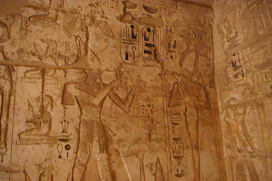 Osiris sont représentés, deux fois, sur le fond de la chapelle. Sur le mur de gauche le roi accomplit une fumigation et une libation au dieu Osiris. |