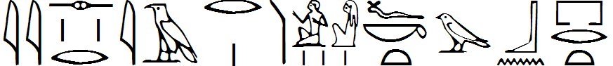 Cartouches du pharaon Merenptah. A gauche, le cartouche le plus bas, contient sont nom de naissance : Mer-en-Ptah hetep Maât, l'aimé de Ptah, qui satisfait Maât. Au-dessus son nom de couronnement : Ba-en-Rê mery en Imen, le Ba de Rê, aimé d'Amon. |