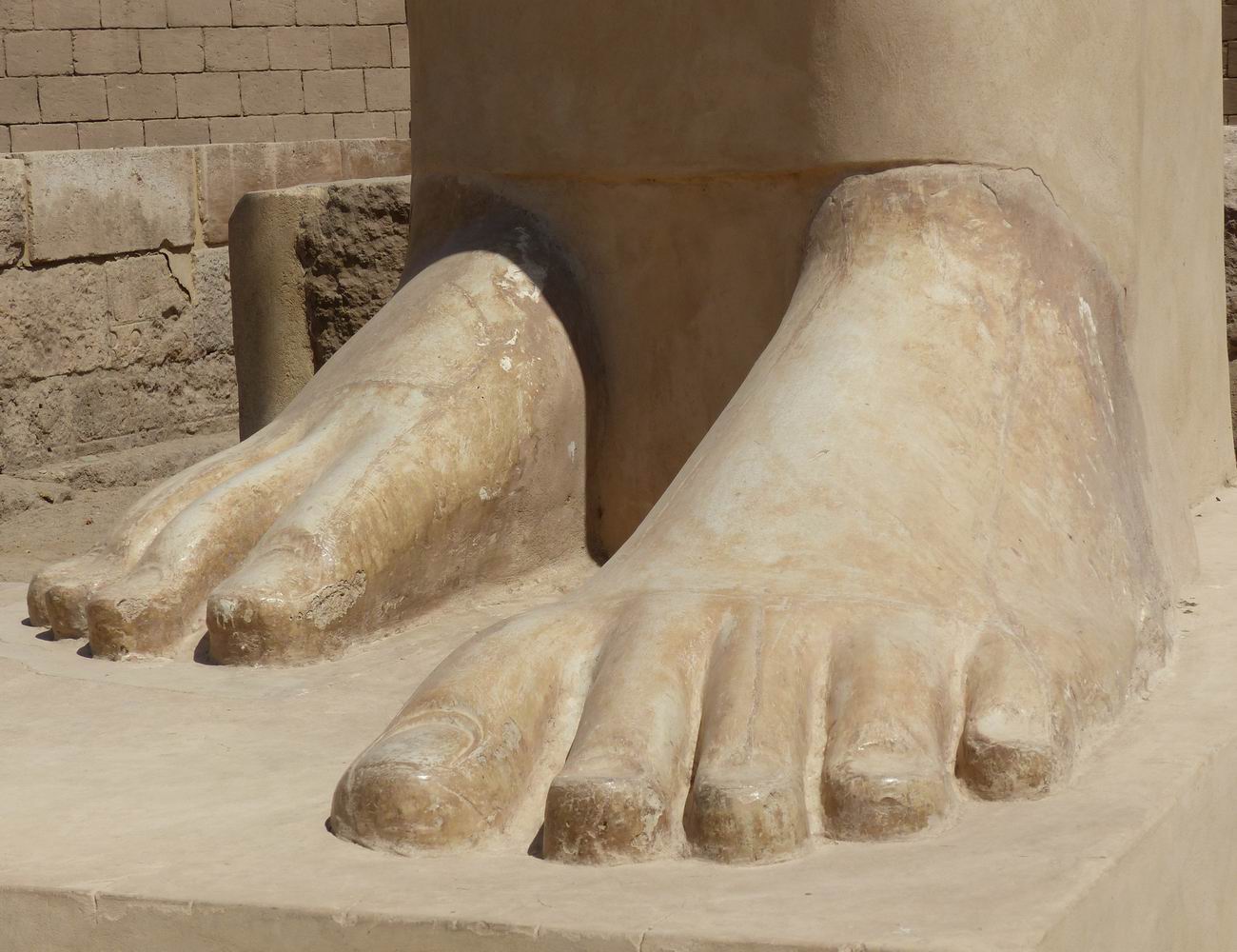 | Détail des pieds de Merytamon qui est dans le sens de la marche avec son pied gauche en avant. | ||