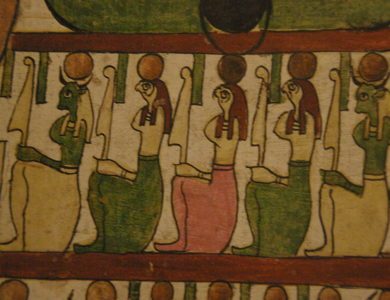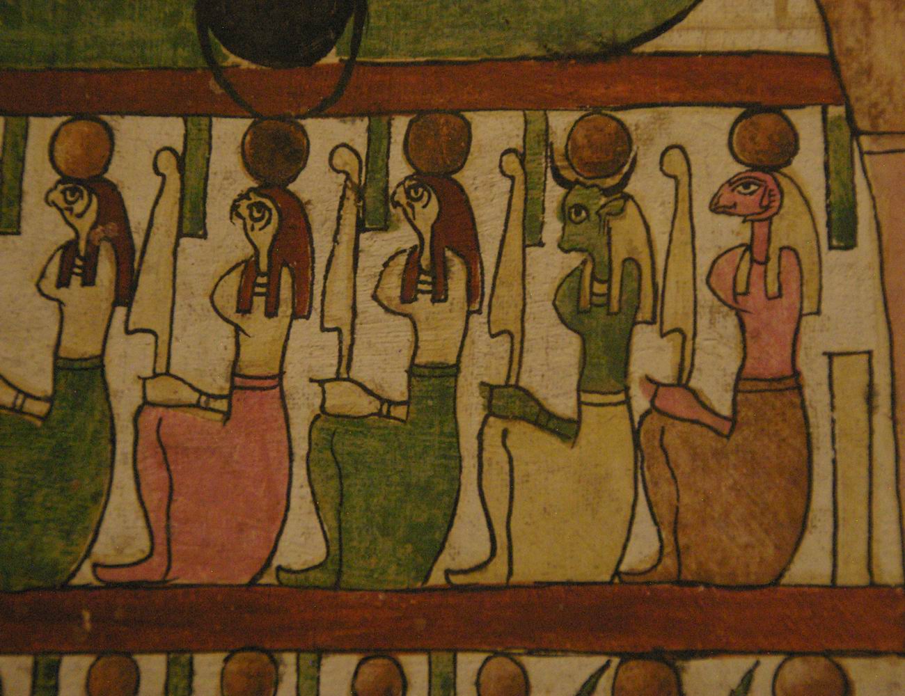 | 6 divinités : 2 à tête de taureau, 3 à tête de faucon et une à tête de bélier. |