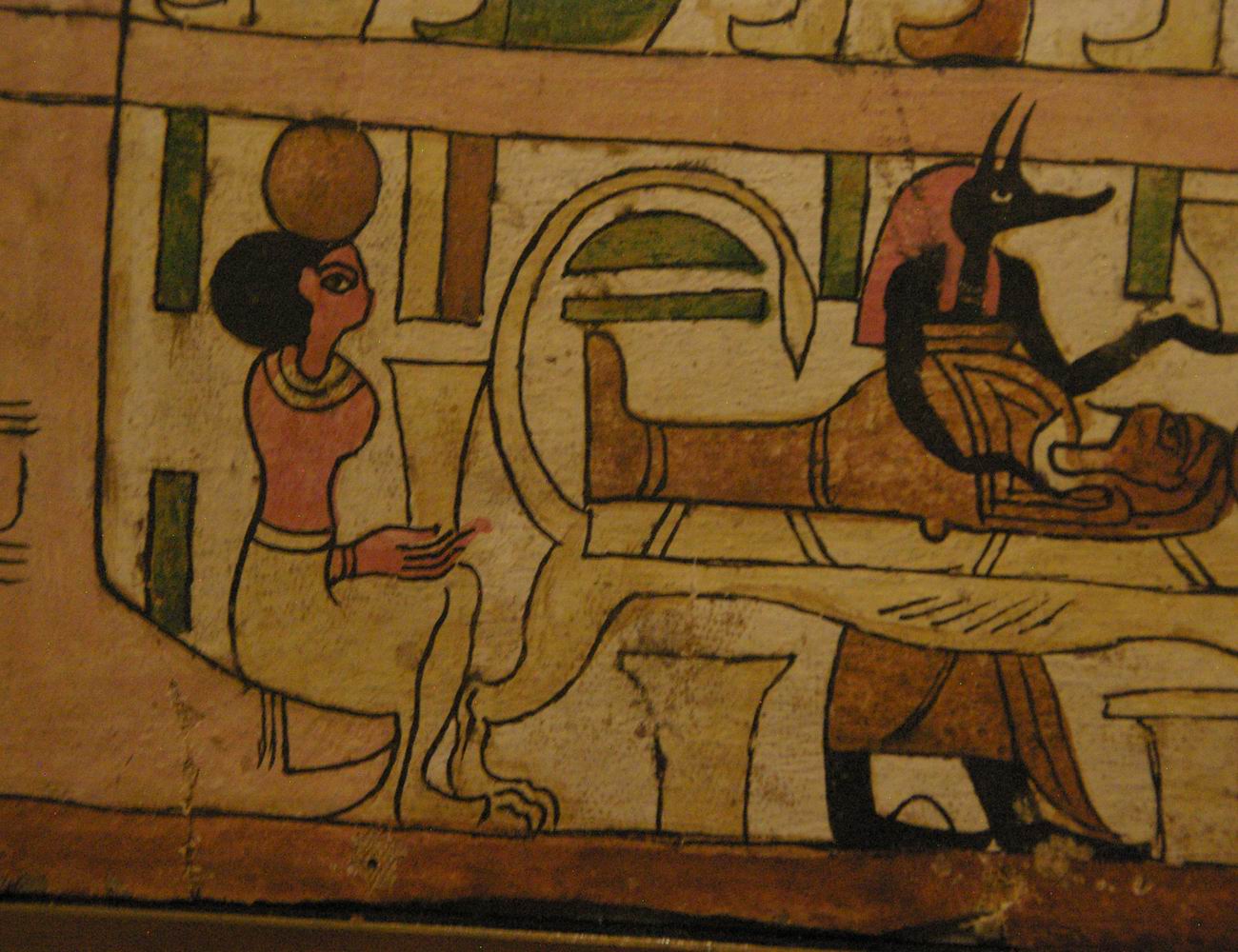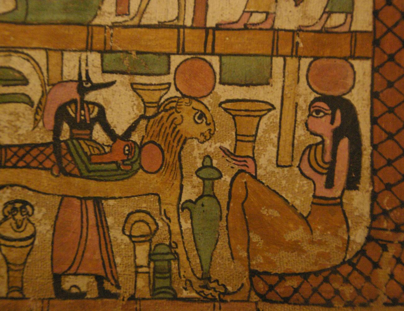 | Le défunt est couché sur un lit funéraire léonin, il est momifié par Anubis. |