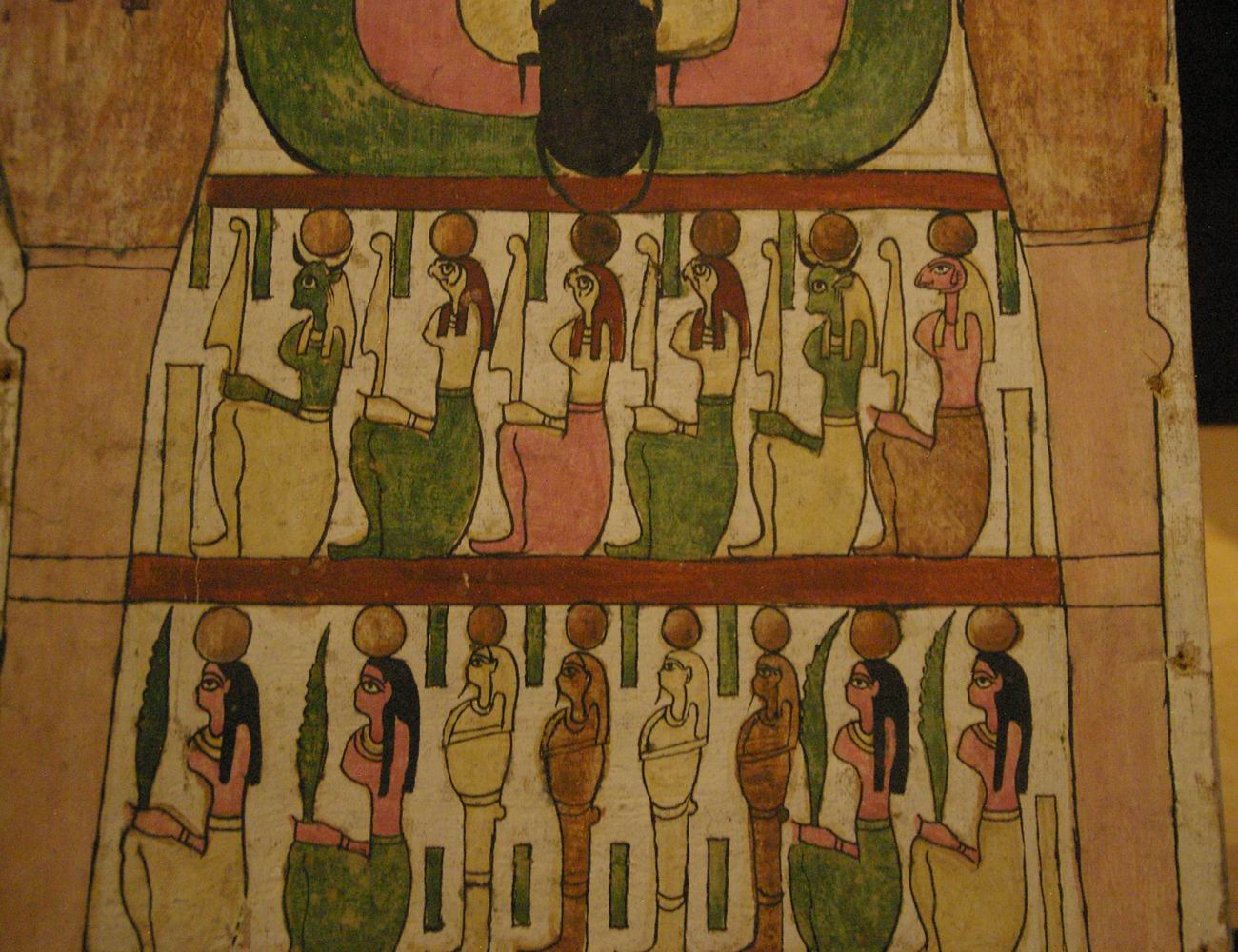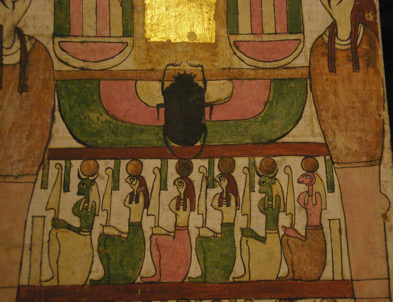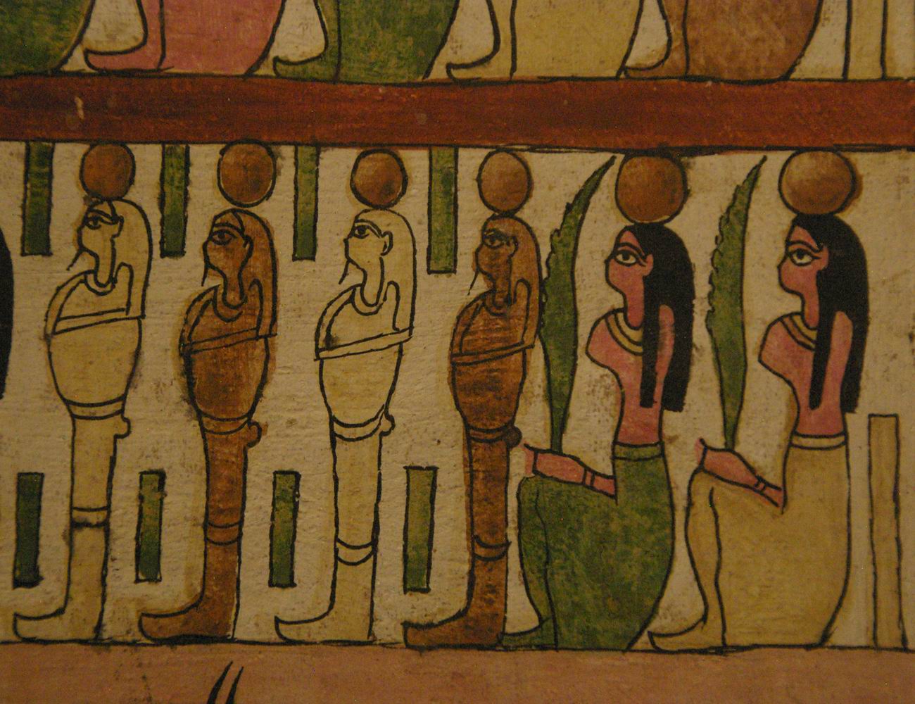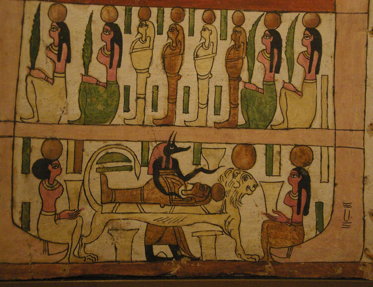 registre du haut présente des divinités. Le registre médian nous montre quatre déesses qui encadrent les vases canopes. Le registre du bas est lié à la scène de la momification. |