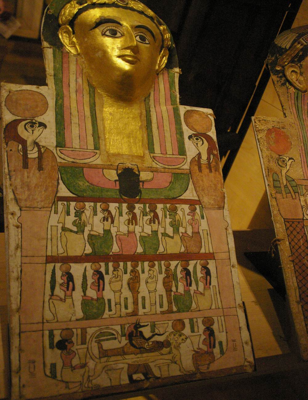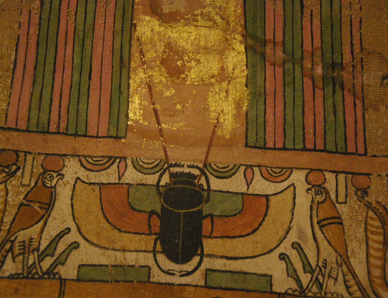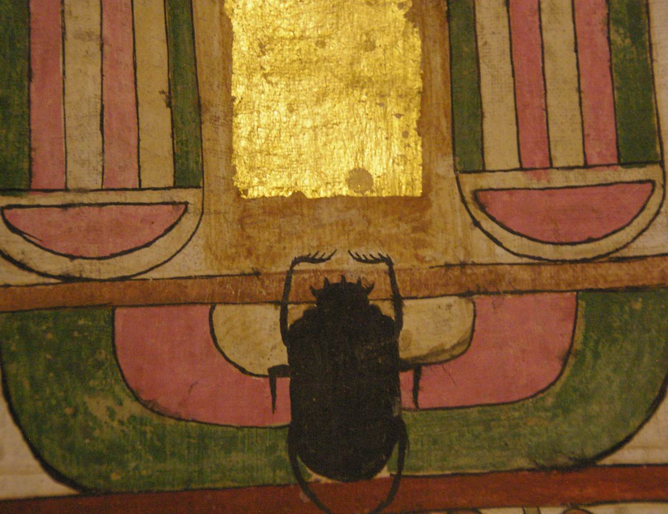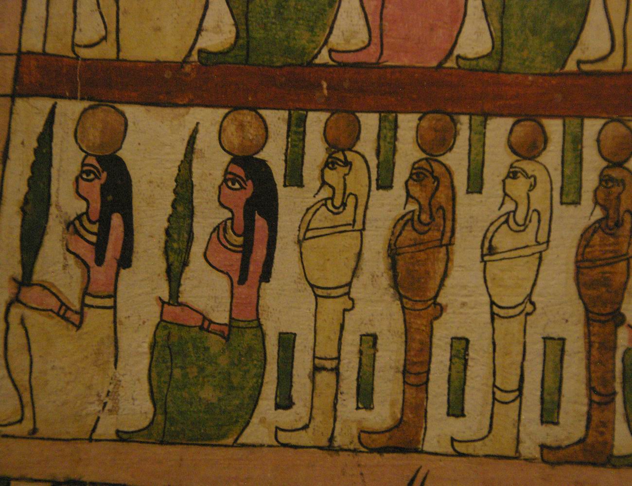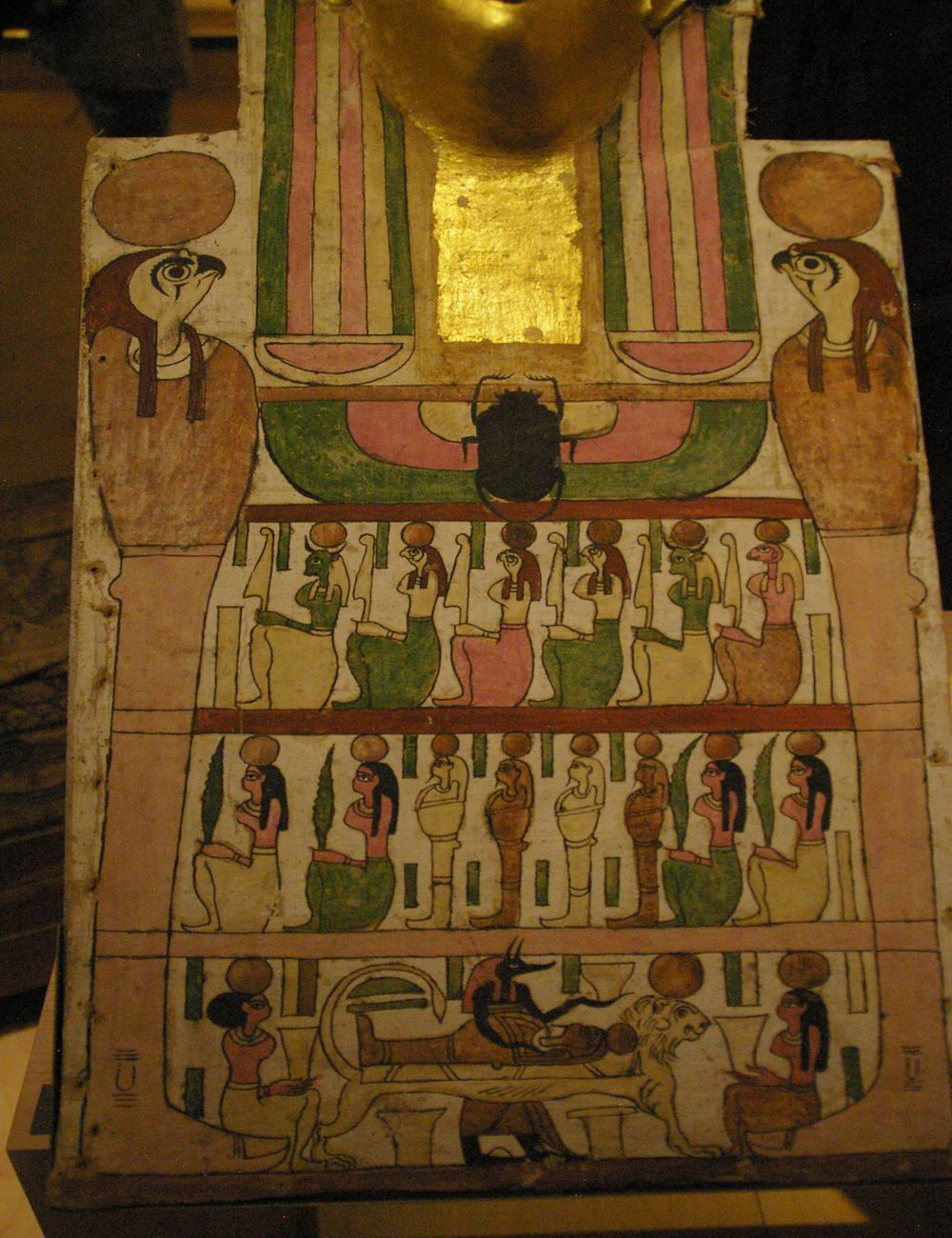 registre du haut présente des divinités. Le registre médian nous montre quatre déesses qui encadrent les vases canopes. Le registre du bas est lié à la scène de la momification. |