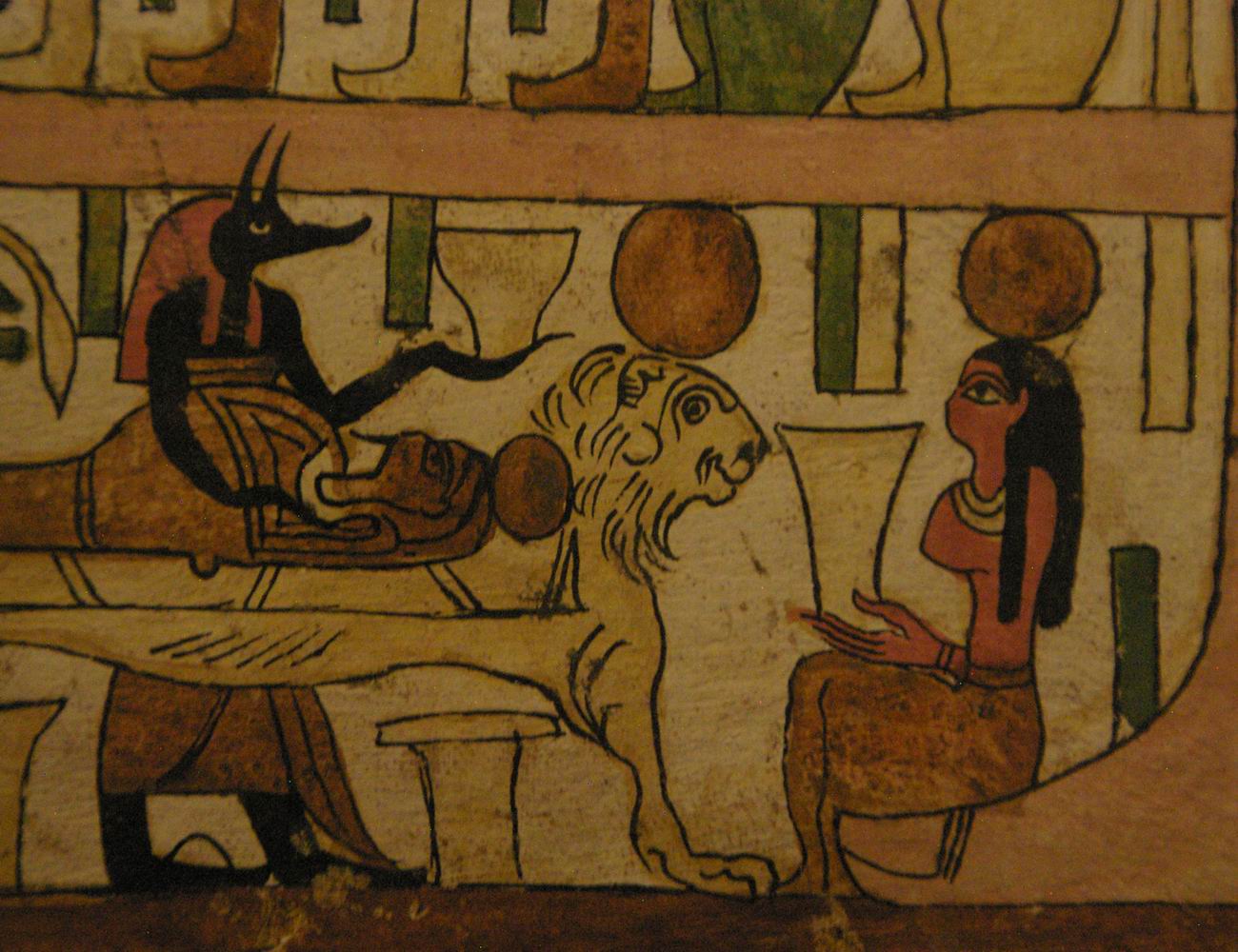 | Le défunt est coiffé d'un disque solaire, ainsi que le lion. |