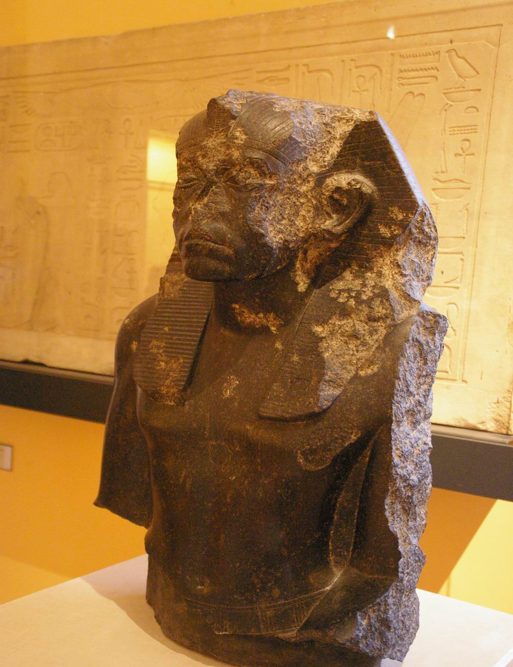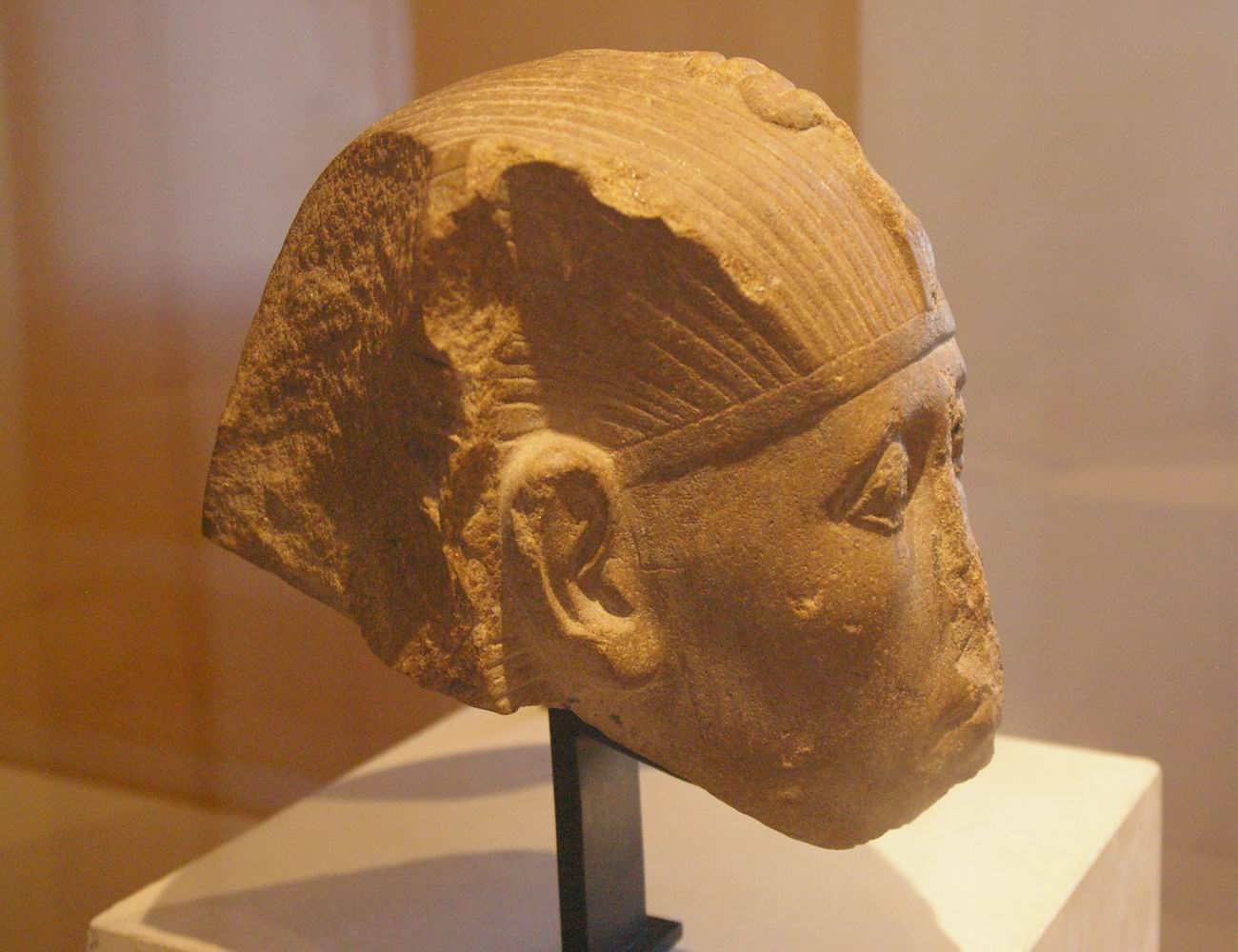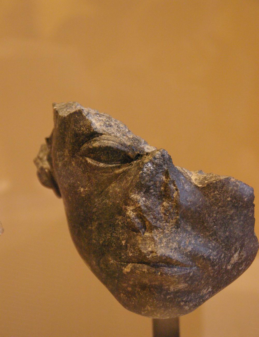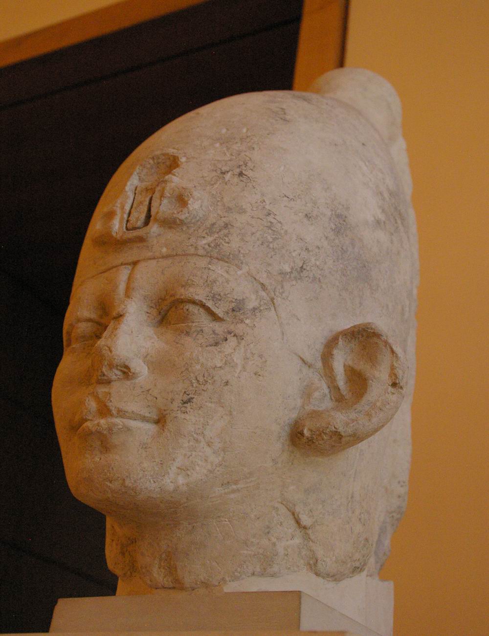 | Les fouilles menées par le musée du Louvre et l'I.F.A.O de 1925 à 1940 sur le site de Médamoud, à quelques kilomètres au Nord de Karnak, ont largement contribuées à révéler ce personnage. Lors du partage des fouilles, le Louvre obtint ce fragment de statue et une statue représentant le souverain assis sur un siège cubique. La statue complète représente le roi dans la force de sa jeunesse, tandis que le fragment très mutilé nous montre un roi qui semble inquiet, amer, fatigué, et vieillissant. Or, les conventions canoniques veulent que le pharaon soit toujours figuré dans le force de l'âge, détendu et paisible. Le roi a souhaité se faire représenter fatigué, usé par les épreuves du temps et du pouvoir. Ce portrait réaliste, ressemblant, montre la maturité des traits auxquels on arrive avec les années. C'est aussi une façon d'attirer l'attention sur la longévité de son règne et d'insister sur l'énergie qu'il y a consacré. | ||