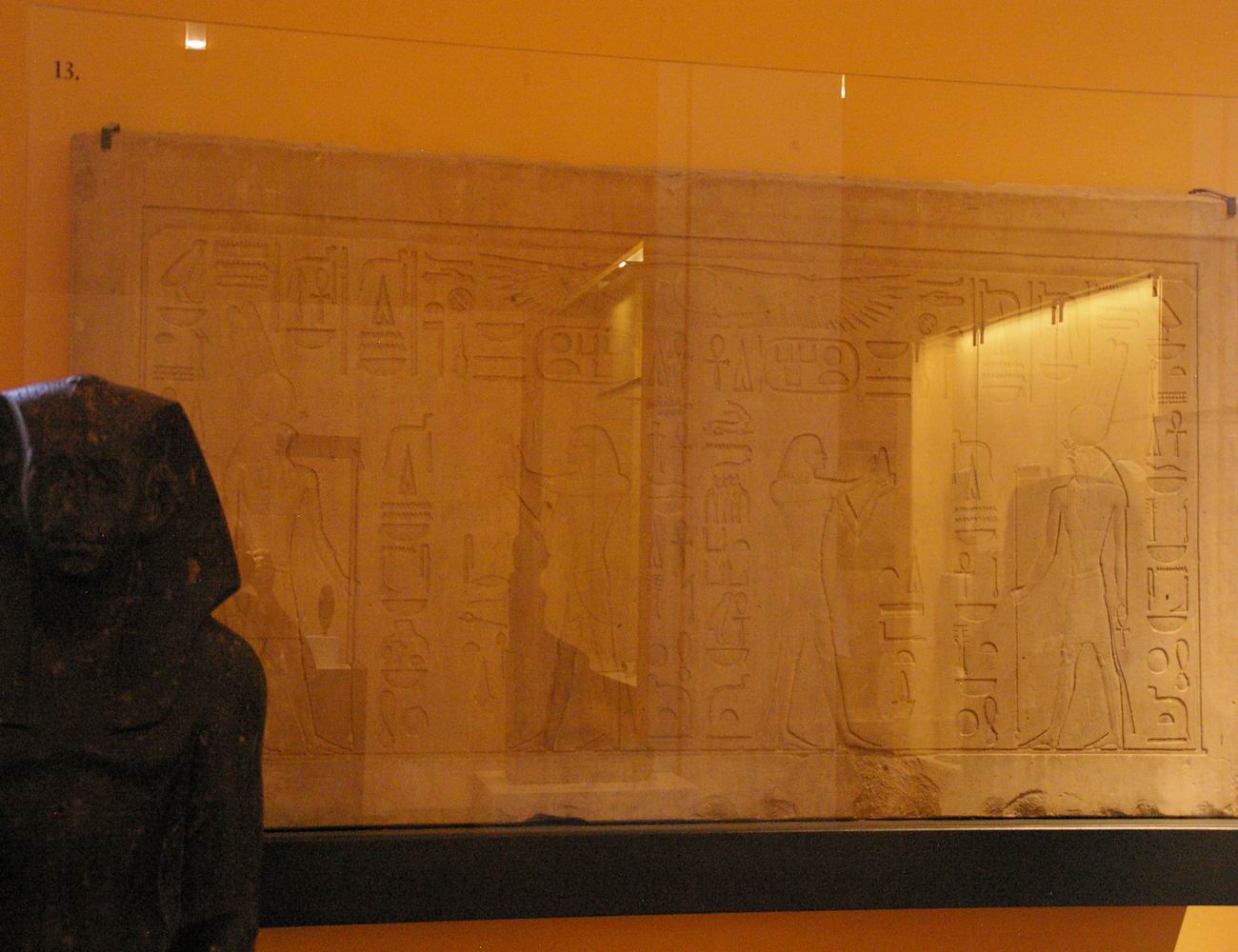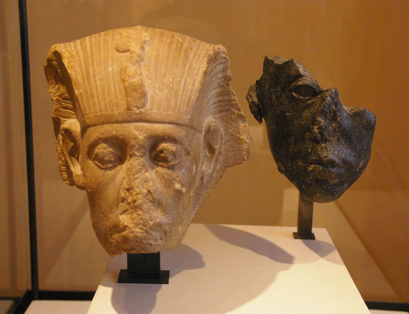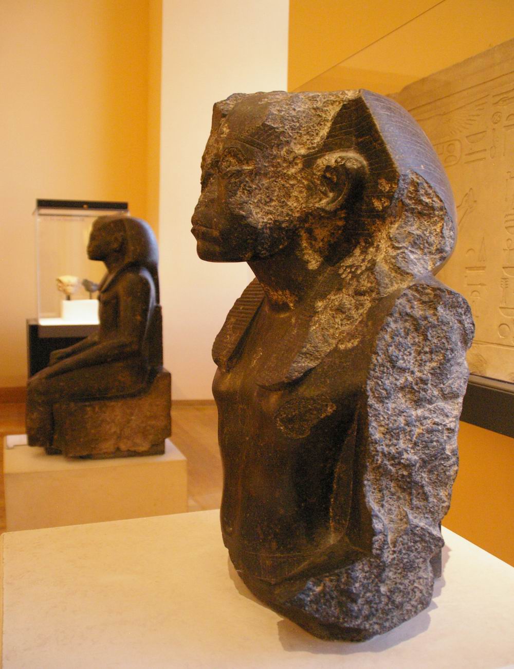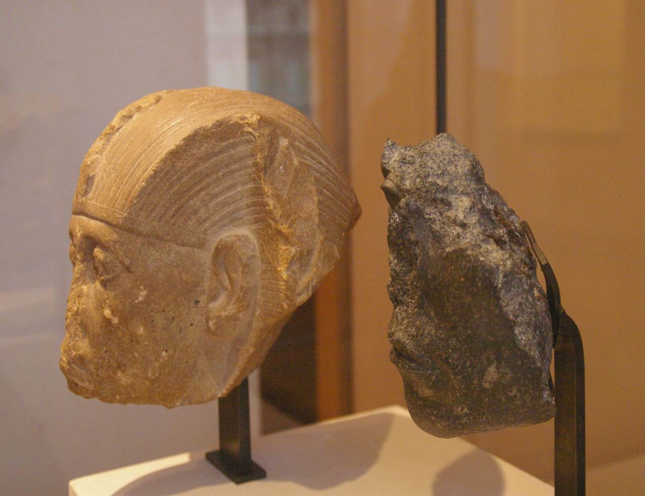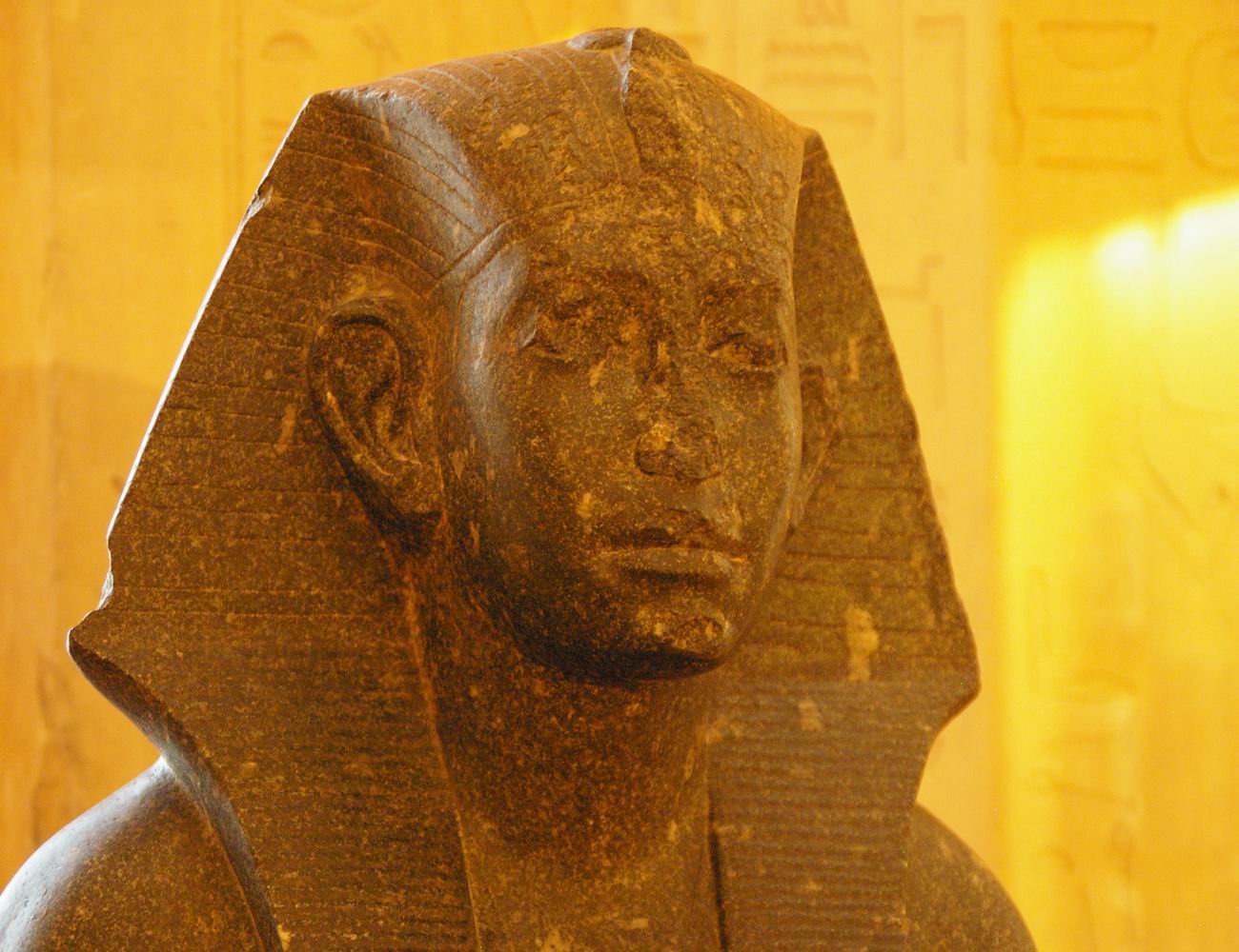| Les fouilles menées par le musée du Louvre et l'I.F.A.O de 1925 à 1940 sur le site de Médamoud, à quelques kilomètres au Nord de Karnak, ont largement contribuées à révéler ce personnage. Lors du partage des fouilles, le Louvre obtint ce fragment de statue et une statue représentant le souverain assis sur un siège cubique. La statue complète représente le roi dans la force de sa jeunesse, tandis que le fragment très mutilé nous montre un roi qui semble inquiet, amer, fatigué, et vieillissant. Or, les conventions canoniques veulent que le pharaon soit toujours figuré dans le force de l'âge, détendu et paisible. Le roi a souhaité se faire représenter fatigué, usé par les épreuves du temps et du pouvoir. Ce portrait réaliste, ressemblant, montre la maturité des traits auxquels on arrive avec les années. C'est aussi une façon d'attirer l'attention sur la longévité de son règne et d'insister sur l'énergie qu'il y a consacré. | ||