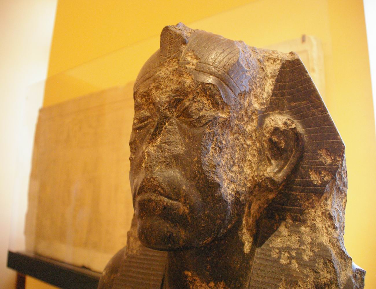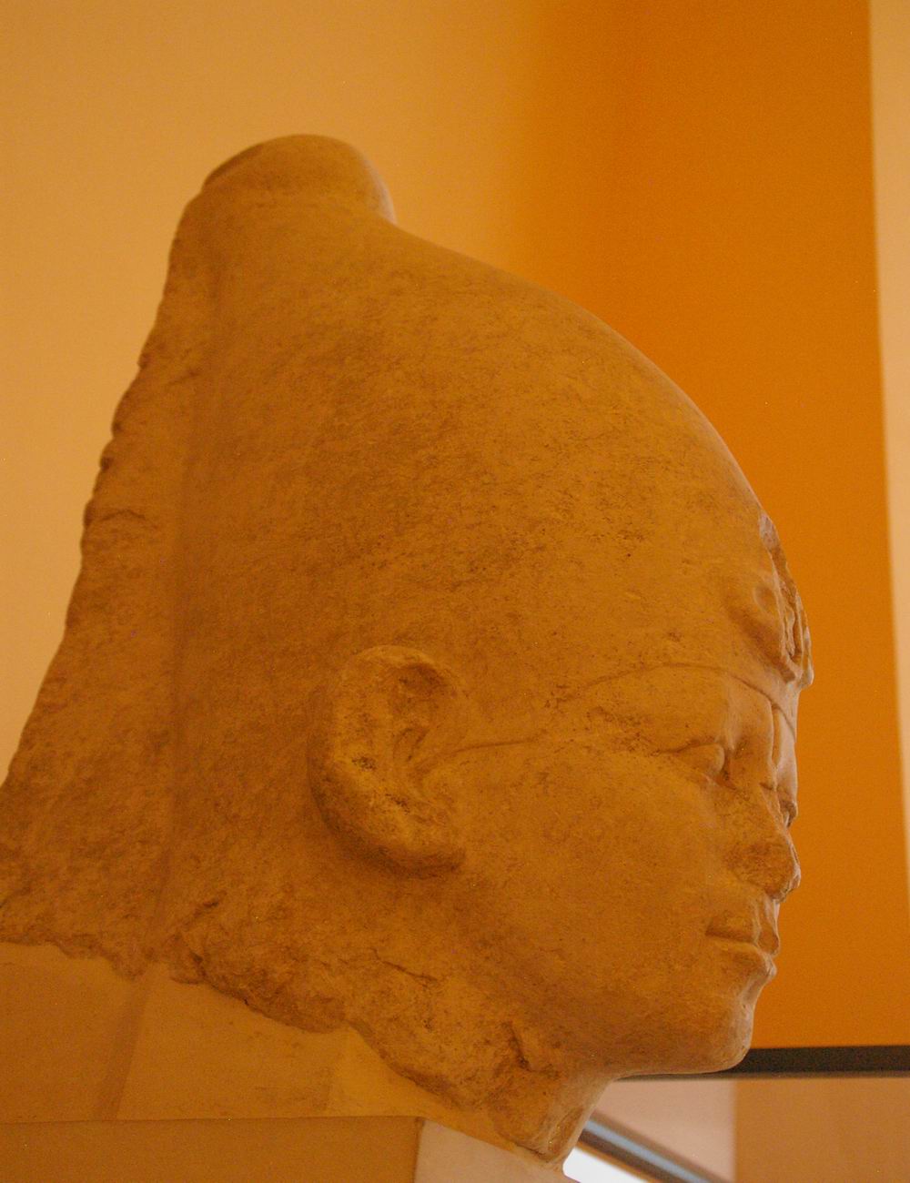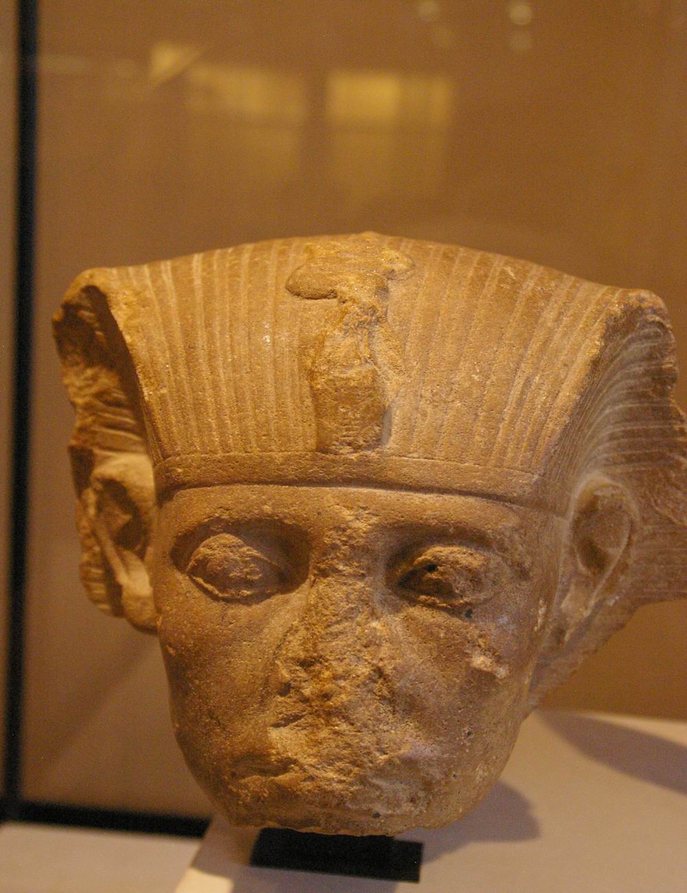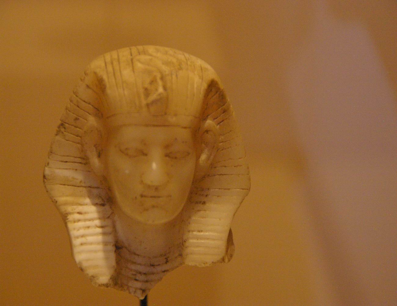 profonde de 7,9 cm. Cette petite tête, sculptée dans un albâtre (calcite) jaune et translucide, a été attribuée au pharaon Amenemhat III, successeur de Sésostris III. Sur le front se dressait un uræus qui a malheureusement perdu sa tête. Le roi porte le némès qui laisse apparaître ses oreilles. L'arrière de la tête et la retombée du némès indiquent l'amorce d'un corps de lion, car cette statue était en fait un petit sphinx. |