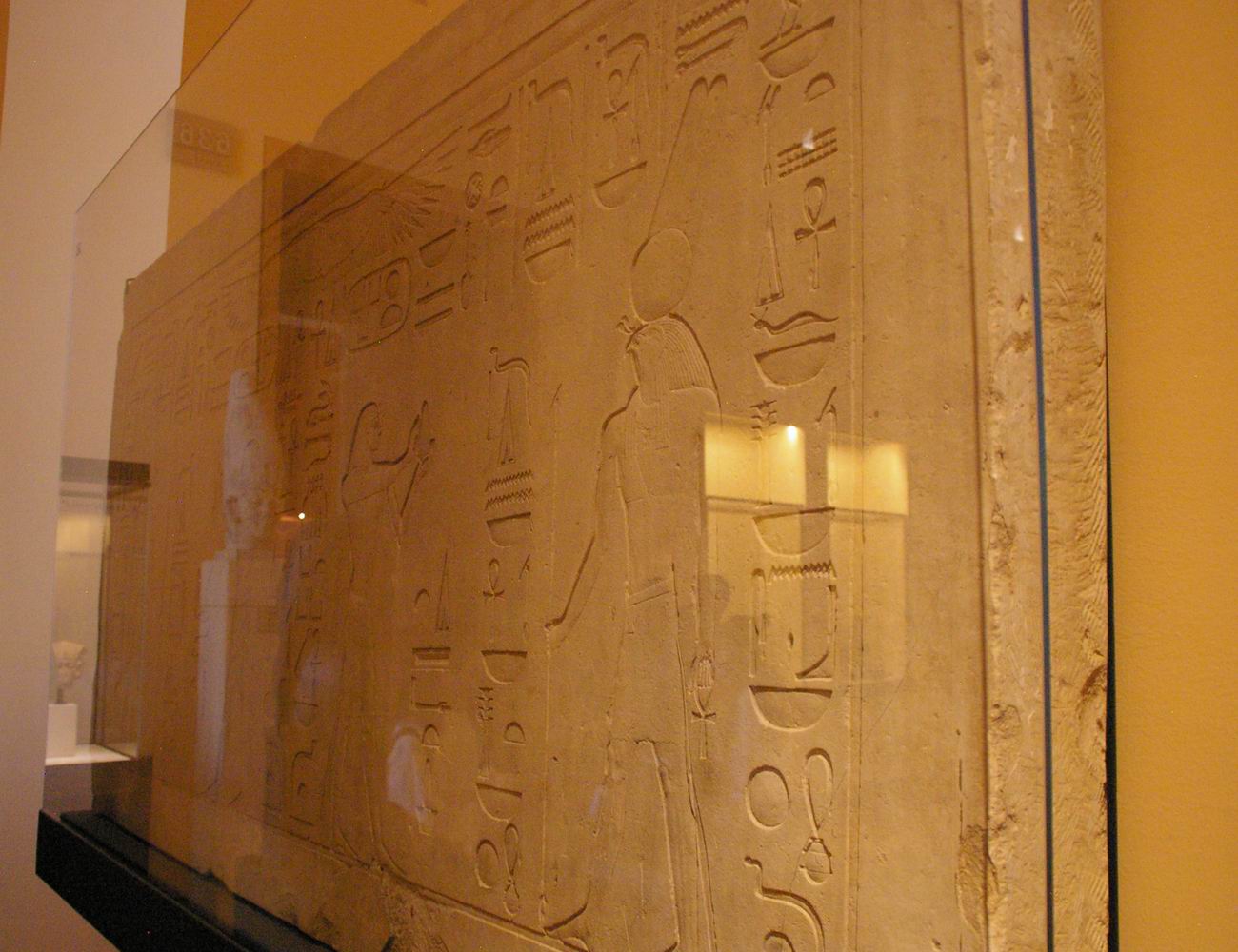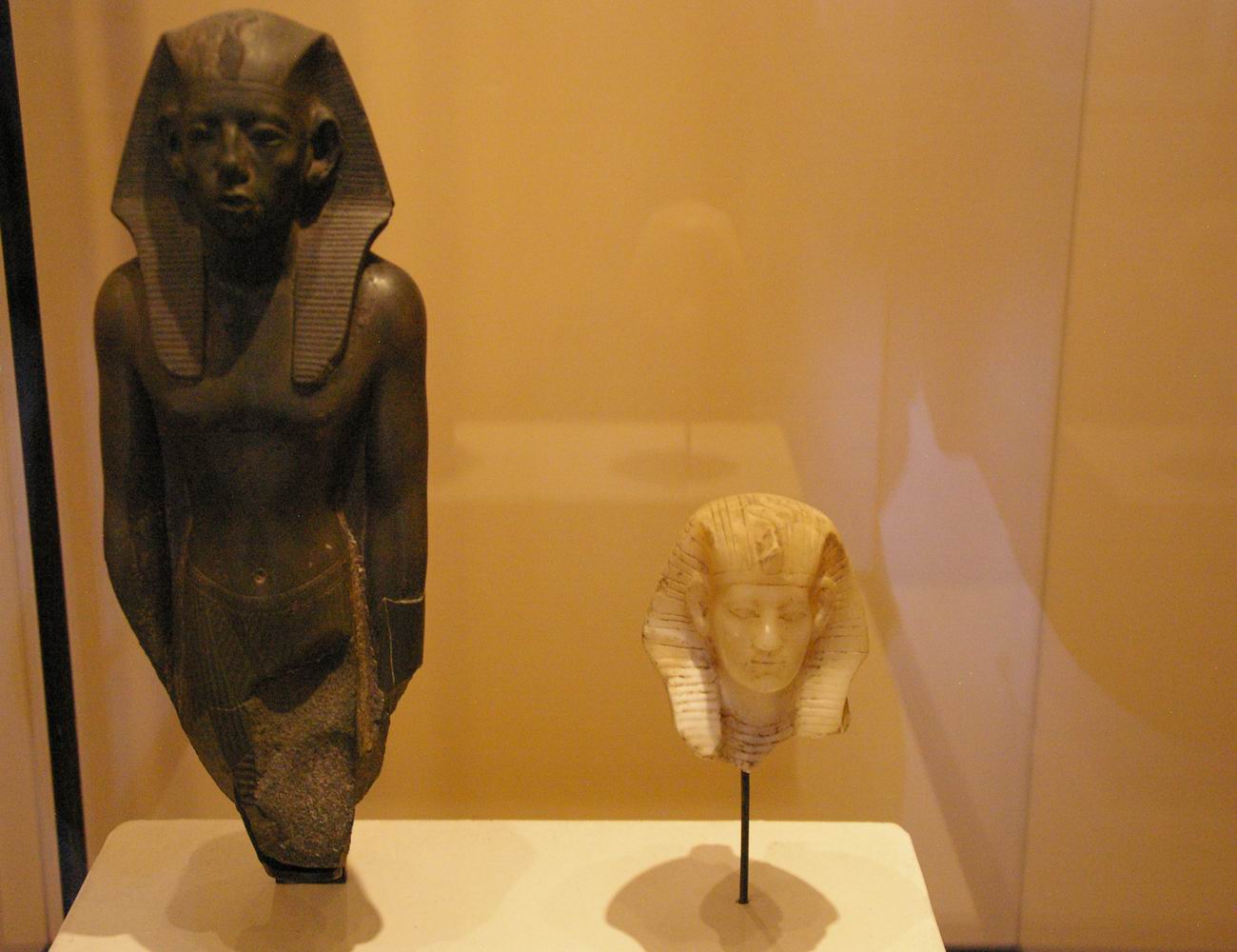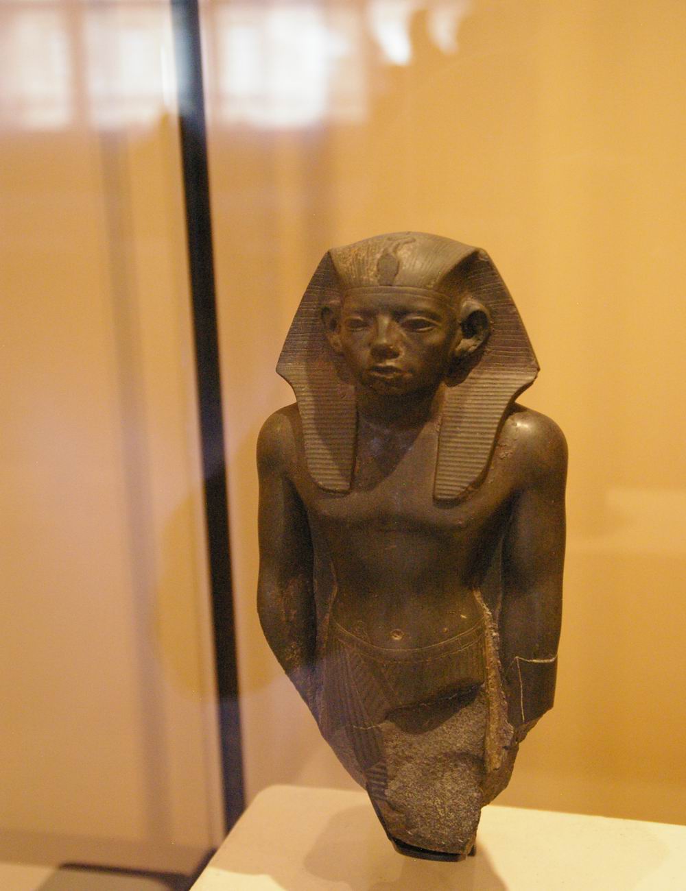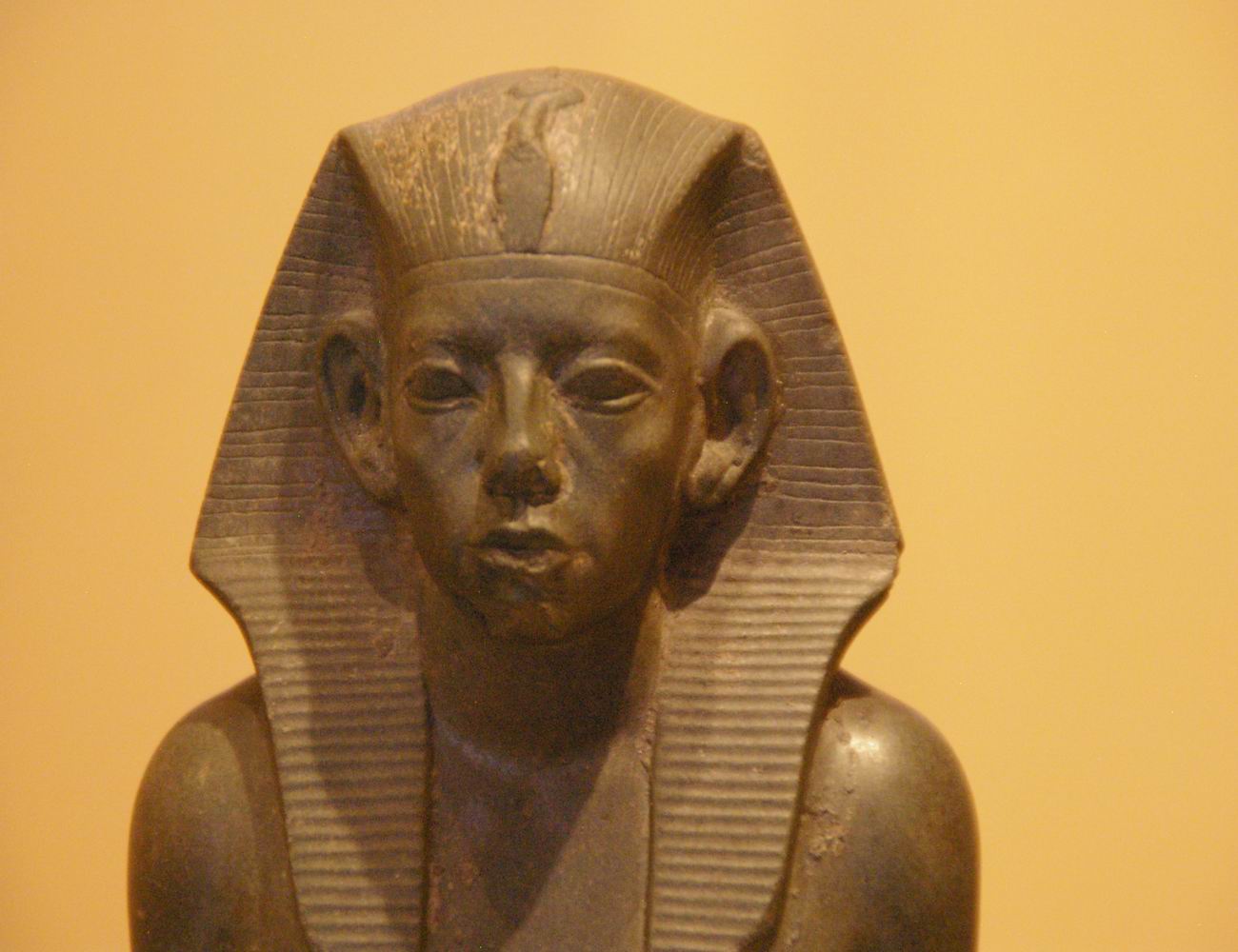 profonde de 7,9 cm. Cette petite tête, sculptée dans un albâtre (calcite) jaune et translucide, a été attribuée au pharaon Amenemhat III, successeur de Sésostris III. Sur le front se dressait un uræus qui a malheureusement perdu sa tête. Le roi porte le némès qui laisse apparaître ses oreilles. L'arrière de la tête et la retombée du némès indiquent l'amorce d'un corps de lion, car cette statue était en fait un petit sphinx. |