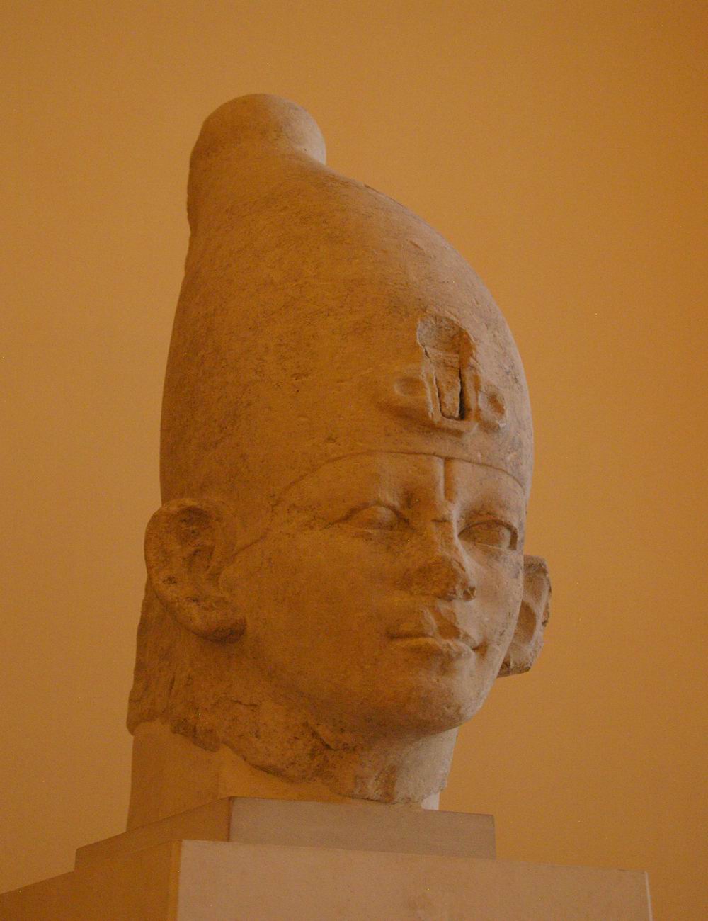 | Tête d'une statue d'un roi coiffé de la couronne blanche de Haute Egypte. | ||